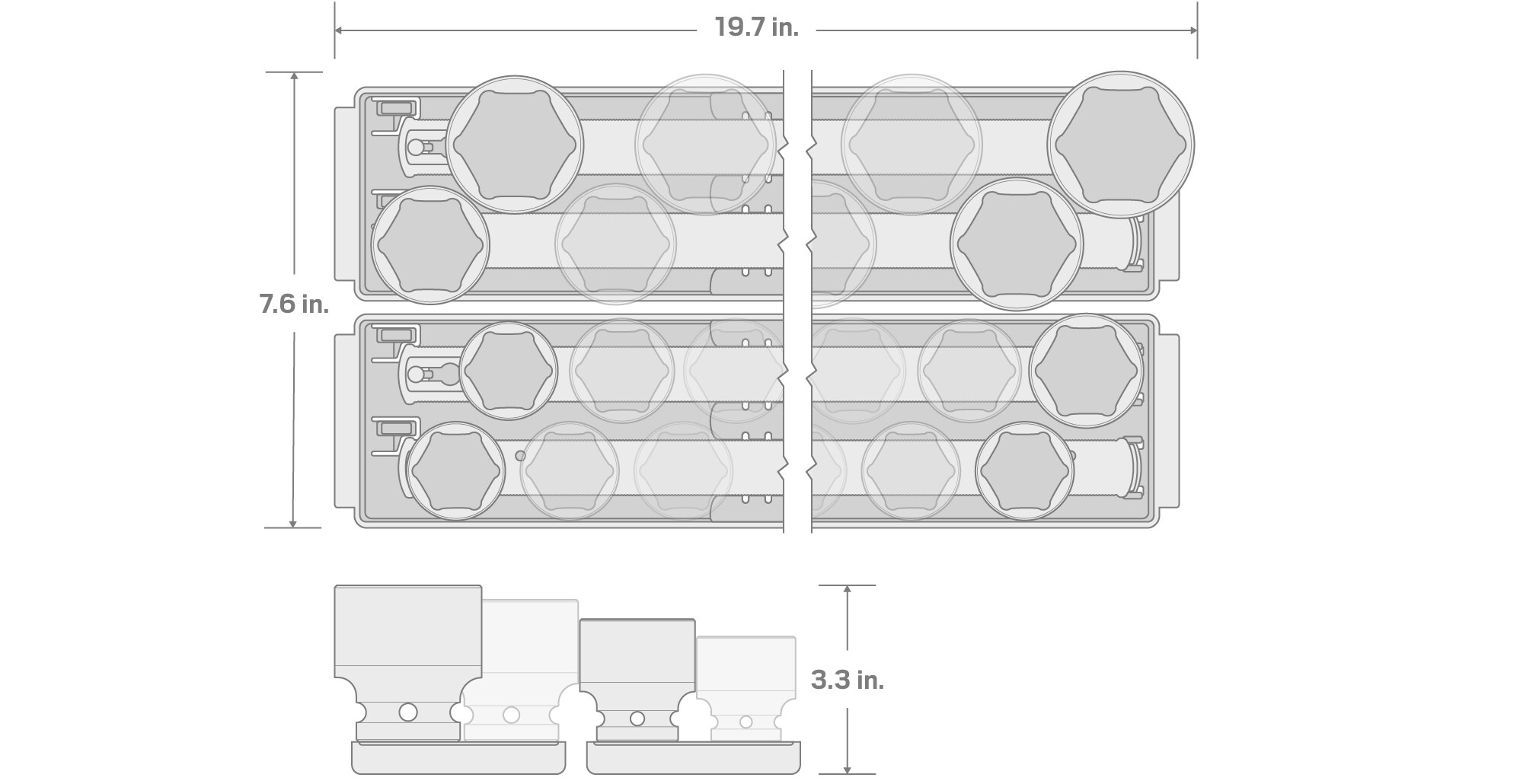Tekton 3/4 inch drive impact sockets have two size markings: a high-visibility laser marking and a permanent stamped marking. While the overall socket is standard length, the interior well extends fully into the socket, which allows for better fastener engagement in more situations. Sockets work with through-hole, friction ring, and detent pin anvils. The ring groove supports use with retaining rings, the smooth walls support use with friction ring anvils, and the through holes support use with pins. Radiused corners prevent fastener round-off by applying force to a fastener’s flat sides, rather than its corners. All of our 3/4 inch drive sockets, extensions, adapters, and reducers are made out of 4140 steel and have a corrosion-resistant manganese phosphate coating. This set includes socket rail organization with twist-to-lock clips.