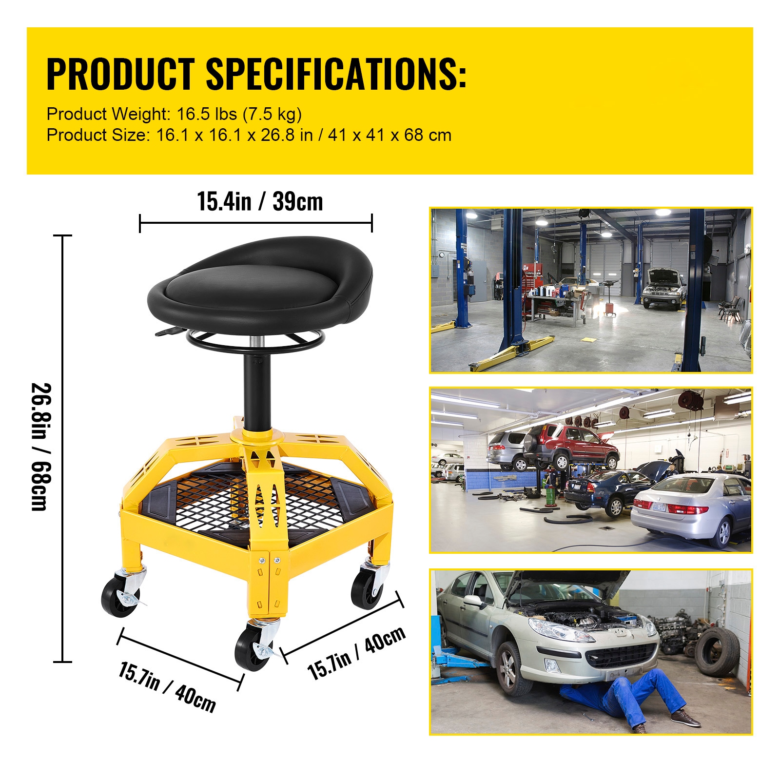 The SVOPES rolling garage stool is built for comfort and versatility, offering an impressive 300 LBS weight capacity; Featuring a 15-inch wide cushioned seat, the stool ensures long-lasting support for extended work sessions; The pneumatic height adjustment allows you to customize the seat between 24 inches (61 cm) and 28.7 inches (73 cm), providing ergonomic flexibility for various tasks; Equipped with a large storage shelf, your tools and equipment are always within reach, keeping your workspace organized; The 3-inch casters are designed for easy movement on different surfaces, and with the two locking brakes, you can secure your stool while you work; Whether you’re in the garage, workshop, or on-site, this stool is the ideal choice for those who value comfort, mobility, and efficiency.