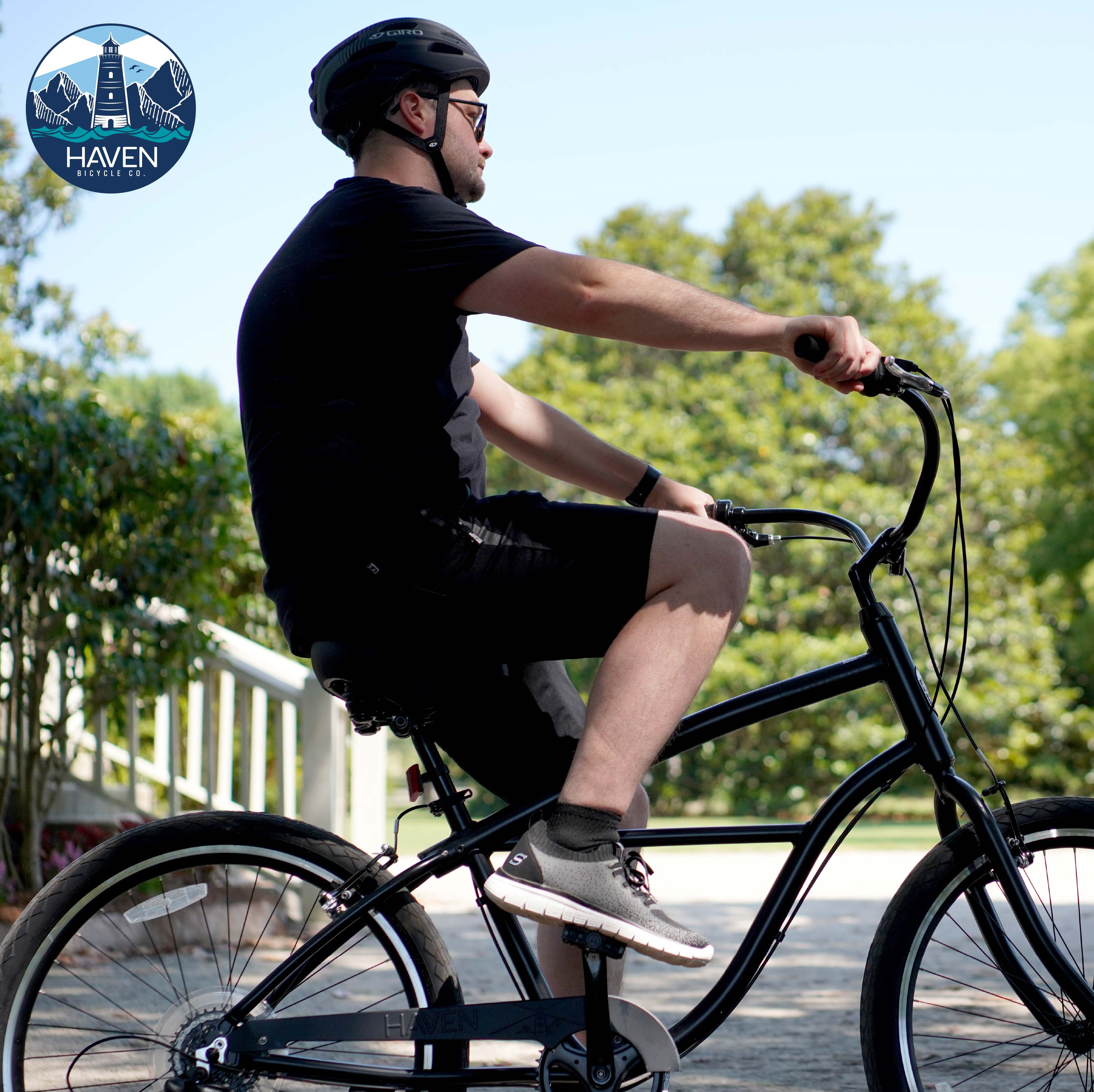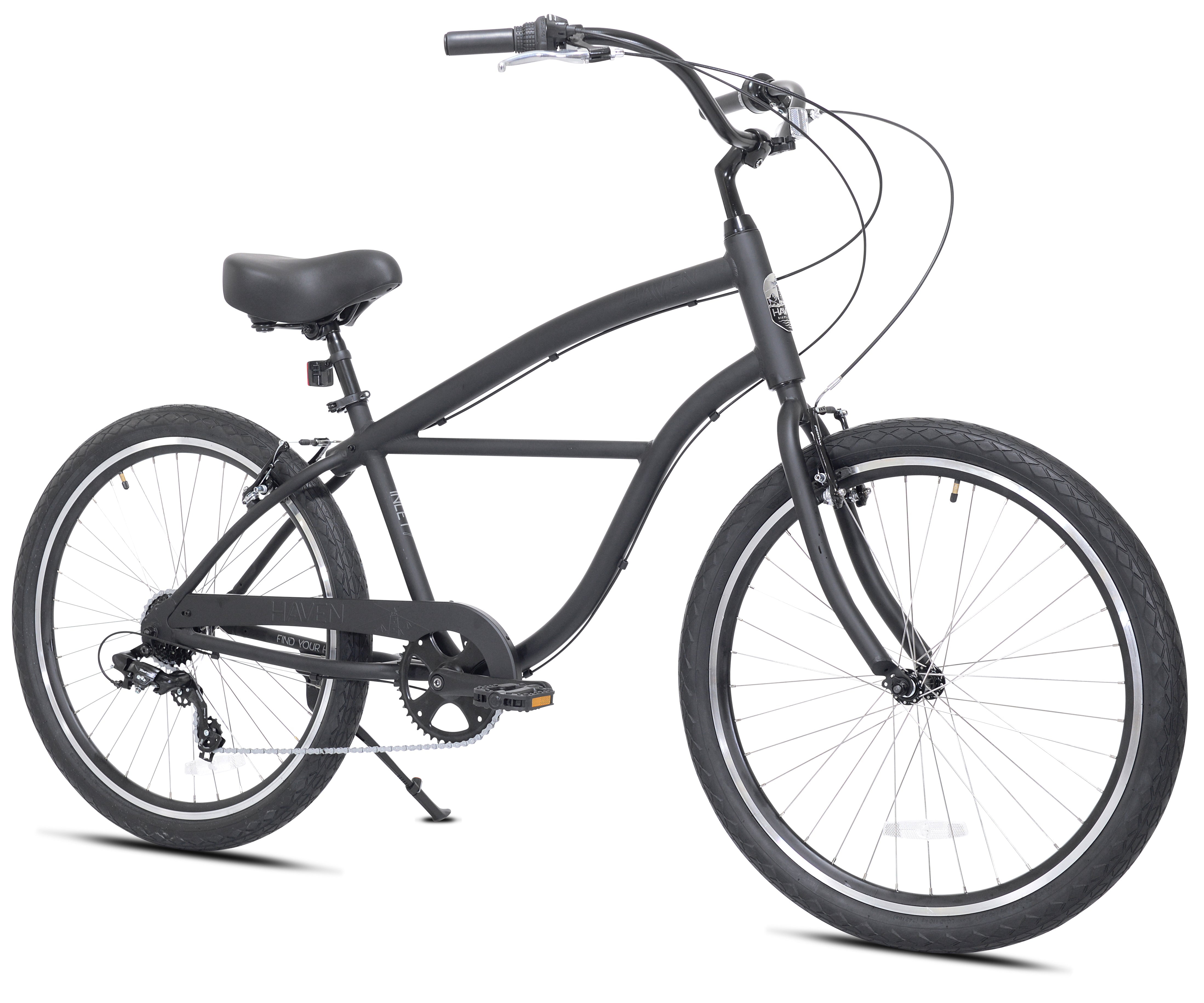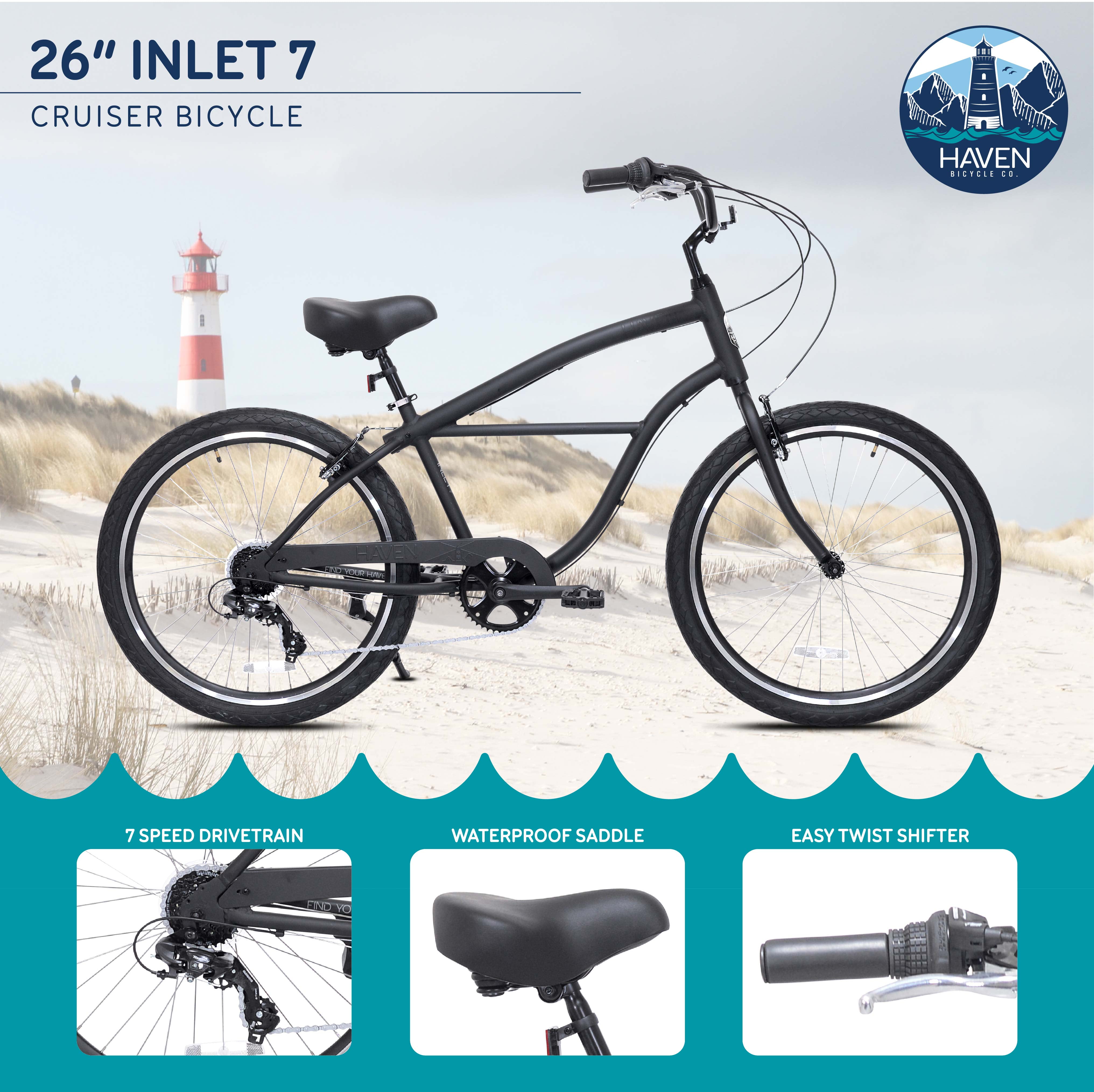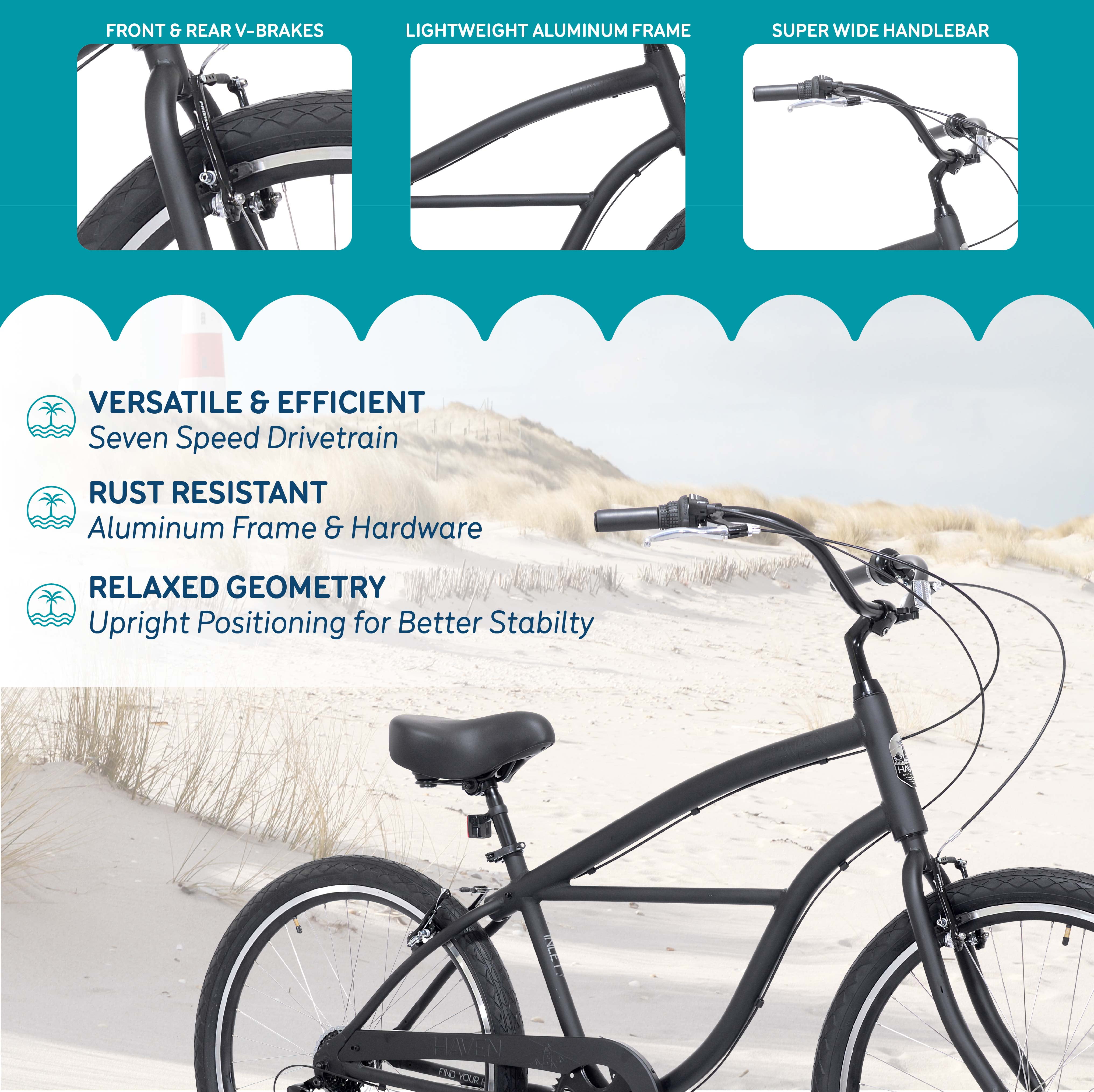 Lightweight rust resistant aluminum frame Front & Rear V-Brakes with Alloy Levers 7 Speed twist Comfort pedals Waterproof cruiser saddle Alloy kickstand Twist grip bell Adult Bicycle Brand: Haven