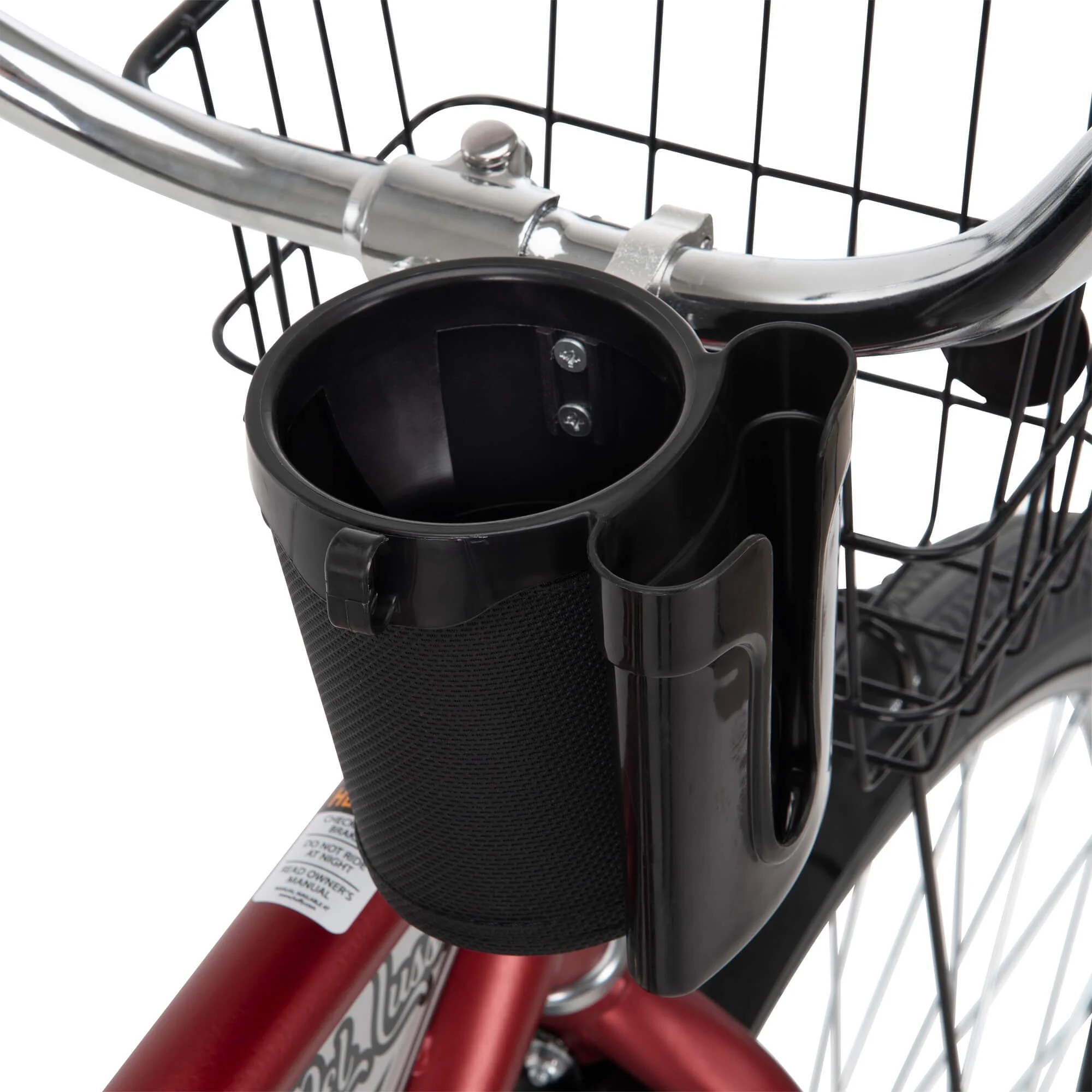 Comfortable: Padded spring saddle offers a smooth, enjoyable ride. Stylish: Red frame with classic cruiser style for timeless charm. Durable: Steel frame ensures lasting performance on flat terrain. Smooth: Coaster brakes provide easy and reliable stopping power. Relaxed: Upright riding position promotes comfort on leisurely rides. Grippy: Wide cruiser tires enhance stability and balance on any surface. Convenient: Handlebar basket, storage rack, & cup holder for small essentials.