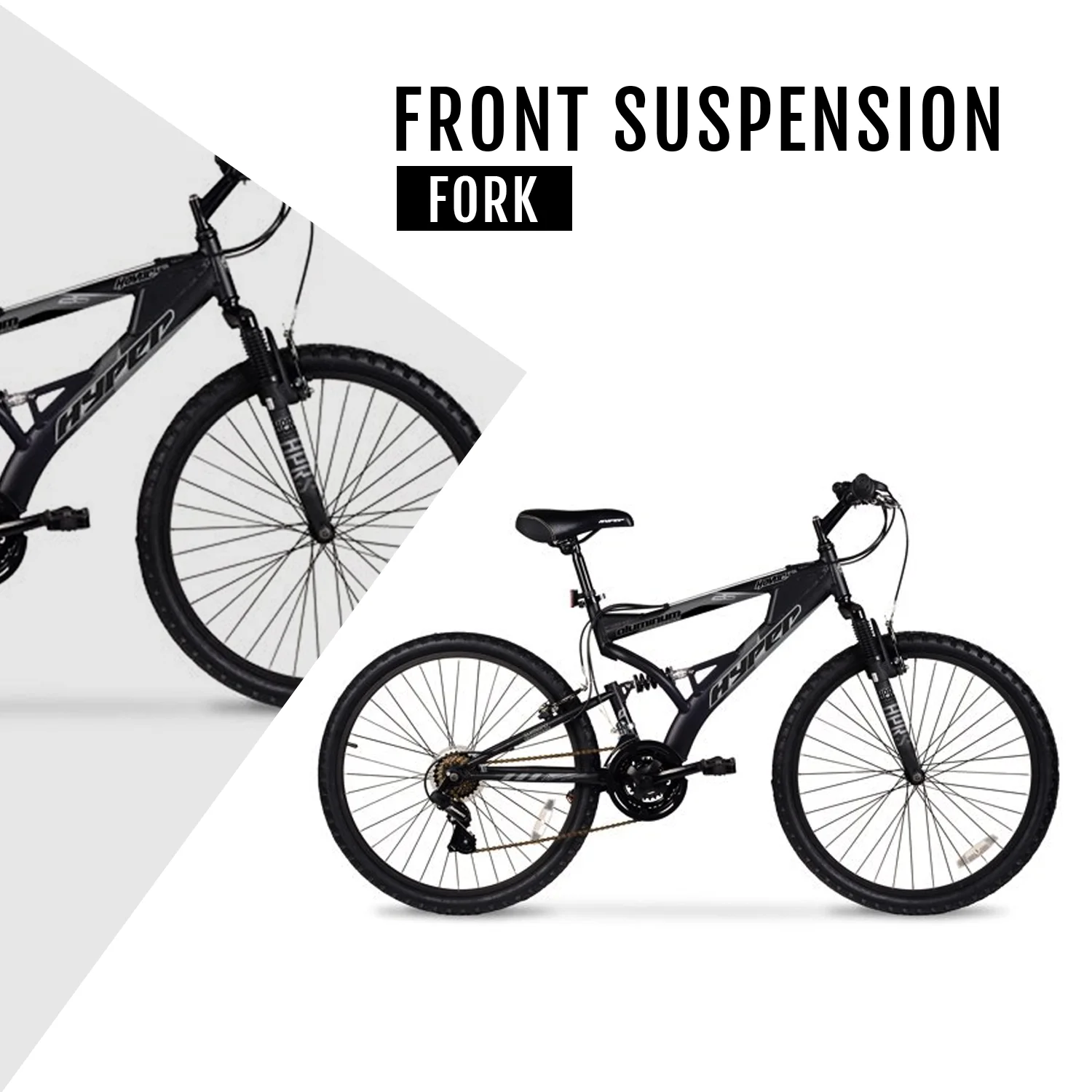 This Hyper Havoc Mountain Bike is the key to outdoor fun. It has a lightweight aluminum frame that lets users ride harder for longer, providing a reliable experience. The 26″ Hyper Havoc is designed with a front and rear suspension to offer a smooth ride on any surface. It features 21 speeds, ensuring versatility in the ride. This mountain bike has a comfortable twist shifter and a rear derailleur, allowing riders to change the gears quickly and smoothly. It also features a three-piece, high-performance crank. This bike is made with standard pedals for a comfortable and secure ride. It has grips on the handlebars for sustained comfort and control. Additionally, the bike comes equipped with a plush MTB seat, so the backsides will stay comfortable on long rides. It has a sleek, black design that provides a modern look. The bike can be ridden on a variety of surfaces, allowing for flexibility in where you go with it.