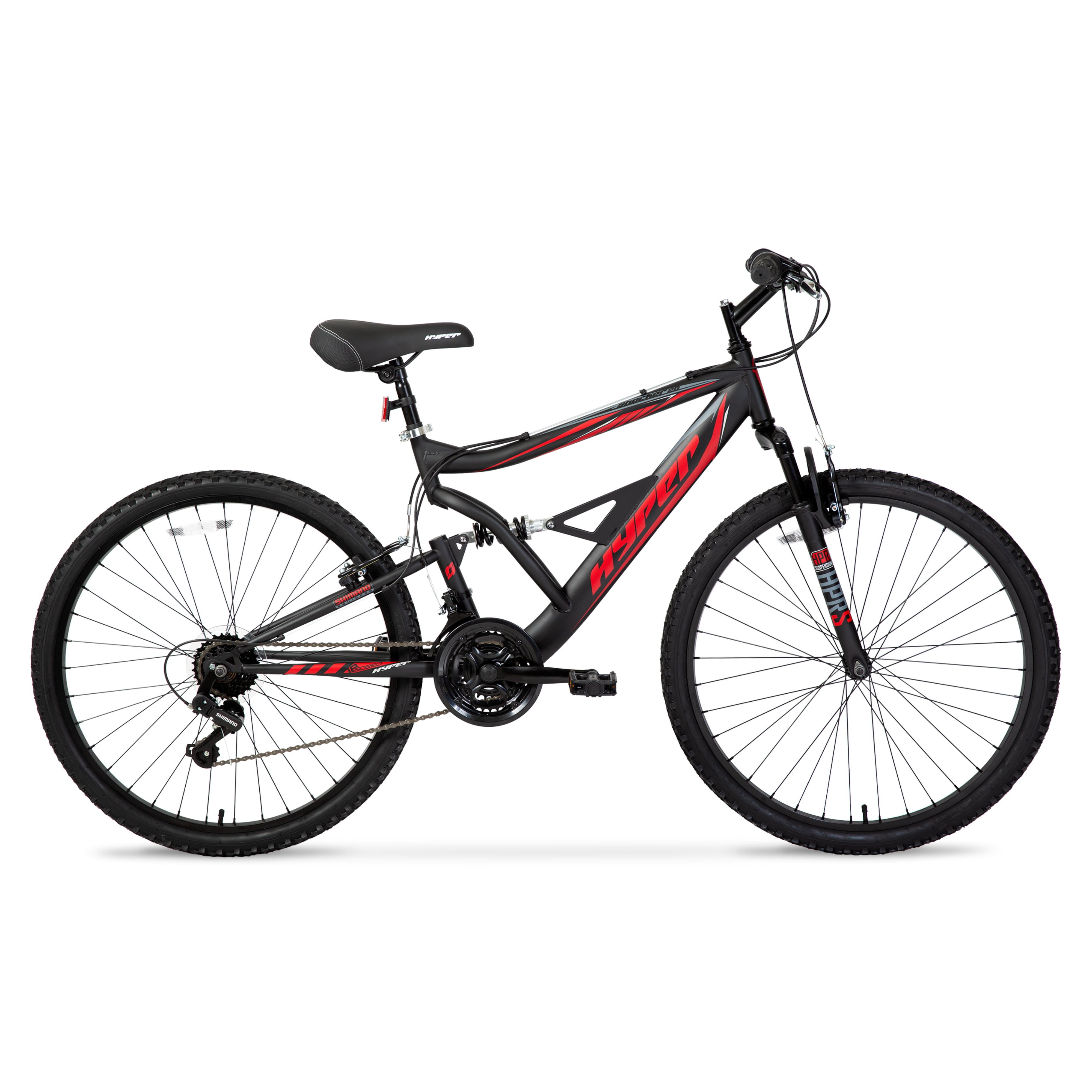 The hyper mountain bike has 18-speed twist-grip shifting Suspension steel frame with a suspension fork The black mountain bike has front and rear linear-pull brakes Hyper men’s bike features an alloy quick release seat clamp Assembled Dimensions: 67″ L x 42″ H x 24″ W Brakes: Linear-pull front and rear brakes Seat: Deluxe padded Frame: Steel Wheel Type: 26″ spoked wheel Tires: 26″ x 2.25″ knobby tires Pedals: Resin platform pedals 3-piece high-performance crank Rear derailleur Comes in black with authentic Hyper graphics Ensures a comfortable ride every time This bike is suitable for on- and off-road surfaces Supports Maximum weight of 250 lbs Male Rider Height: 5’2″ – 5’10” Age Group: 14 years old and up Character Group: Shocker