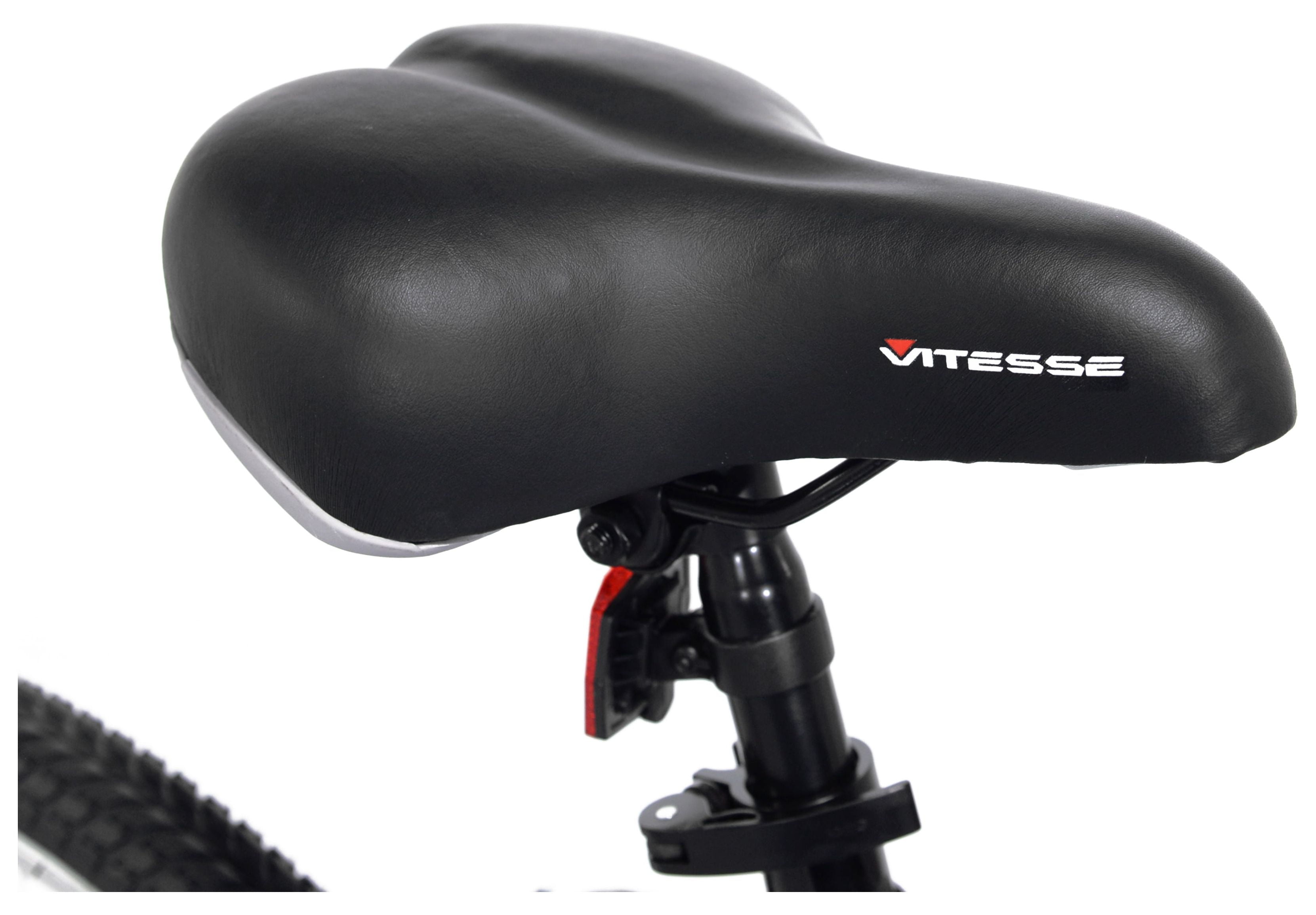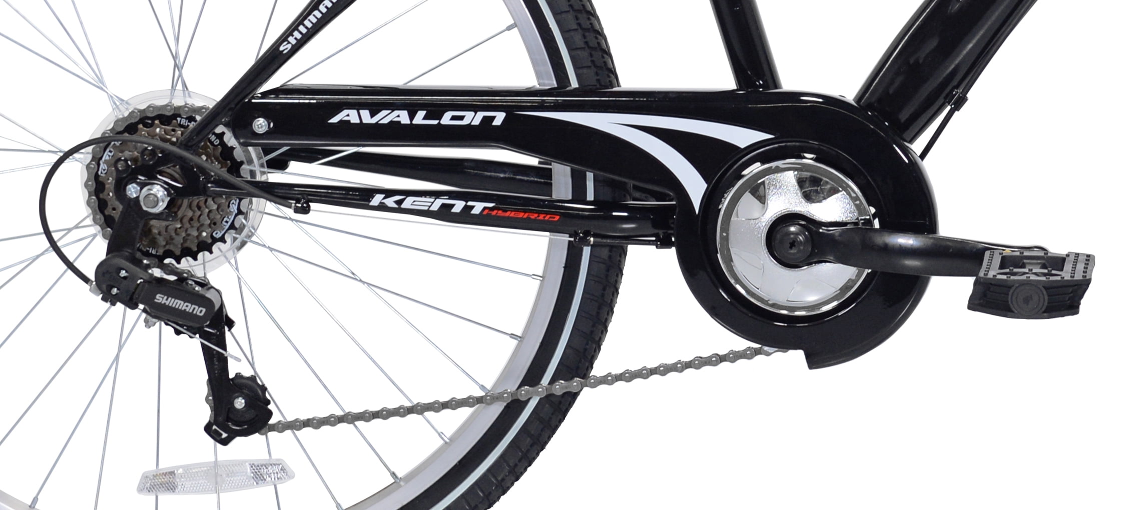 Aluminum frame Shimano rear derailleur Front suspension fork Front and rear linear pull brakes 26″ Hybrid Street Tires Adjustable seat post with quick release Alloy adjustable stem Alloy rims Steel handlebars Deluxe padded saddle Pedals: Standard pedals Weight Limit: 250 lbs Kent Bicycle – Adult comfort bicycle