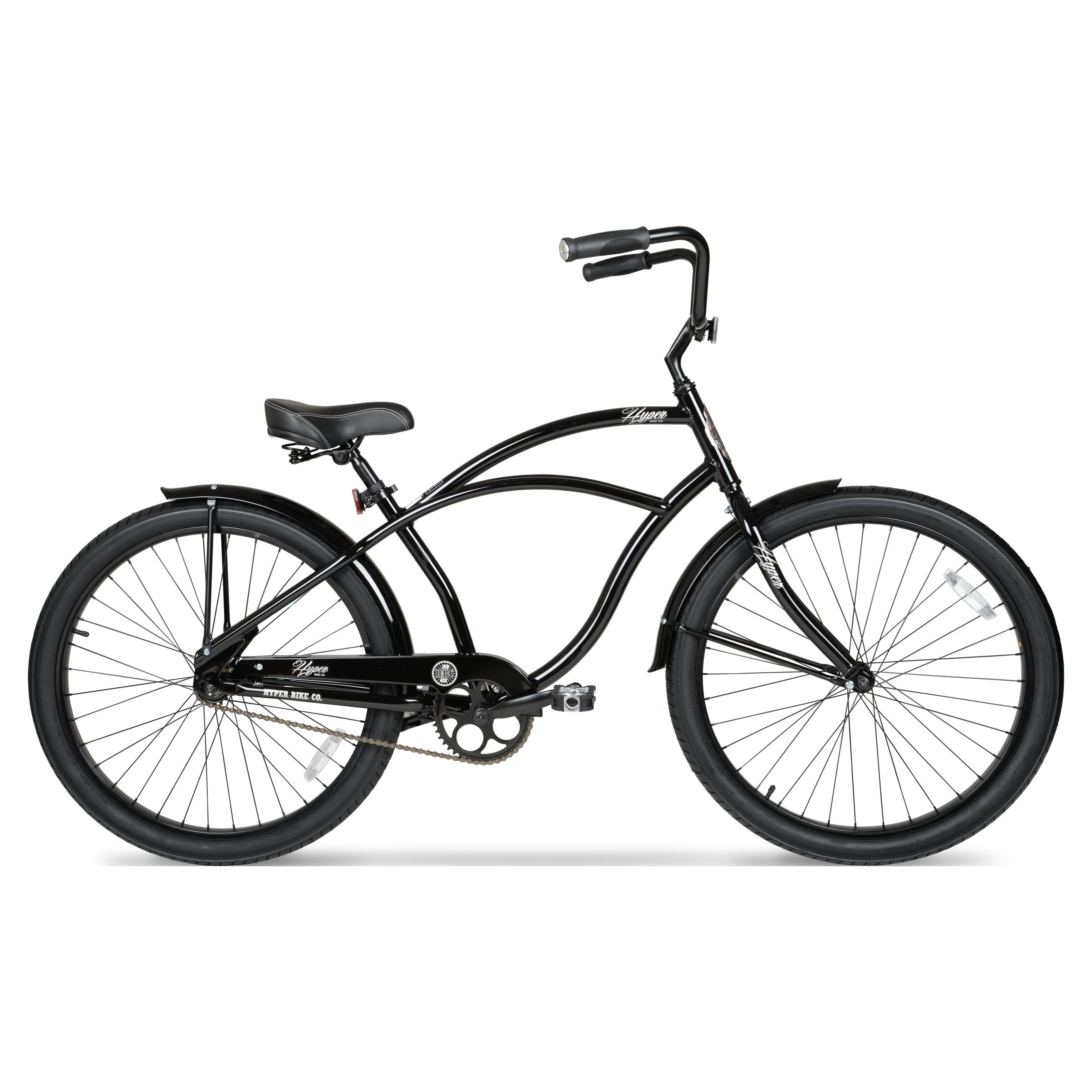Ride in style with Hyper Bicycles men’s 26in beach cruiser bike in black. This bicycle has a steel frame with easy-to-use pedal backward coaster braking. For your comfort, this bike includes platform cruiser pedals, lightweight alloy wheels, and a padded spring comfort seat. Full wrap fenders create protection for your tires. Large upright handle bars help put the rider in an upright comfortable ridding position. Perfect for your daily commutes or weekend leisurely rides, the Hyper Bicycles men’s beach cruiser bike will help make your trips more enjoyable.