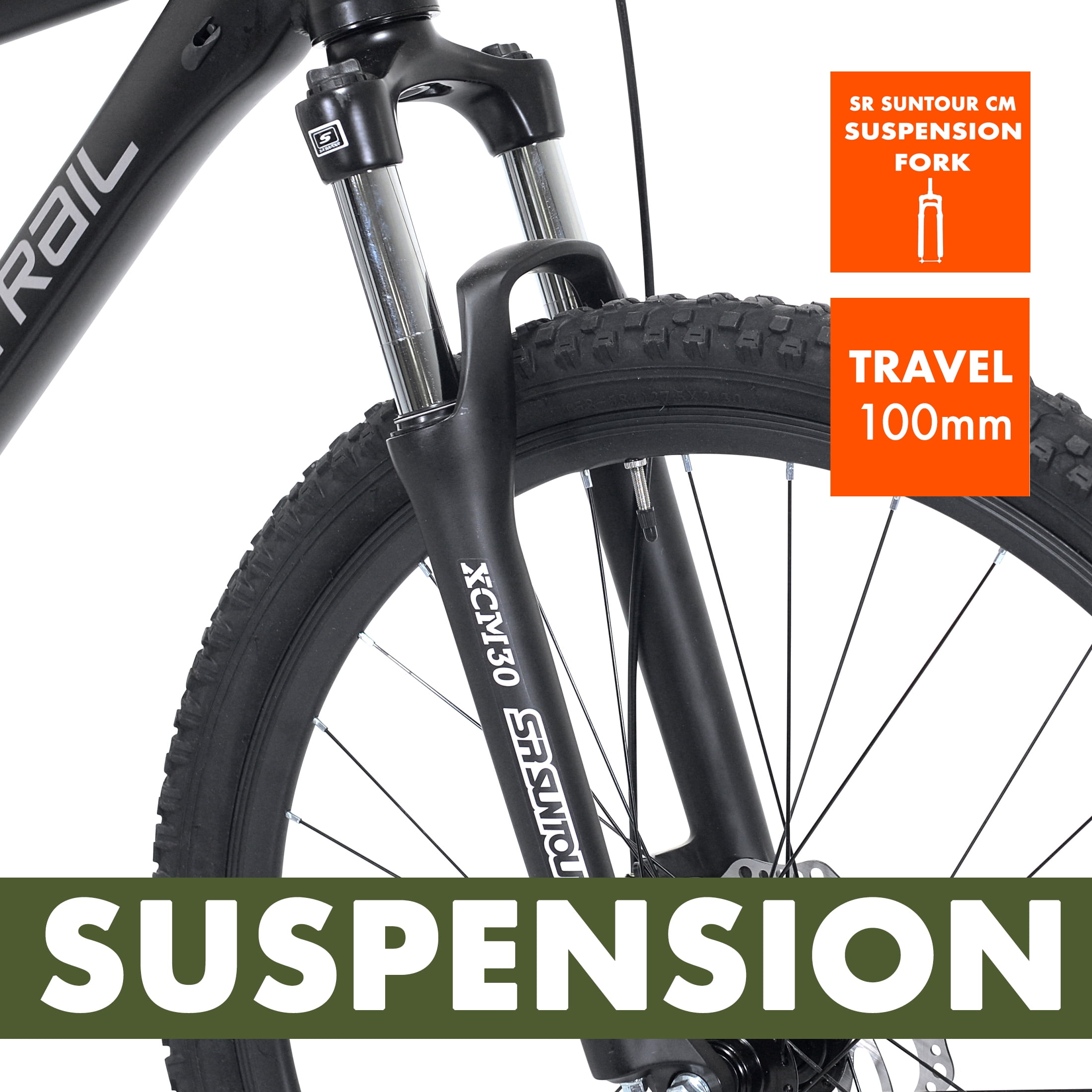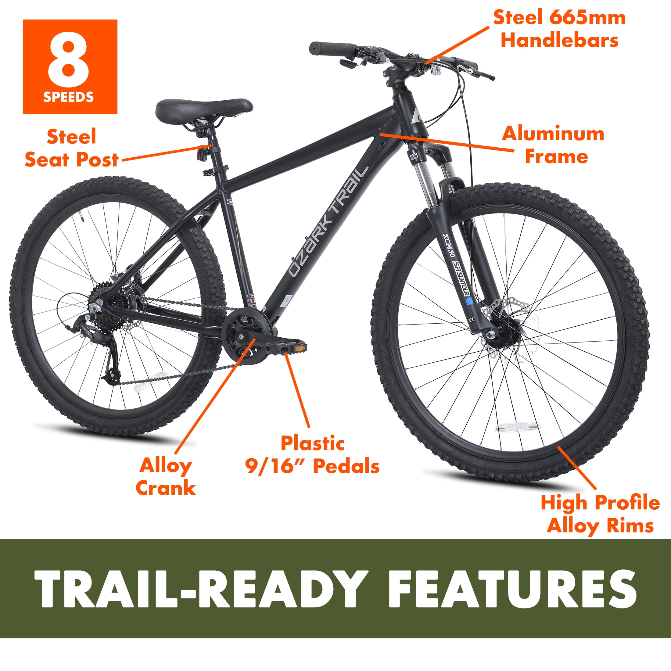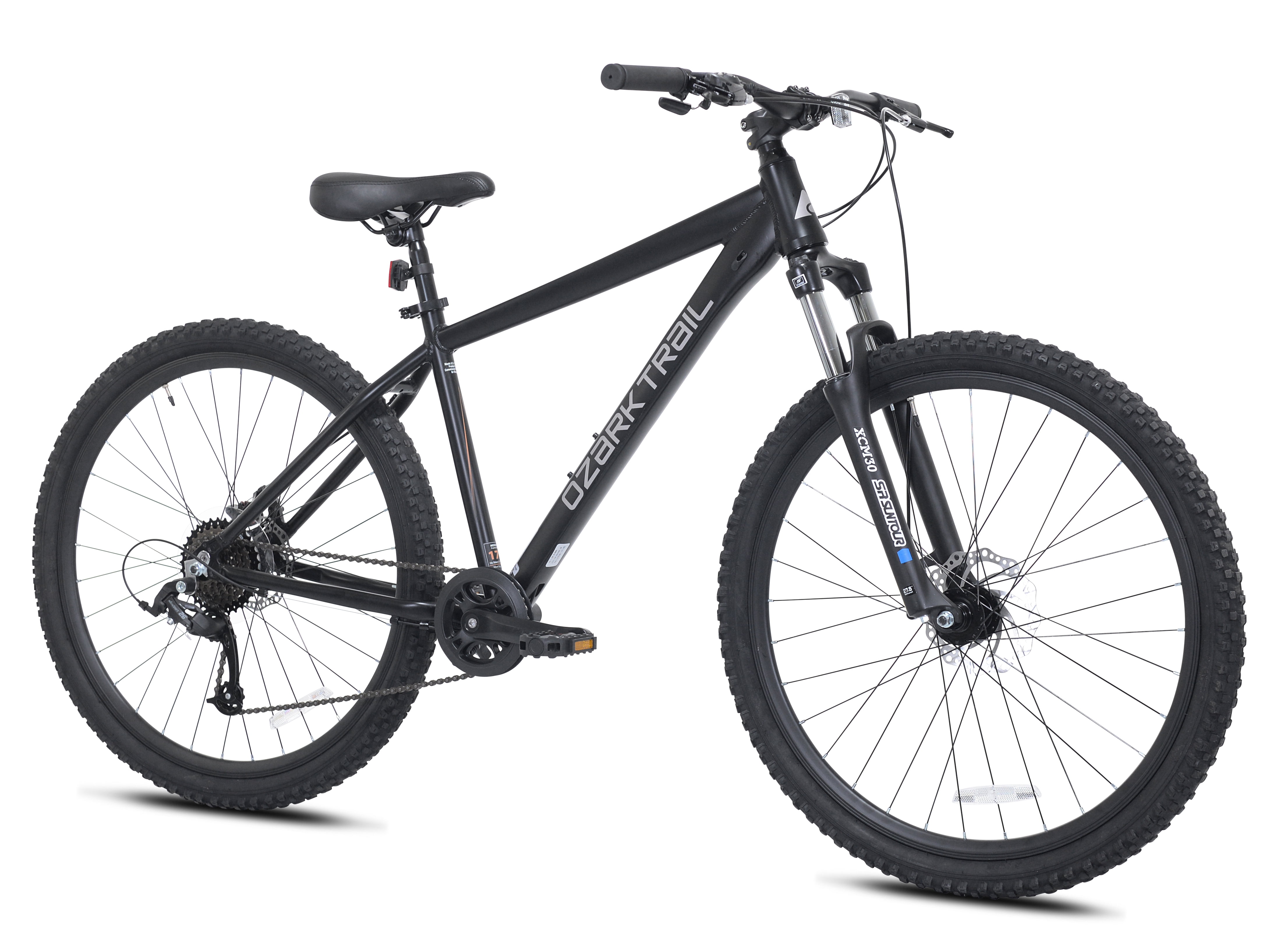 Brand: Ozark Trail Bicycle Type: Mountain Bike Wheel Diameter: 27.5″ Suggested Rider Height: 5’3″ – 5’8″ Lightweight aluminum hardtail frame with a tapered headtube Front and rear mechanical disc brakes Handlebar-mounted quick trigger shifter SR Suntour front suspension fork Padded MTB saddle with adjustable height 1 x 8 MTB drivetrain with a wide gear range Assembled weight: 36.5 lbs Great unisex adult bicycle