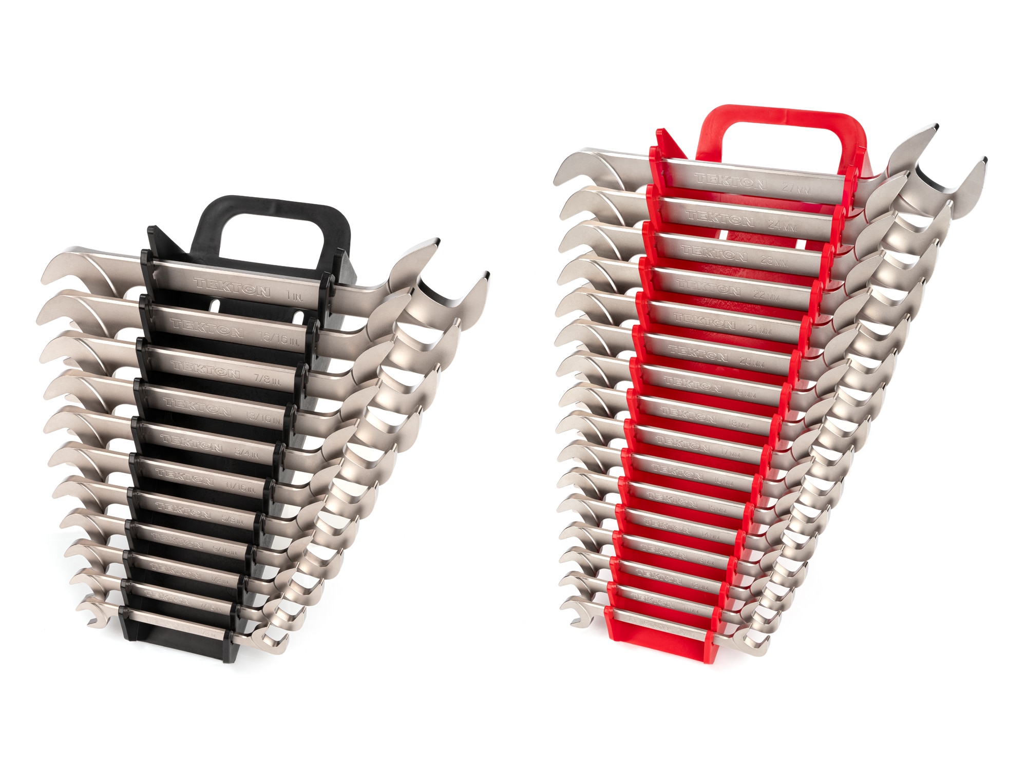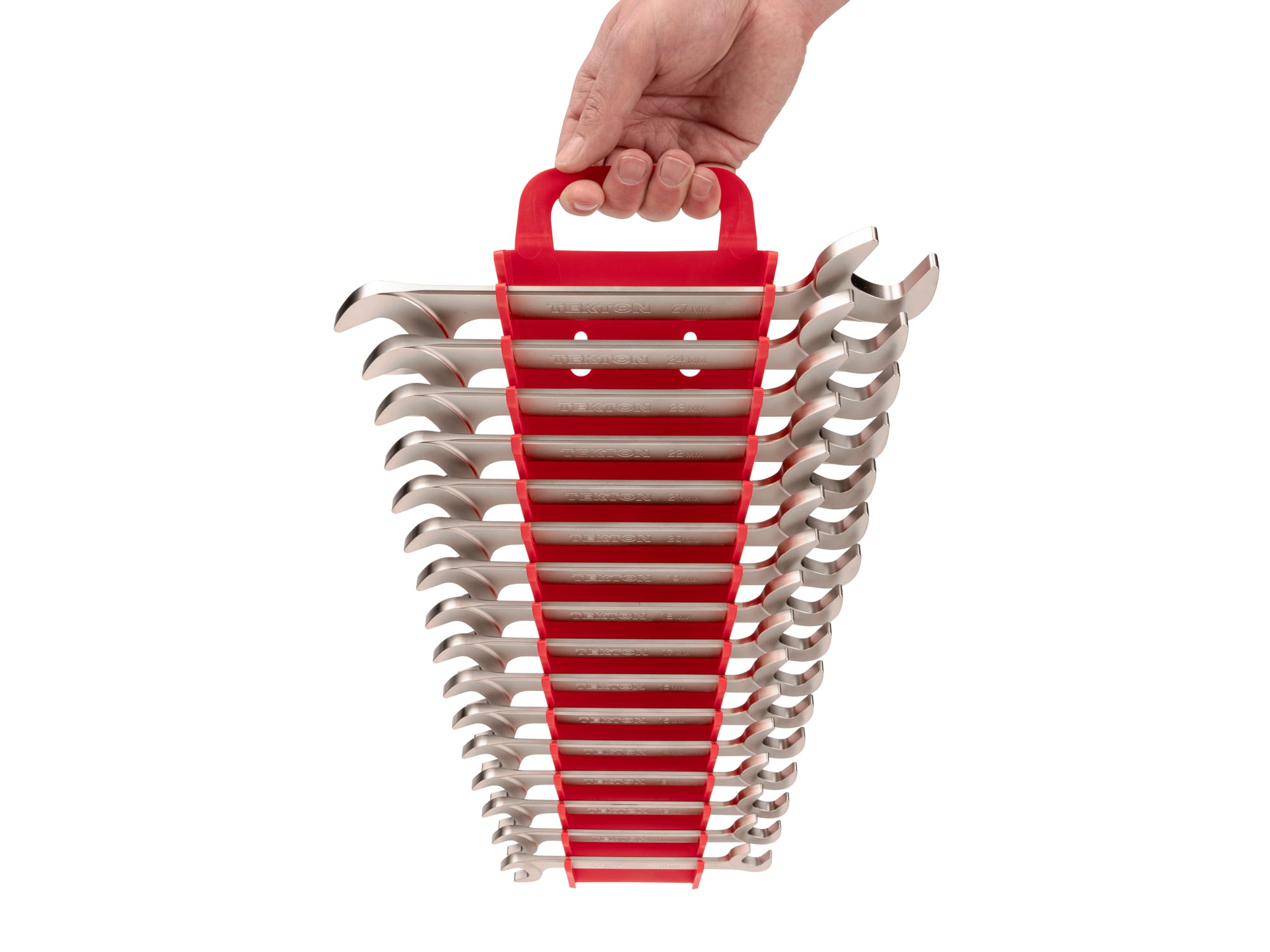 Tekton Angle Head Open End Wrenches allow you to progressively turn fasteners and fittings in confined spaces, saving you time because you can continue to work without disconnecting or dismantling equipment to access hard-to-reach areas. The 30 and 60 degree angled heads provide greater coverage with fewer blind spots in limited access situations, and the beam is shifted up and out of the way to achieve the greatest range of motion in confined spaces. The shape of the head is also optimized for access and strength while also preventing jaw spread. We make our angle wrenches from 4140 chromium-molybdenum steel and harden them to 50–53 HRC. The wrenches are abrasive-blasted to create a finely textured satin finish and then plated with corrosion-resistant nickel. The wrenches have laser-engraved size markings and (with the exception of the smallest wrench sizes) chamfered handles. Our angle wrenches are manufactured entirely in the USA with USA-made materials. Machining, engraving, vibration polishing, abrasive-blasting, and plating take place at our Grand Rapids, Michigan manufacturing facility. This set includes a portable low-profile wrench holder with a full-size folding carrying handle and flexible teeth that hold the wrenches in place.