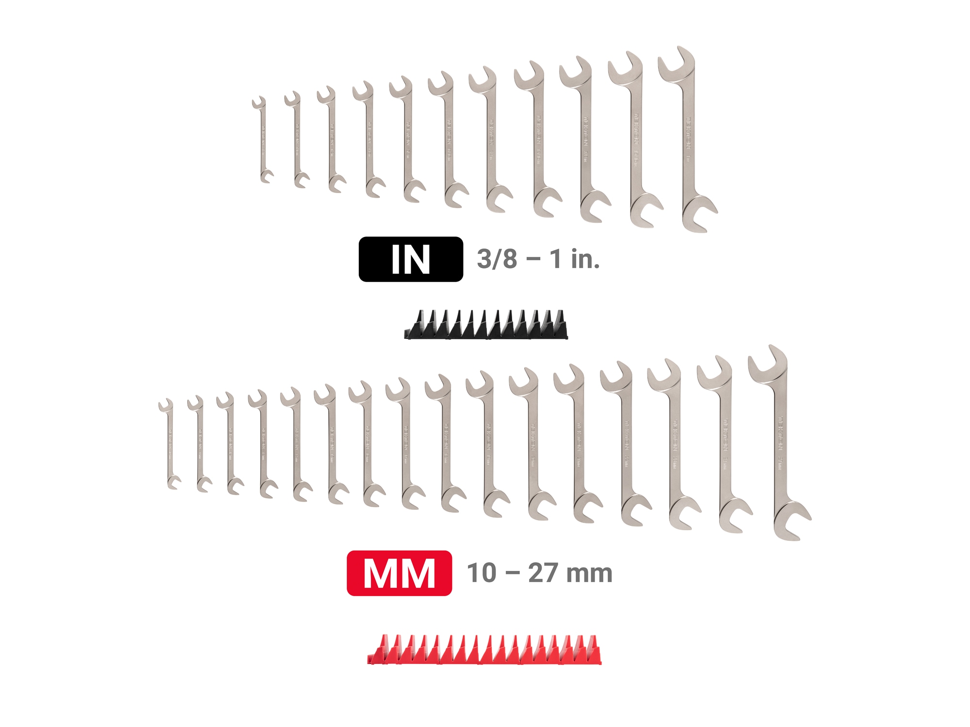 Tekton Angle Head Open End Wrenches allow you to progressively turn fasteners and fittings in confined spaces, saving you time because you can continue to work without disconnecting or dismantling equipment to access hard-to-reach areas. The 30 and 60 degree angled heads provide greater coverage with fewer blind spots in limited access situations, and the beam is shifted up and out of the way to achieve the greatest range of motion in confined spaces. The shape of the head is also optimized for access and strength while also preventing jaw spread. We make our angle wrenches from 4140 chromium-molybdenum steel and harden them to 50–53 HRC. The wrenches are abrasive-blasted to create a finely textured satin finish and then plated with corrosion-resistant nickel. The wrenches have laser-engraved size markings and (with the exception of the smallest wrench sizes) chamfered handles. Our angle wrenches are manufactured entirely in the USA with USA-made materials. Machining, engraving, vibration polishing, abrasive-blasting, and plating take place at our Grand Rapids, Michigan manufacturing facility. This set includes modular wrench organizers that fit most toolbox drawers, keeping your wrenches neatly arranged with consistent spacing.