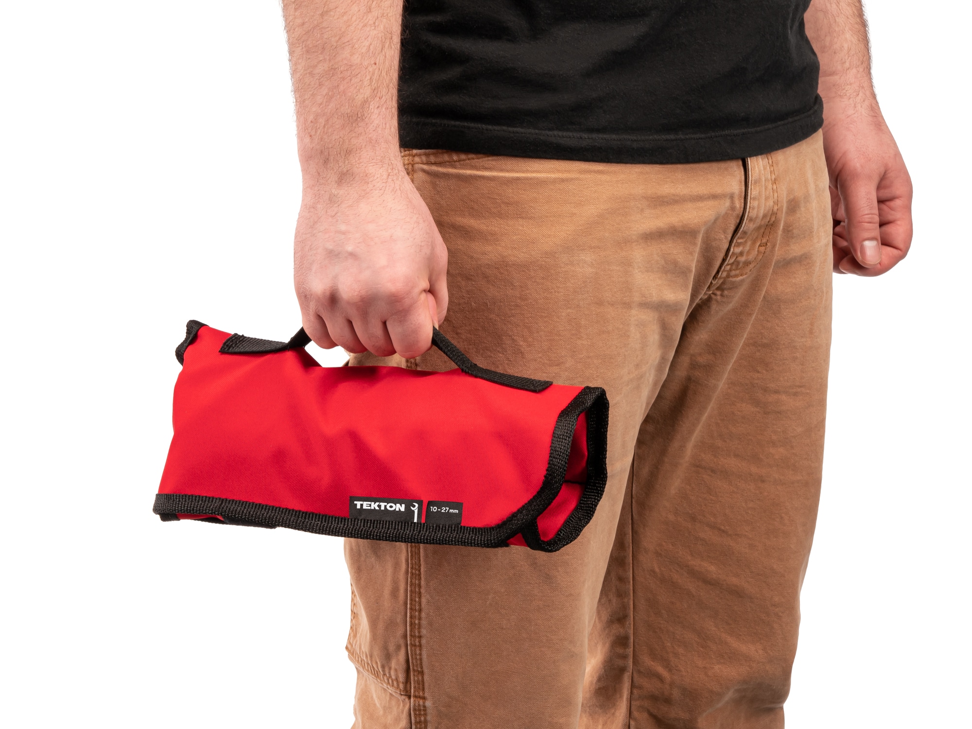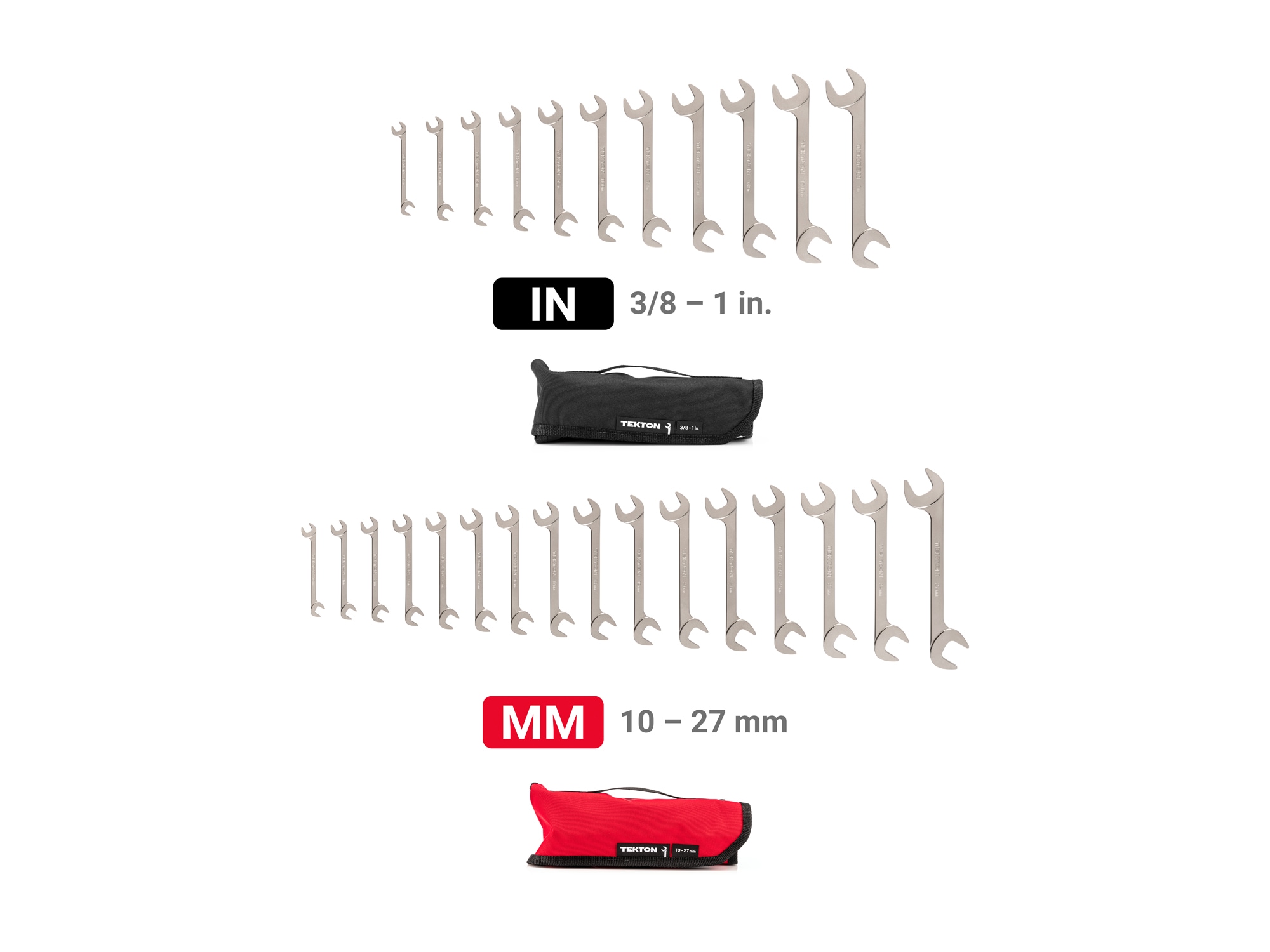 Tekton Angle Head Open End Wrenches allow you to progressively turn fasteners and fittings in confined spaces, saving you time because you can continue to work without disconnecting or dismantling equipment to access hard-to-reach areas. The 30 and 60 degree angled heads provide greater coverage with fewer blind spots in limited access situations, and the beam is shifted up and out of the way to achieve the greatest range of motion in confined spaces. The shape of the head is also optimized for access and strength while also preventing jaw spread. We make our angle wrenches from 4140 chromium-molybdenum steel and harden them to 50–53 HRC. The wrenches are abrasive-blasted to create a finely textured satin finish and then plated with corrosion-resistant nickel. The wrenches have laser-engraved size markings and (with the exception of the smallest wrench sizes) chamfered handles. Our angle wrenches are manufactured entirely in the USA with USA-made materials. Machining, engraving, vibration polishing, abrasive-blasting, and plating take place at our Grand Rapids, Michigan manufacturing facility. This set includes a compact roll-up pouch that keeps wrenches well-packed and unable to slide out.