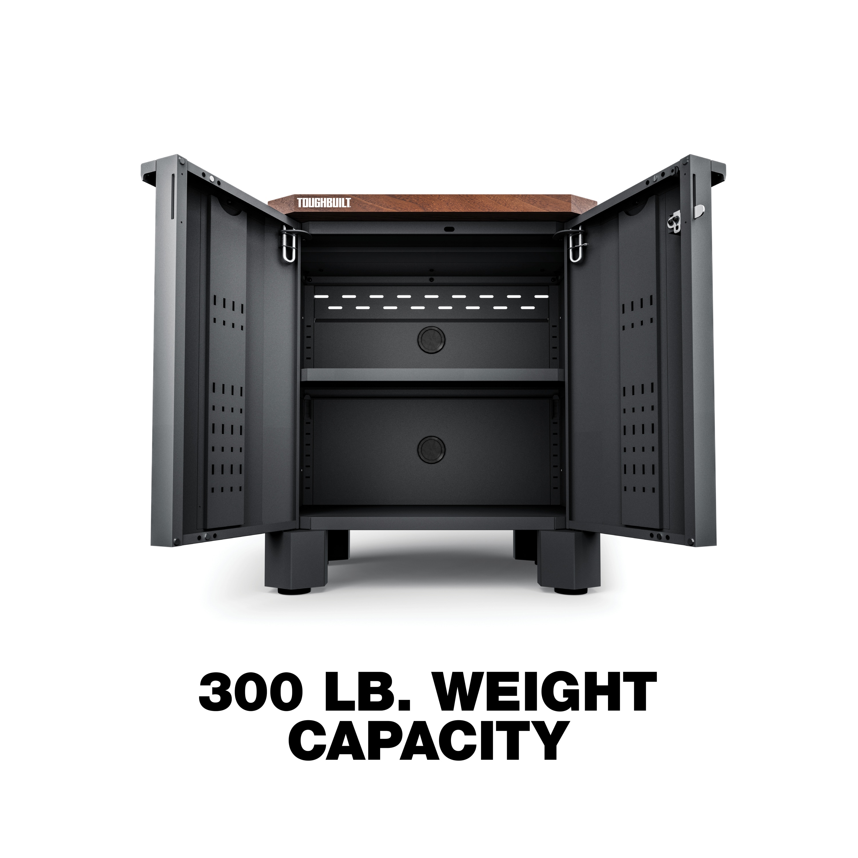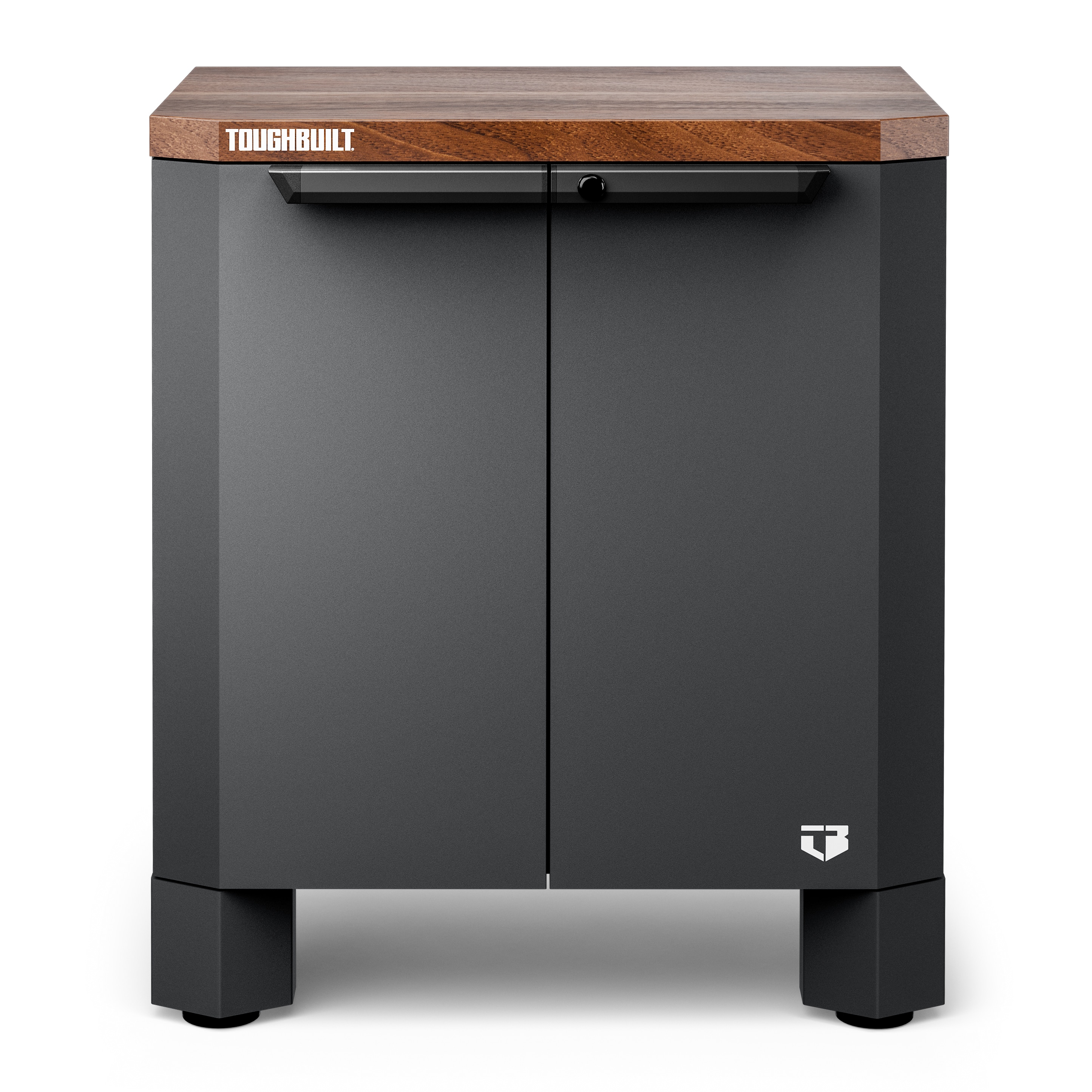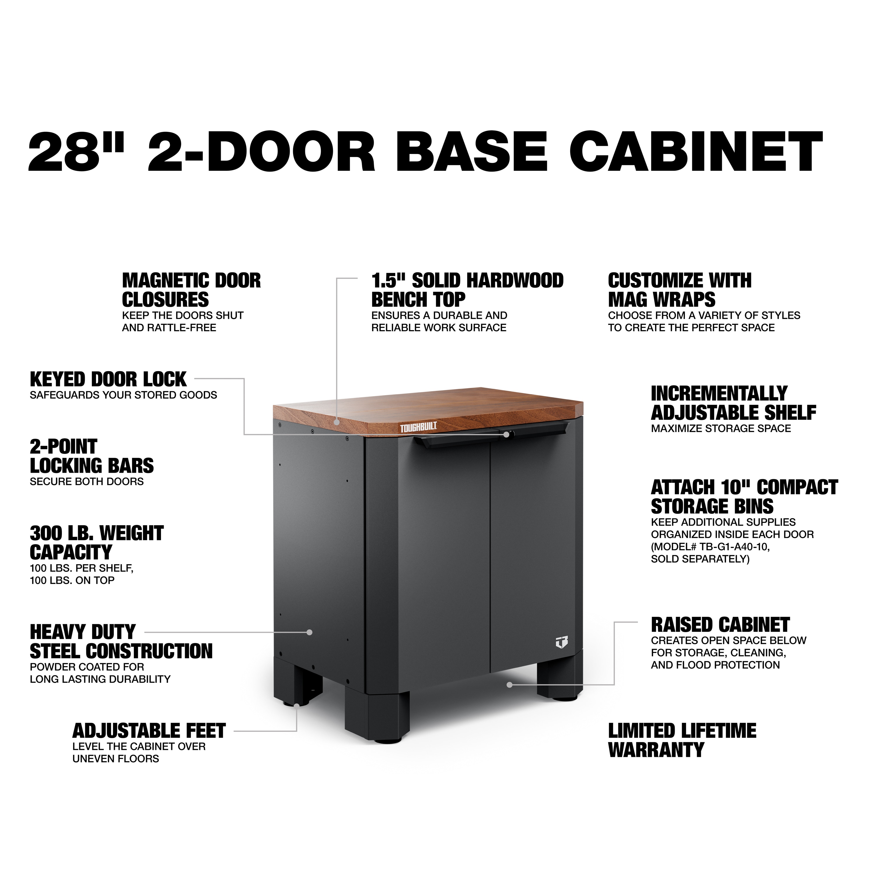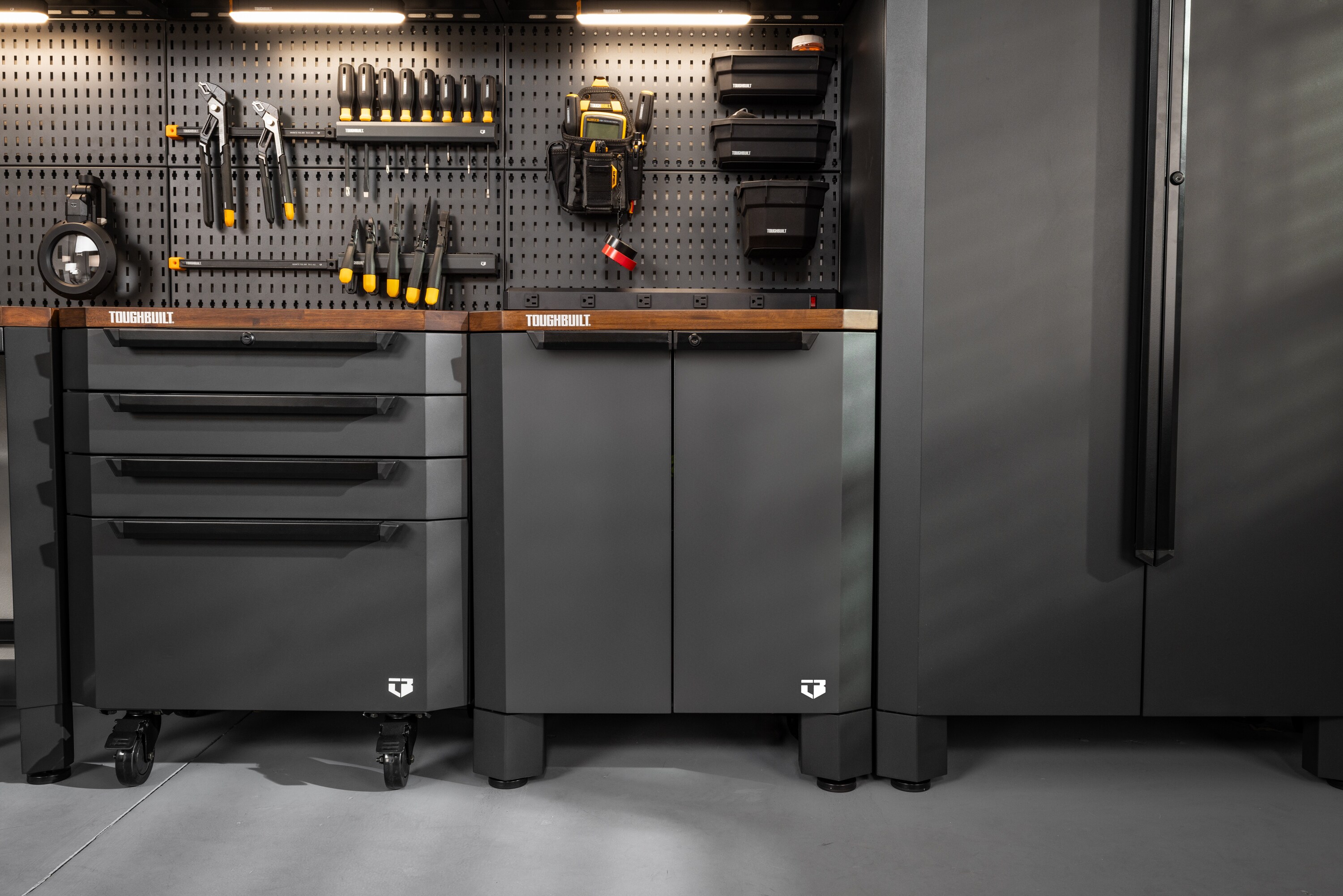 The ToughBuilt® 2-Door Base Cabinet with its 1-1/2″ hardwood solid work surface offers ample space in a compact design. The cabinet includes one standard base shelf and one adjustable shelf, each capable of holding up to 100 lbs. The locking doors ensure added security (two keys are provided). The inner-door slot tile is compatible with select ToughBuilt accessories. For a truly personalized environment, consider customizing the front of the cabinets by adding various ToughBuilt magnetic panel coverings. With thousands of potential storage configurations, you can tailor your ToughBuilt garage storage system to satisfy your needs.