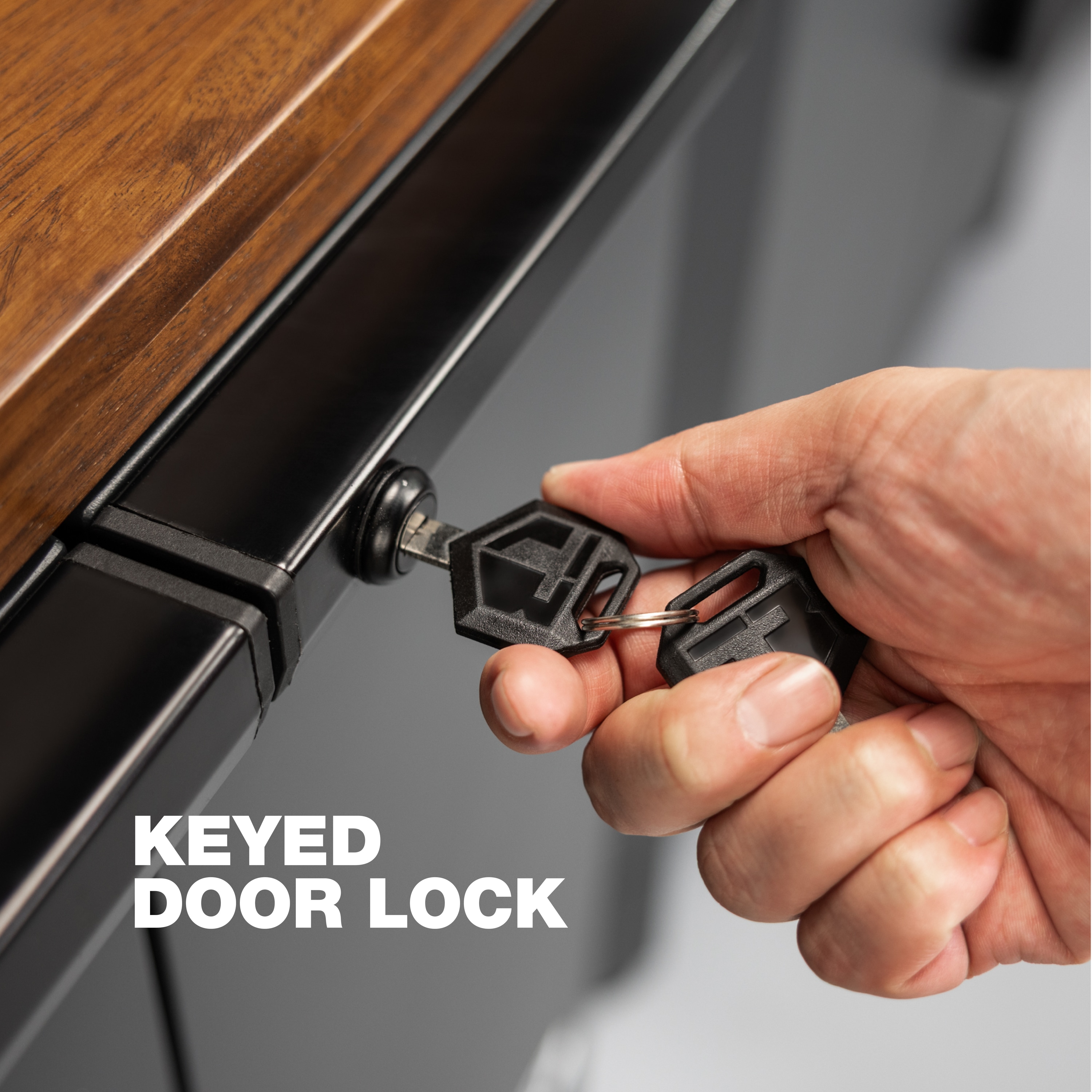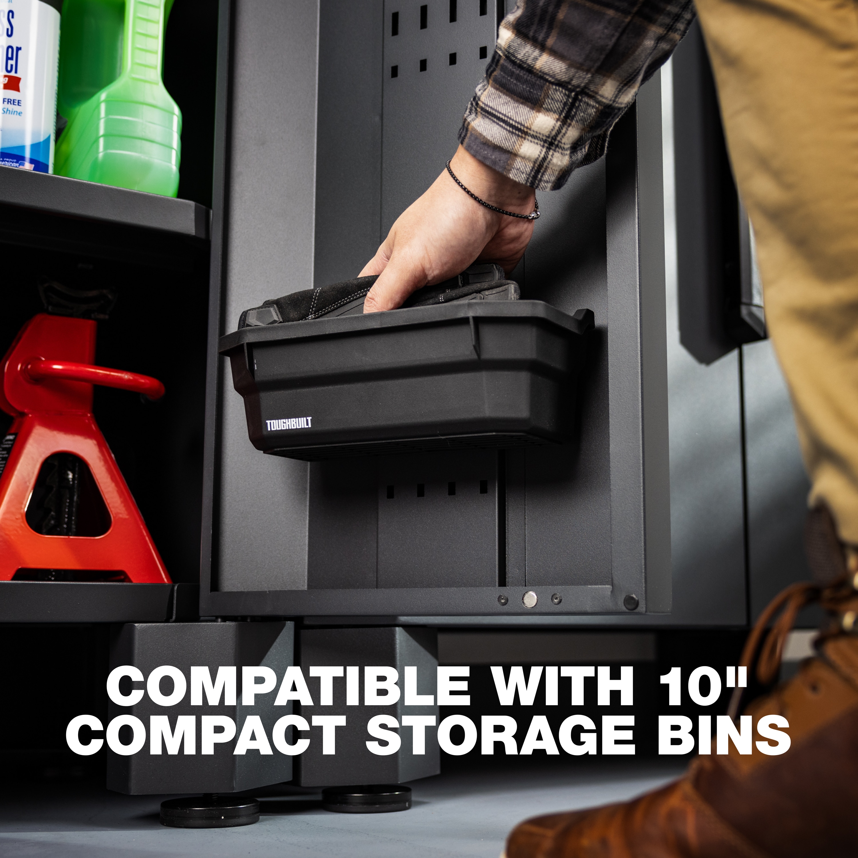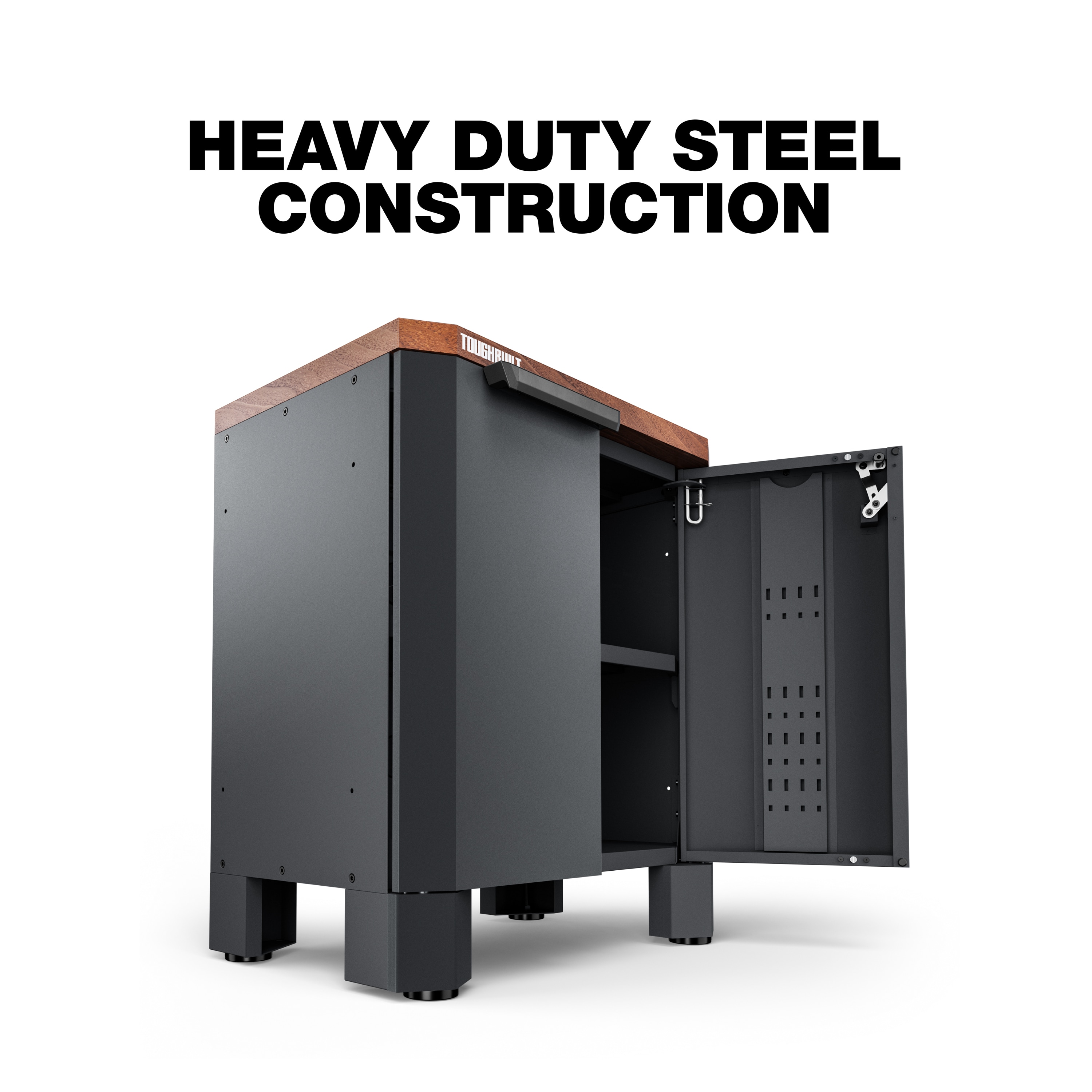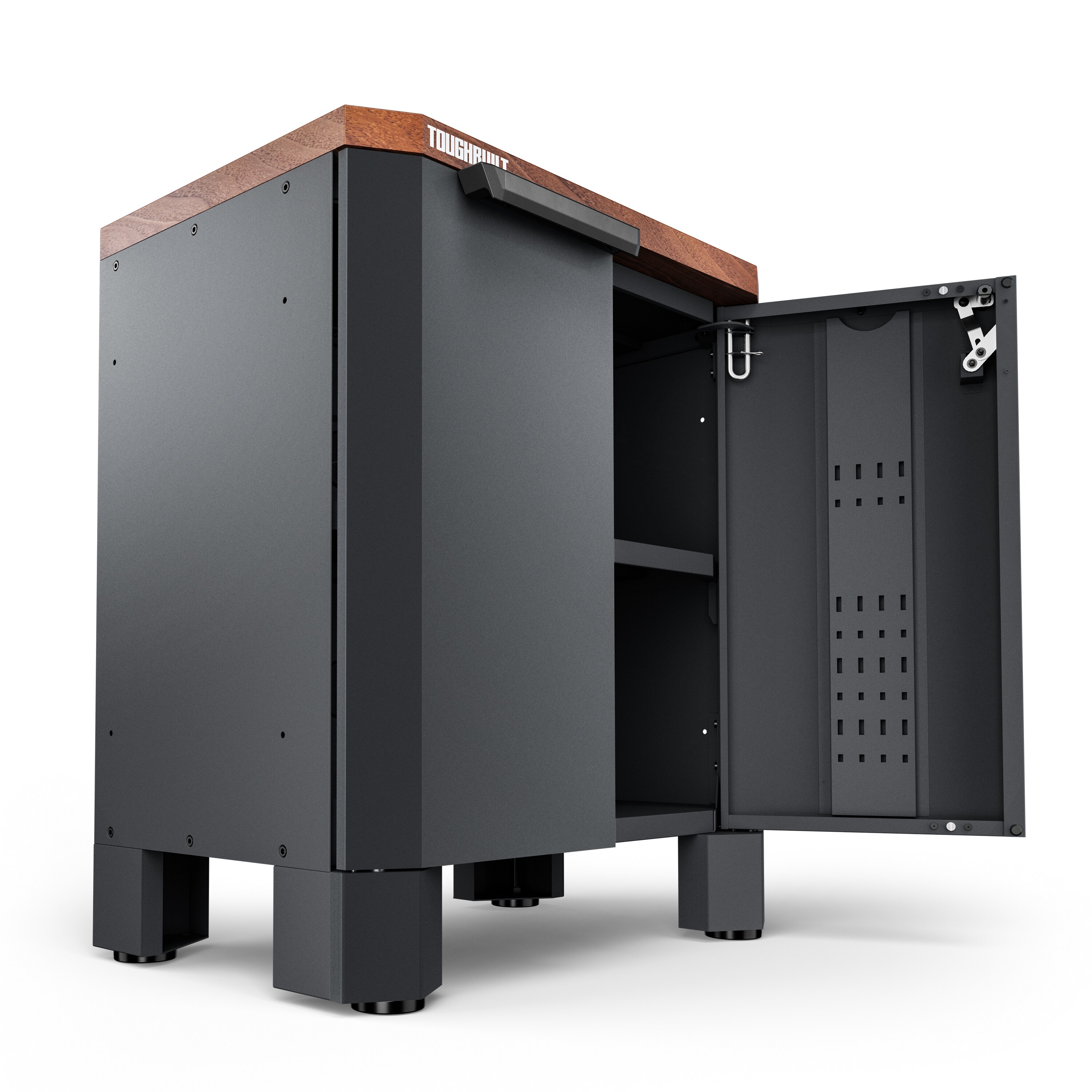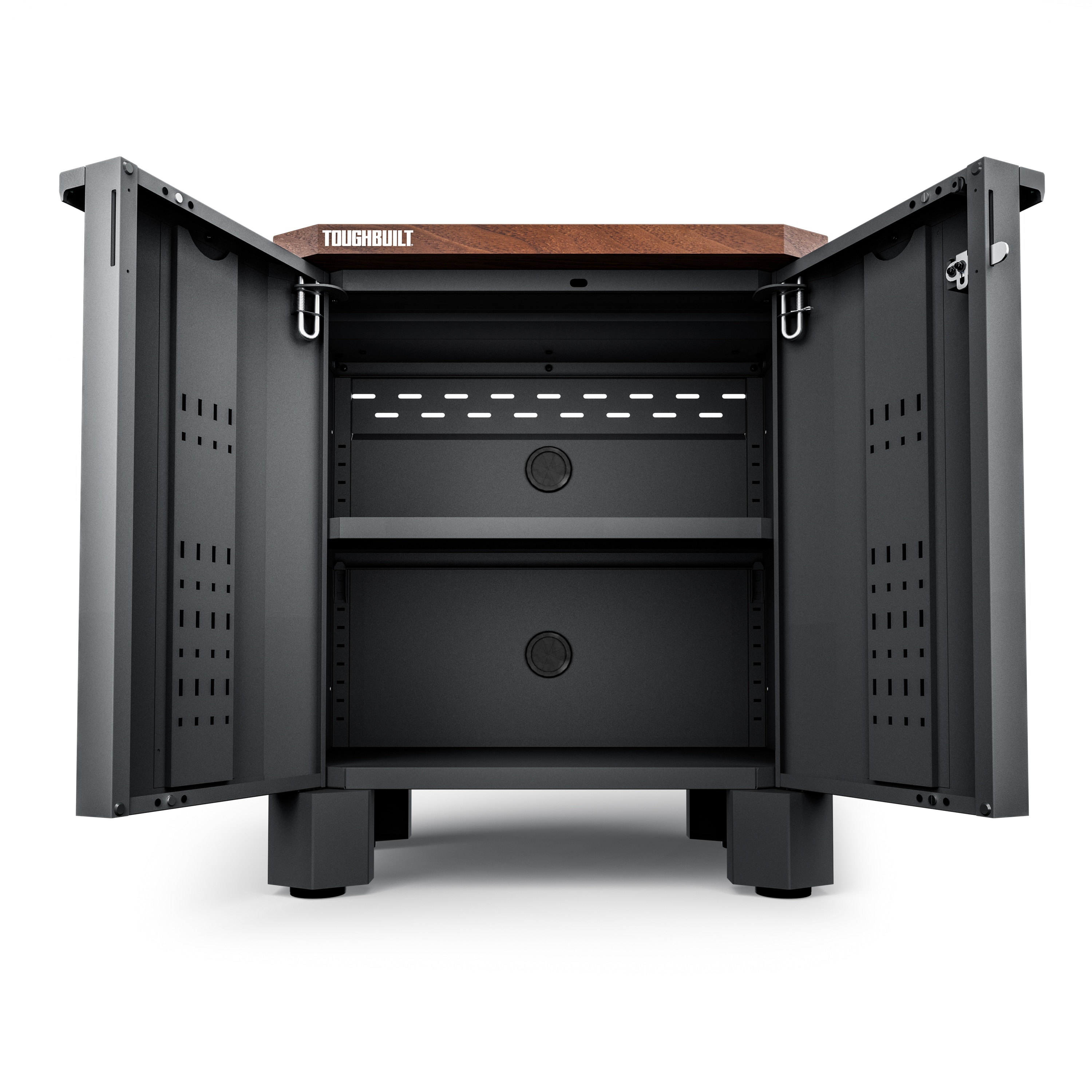 The ToughBuilt® 2-Door Base Cabinet with its 1-1/2″ hardwood solid work surface offers ample space in a compact design. The cabinet includes one standard base shelf and one adjustable shelf, each capable of holding up to 100 lbs. The locking doors ensure added security (two keys are provided). The inner-door slot tile is compatible with select ToughBuilt accessories. For a truly personalized environment, consider customizing the front of the cabinets by adding various ToughBuilt magnetic panel coverings. With thousands of potential storage configurations, you can tailor your ToughBuilt garage storage system to satisfy your needs.