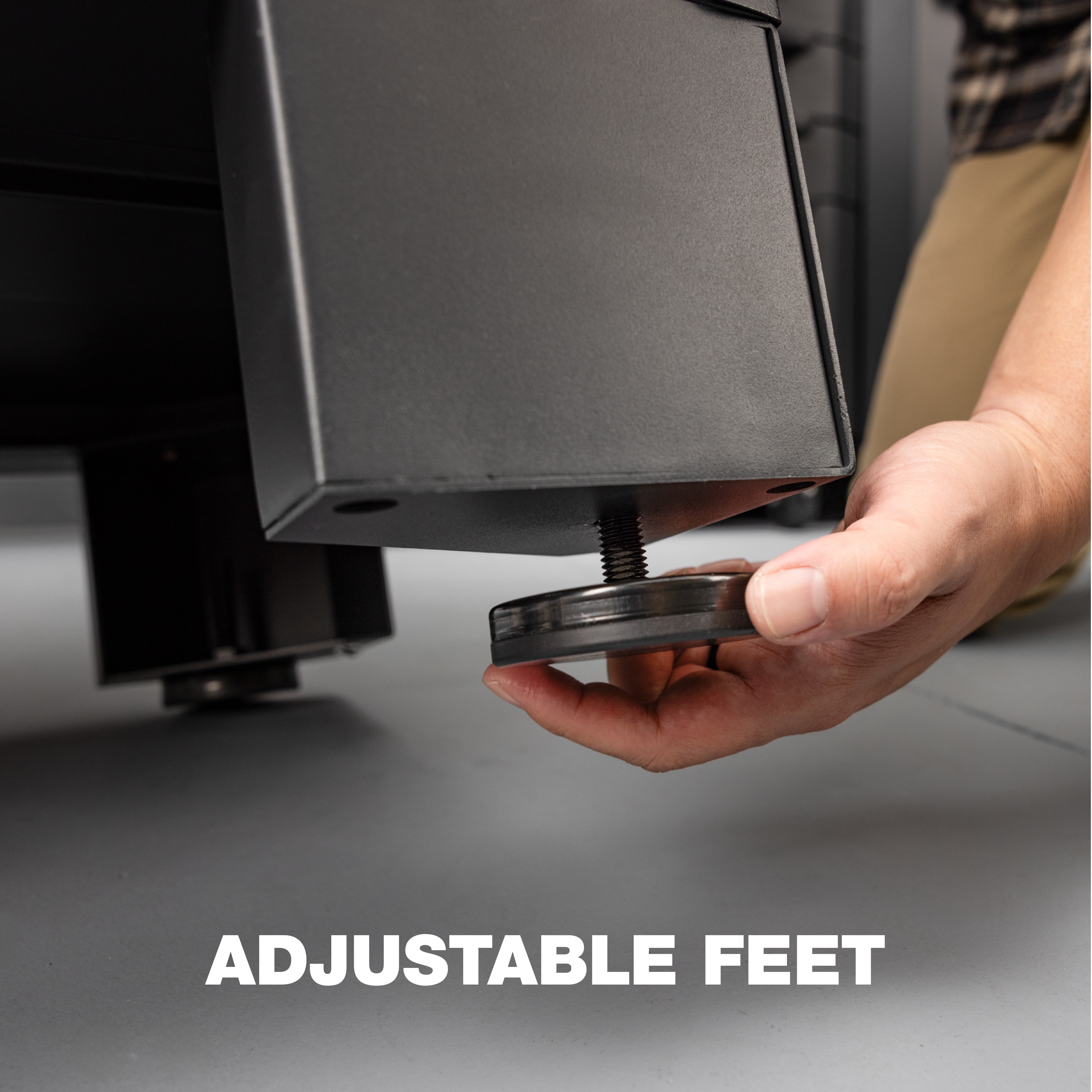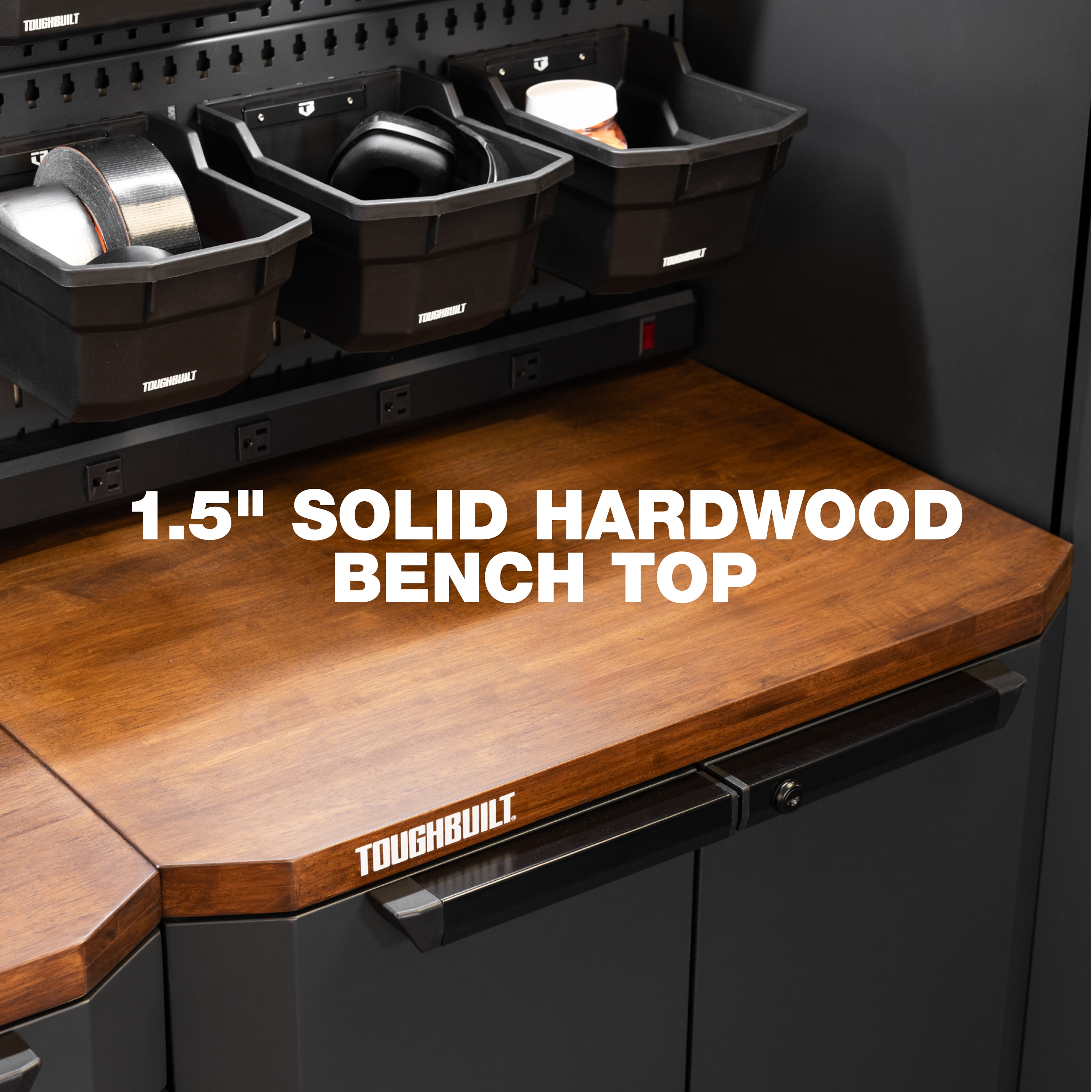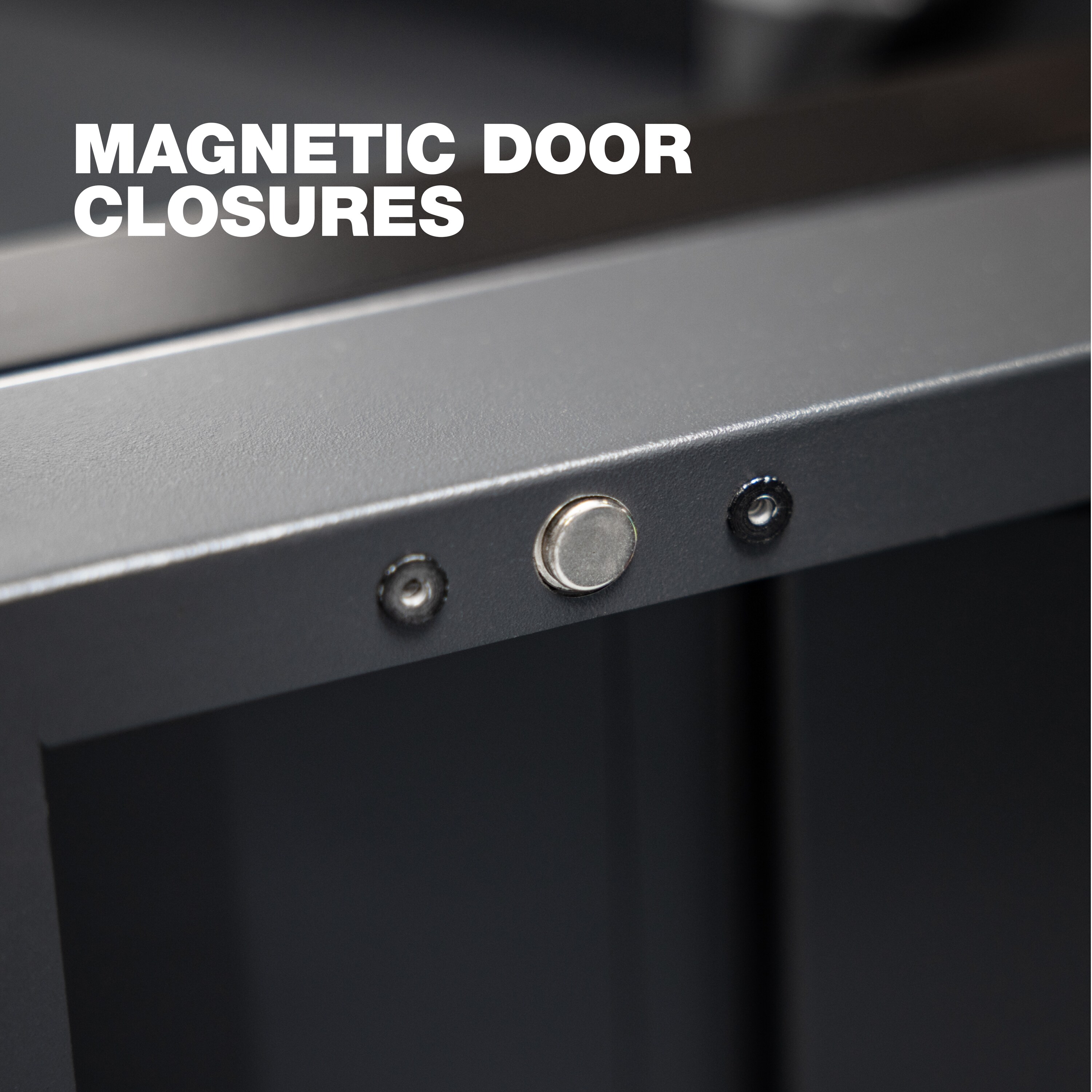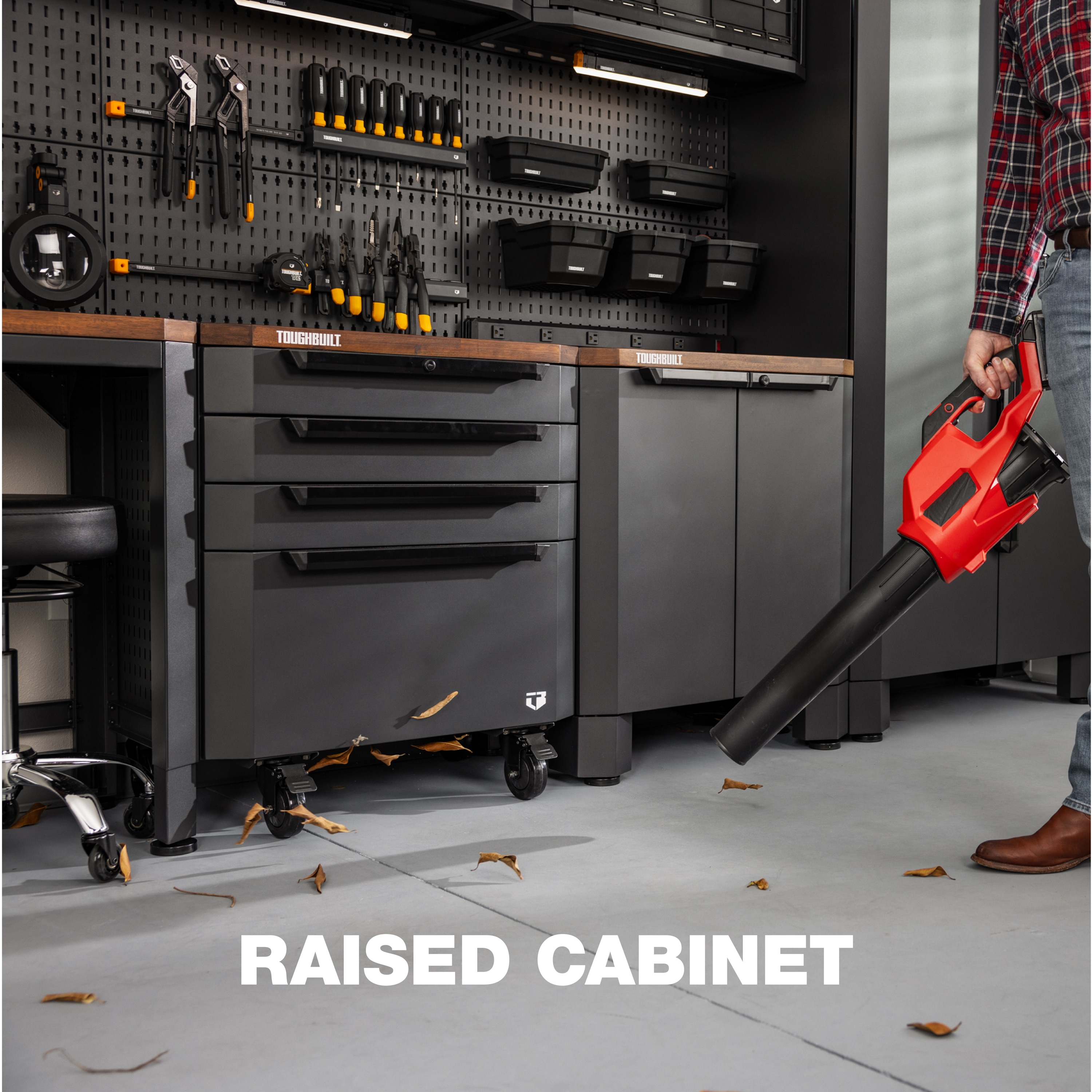 The ToughBuilt® 2-Door Base Cabinet with its 1-1/2″ hardwood solid work surface offers ample space in a compact design. The cabinet includes one standard base shelf and one adjustable shelf, each capable of holding up to 100 lbs. The locking doors ensure added security (two keys are provided). The inner-door slot tile is compatible with select ToughBuilt accessories. For a truly personalized environment, consider customizing the front of the cabinets by adding various ToughBuilt magnetic panel coverings. With thousands of potential storage configurations, you can tailor your ToughBuilt garage storage system to satisfy your needs.