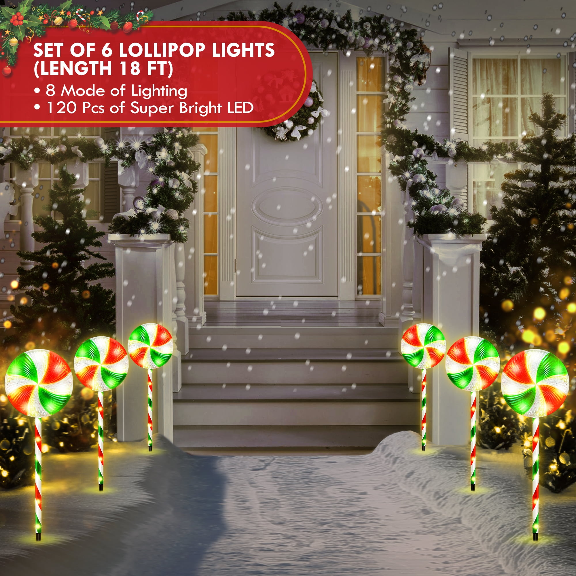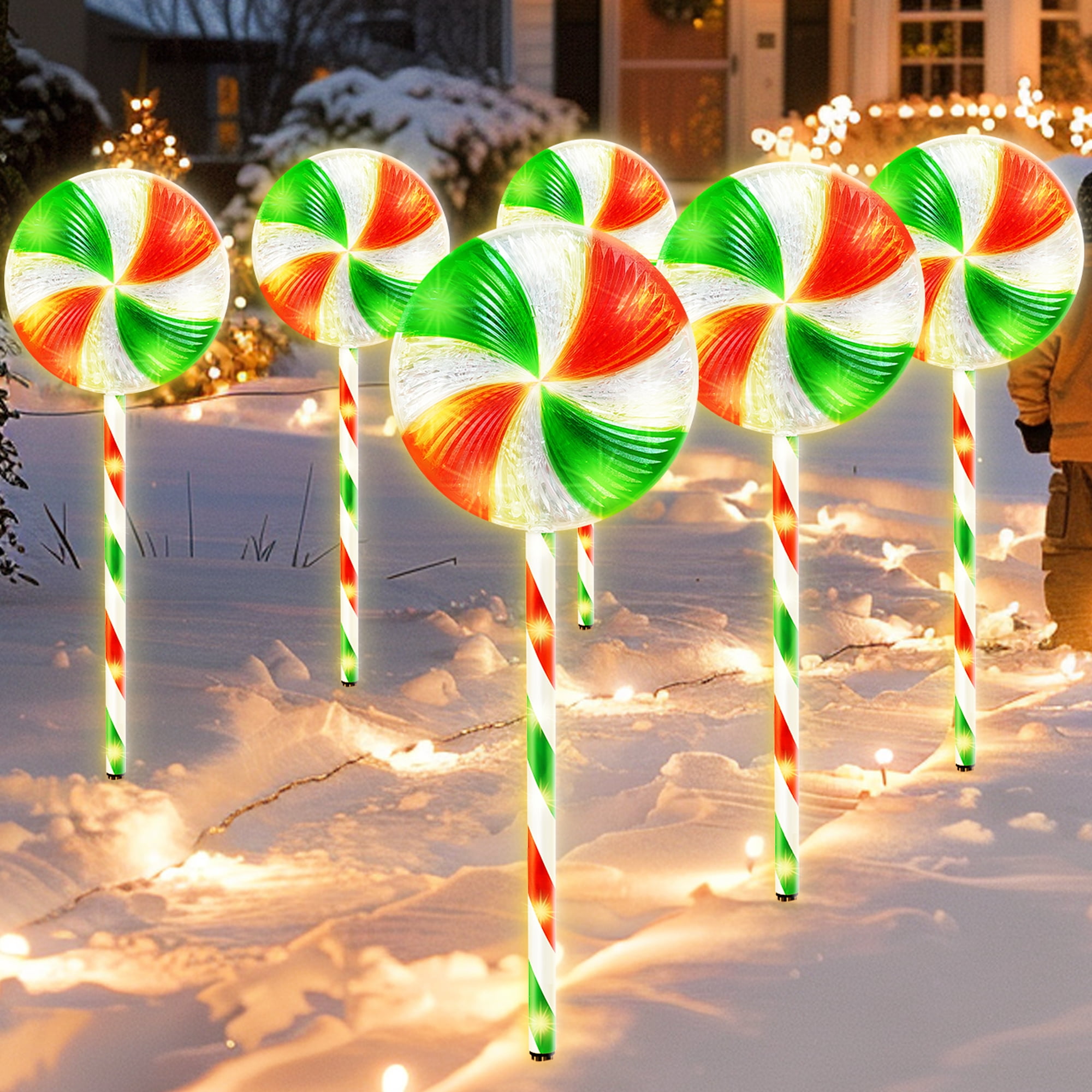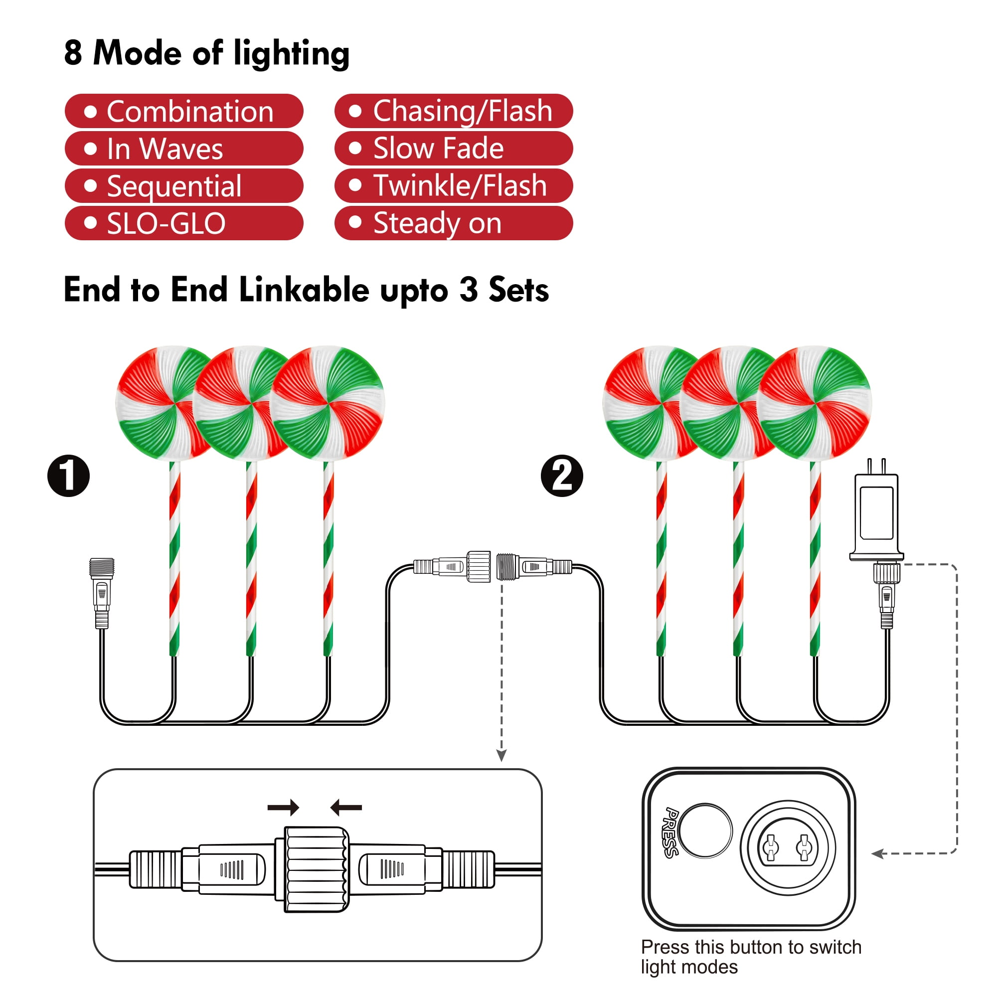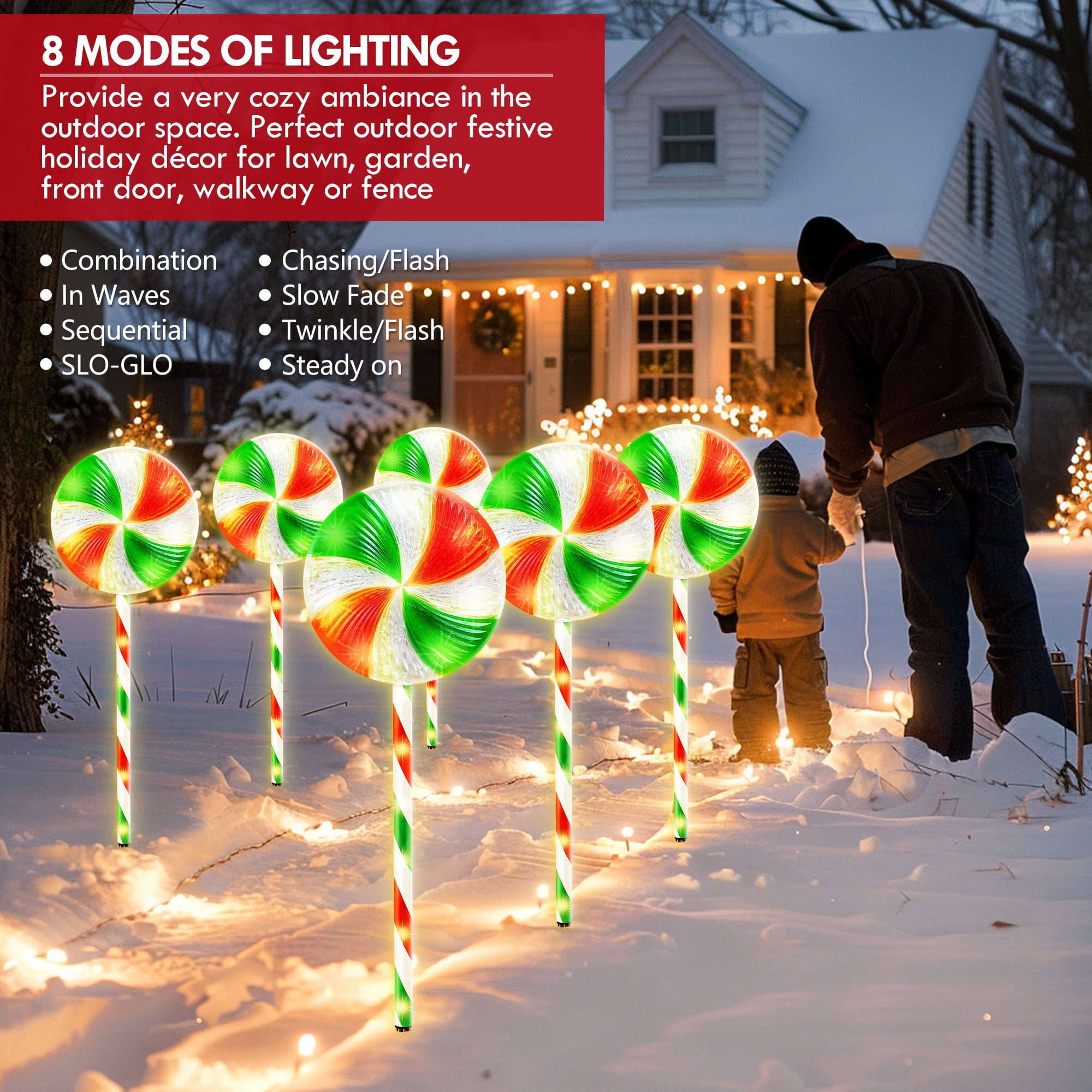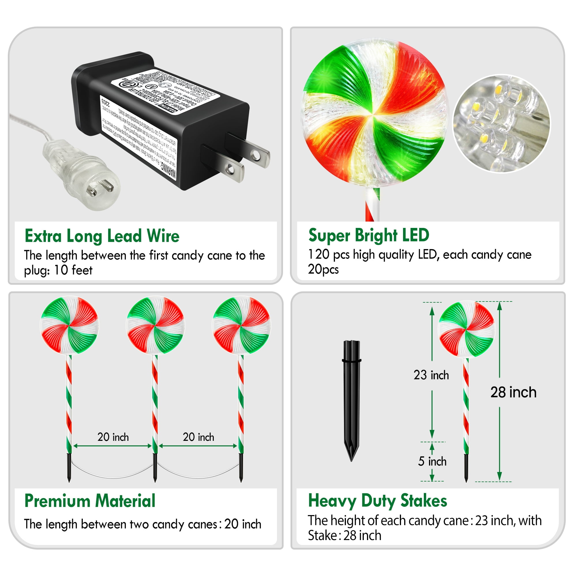 28 Inches Large Size Christmas Pathway Light with Lollipop Featuring with 120 bright warm white LED lights and a special lollipop topper, this Christmas lollipop light string adds a romantic and cozy touch to your holiday display day and night. With a total length of 28 inches including the sticks, these outdoor Christmas lights are larger than other products on the market. 120 Super Bright LED, 8 Lighting Modes, Can Be Steady or Flashing This upgraded lollipop Christmas pathway light offers 8 lighting modes, including steady on, combination, in waves, sequential, slow glow, chasing/flash, slow fade, and twinkle/flash. You can easily change the lighting mode using the plug. The flickering lights will make your holiday display even more attractive. Linkable End to End, Up to 3 Sets Linkable end to end, up to 3 sets can be connected together. If you purchase additional sets. With low voltage and high lumen LEDs, these Christmas candy cane pathway lights are suitable for both indoor and outdoor use. Easy to Set Up, Extra Long Enough for Outdoor Decor Designed for in-ground installation with ground stakes, these lights are perfect for decorating the walkway, lawn, yard, front door, garden, pathway, and more. With 10 feet lead power cable, each interval is 20 inch, this set of 6 lollipop light is long enough to be nicely spaced out. Colorful and Durable for Outdoor Christmas Display Made with premium materials, these outdoor Christmas pathway lights can be reused for years, making them environmentally friendly and cost-effective. The PCB features over-current, overcharge, and overheat circuit protection, ensuring safety and reliability during use. Specifications: Light Color: Bright Warm White Led Quantity: 120 Led Led of Each Candy Cane: 20 Led The Height of Each Candy Cane:23 Inch With Stick:28 Inch The Length Between Two Candy Canes:20 Inch The Length Between The First Candy Cane To The Plug: 10 Feet Q&A: 1. Is it link-able? can I put them together and use one plug? Yes, these candy cane lights is link-able, please find the user manual, follow the guidance to connect up. Don’t worry, it is very easy to assemble, each candy cane light has reserved connectors, just plug and play. 2. Do they blink or stay lighted? It has 8 lighting modes, all included, and you can choose whatever you like, which is suitable for your house display. F.Y.I, the switch is on the plug, and 1 button corresponds to 8 modes. 3. Are they led lights? Or just normal bulbs? They are LED light strings, brighter and safer than normal bulbs. Package Include: Set of 6 Christmas Lollipop Lights