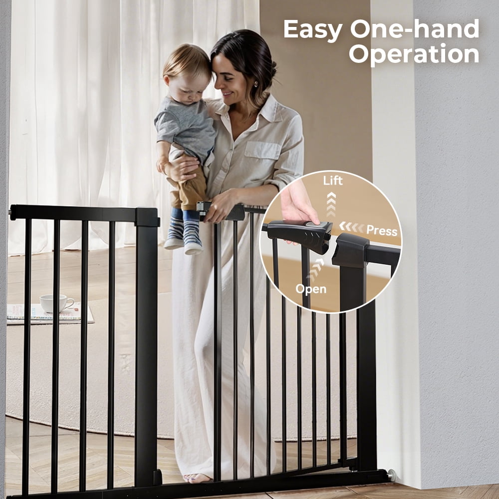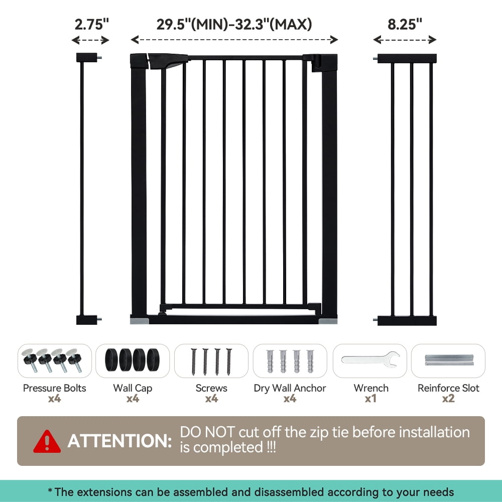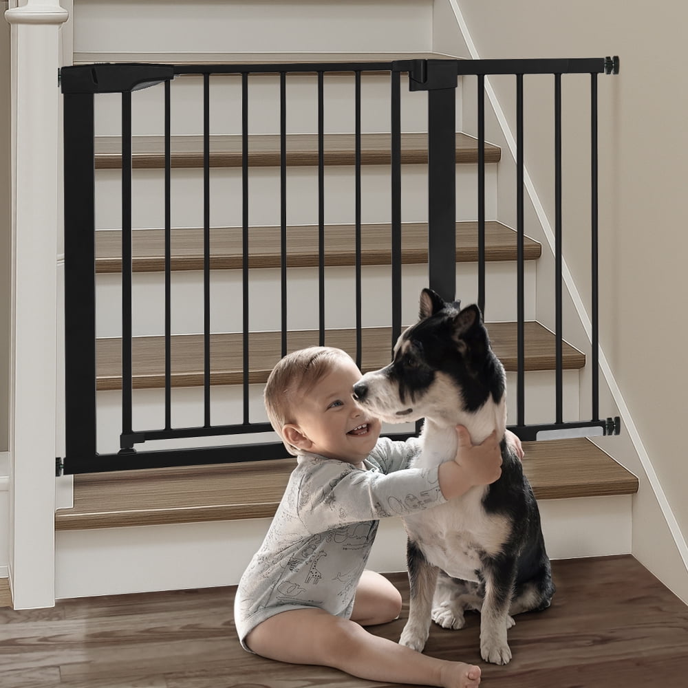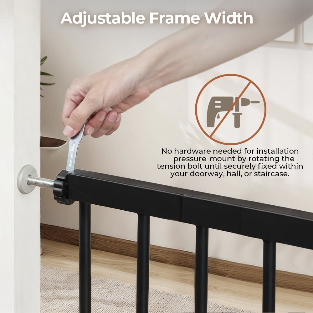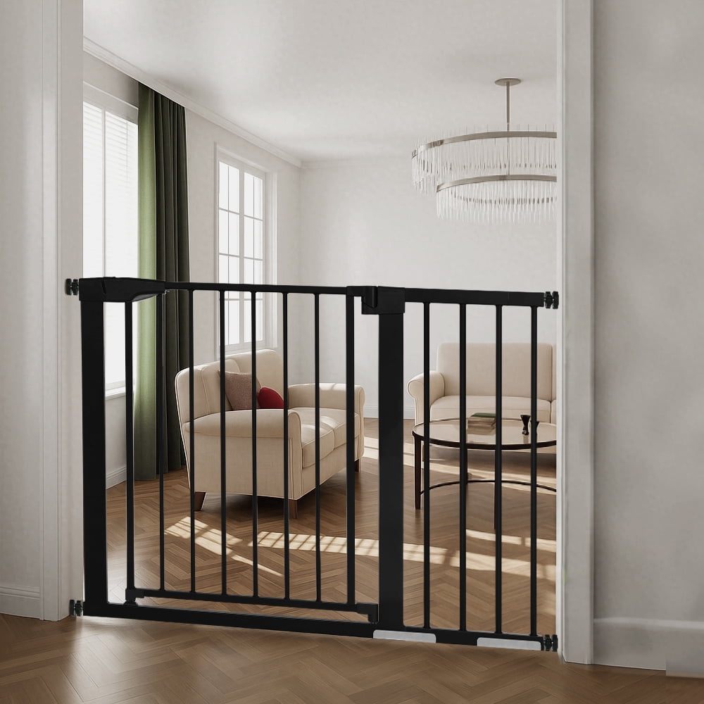Fits openings 29.5-43.3 inches Wide. Stand 30 inches tall. Ideal for doorways, hallways, the bottom of stairs, kitchens, laundry rooms, bedrooms, and playrooms. Notice: Must measure your openings before purchasing this extra wide gate. Upgraded Double-lock system, press two buttons to open the dog gate. No lift, no effort. No worries about forgetting to lock the dog fence, it will close automatically, easy one-hand operation. The large 23.6 in walk-thru gate makes it easier to walk. Heavy duty steel frame pet gate can defend against up to 100-pound impacts by your pets. Never worry your pets jump over the gate. Simple pressure-mounted installation requires no tools drilling. Friendly Warning: If using the baby gate at top of the stairs, hardware-mounted installation is mandatory. 1 x Main Gate with Door 3 x Extension Panels (2×2.75″ & 1×5.5″) 4 x Tension Bolts 4 x Wall Cups 1 x Wrench 4 x Screw Large & Extra Wide Extra Safety Auto Close Gate Durable Construction Easy to Install Color: White/Black Material: Steel, PP Fits Openings: 29.5″-43.3″ Wide Height: 30″ Walk-through Width: 23.6″ Pressure Mounted Installation: Yes Hardware Mounted Installation: Yes (hardware included) Upgraded Double Lock: Yes Shipping Weight: 14.8lbs