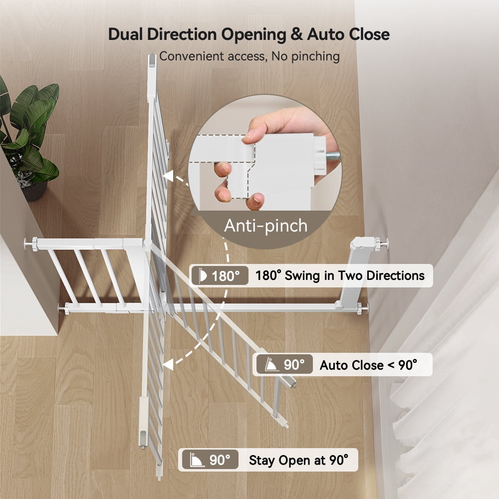 Our baby safety gate features a single-piece design that can accommodate aisle widths from 29.5 to 51.6 inches. With a movable door switch closure and a four-point adjustable bolt mounting, it promises a secure fit for a range of spaces. It is built to withstand a tensile impact of over 55 lbs and a pressure mounting force of over 33 lbs. The gate comes packaged in pieces for hassle-free initial installation. The gate structure includes an outer frame consisting of one square tube and an inner rail made up of four square tubes and a middle vertical round tube. The fence gap is designed to maintain level equidistance, ensuring vertical orientation and absence of horizontal bars. The gate rails, integrated with the structure’s extension pieces, provide superior solidity. Featuring an upper pivot with an internal spring resistance, the gate ensures automatic closure and structural stability with at least 180-degree rotation. The lower pivot position can also rotate 180 degrees. The pivot seat cover operates with vertical lift and lower mechanism, offering a smooth surface that is not prone to hand pinching. The gate includes an upper and lower linkage locking seat controlled by a button. Its dual-lock settings require either an upward lift or simultaneous pressing of two buttons to unlock, ensuring child safety. The lock is robust enough to withstand a force of over 55 lbs without getting damaged or disengaged. The baby safety gate helps keep your child away from unsafe areas and can effectively segregate pets from your living space. This makes it an excellent choice for households with babies and pets.