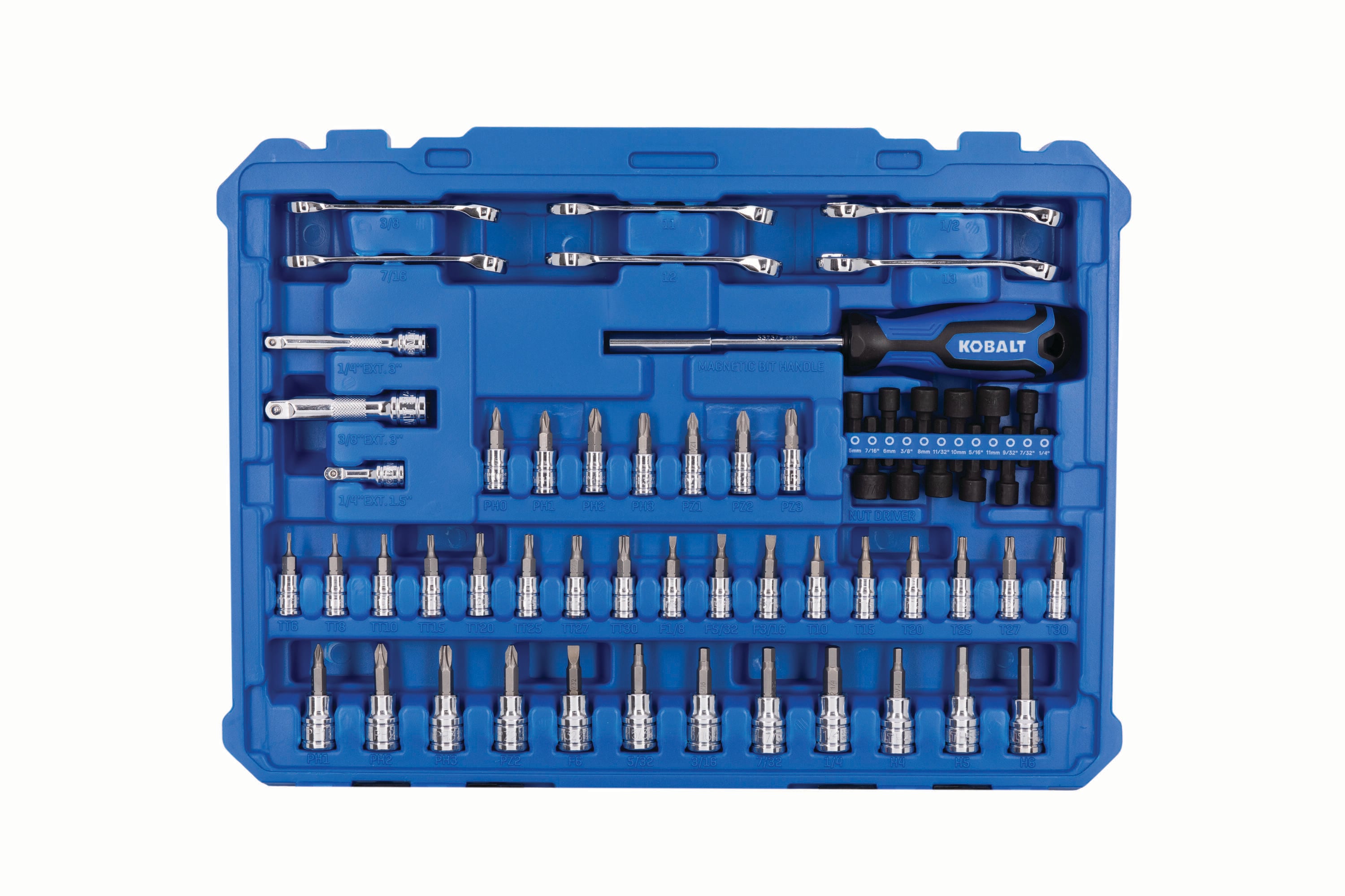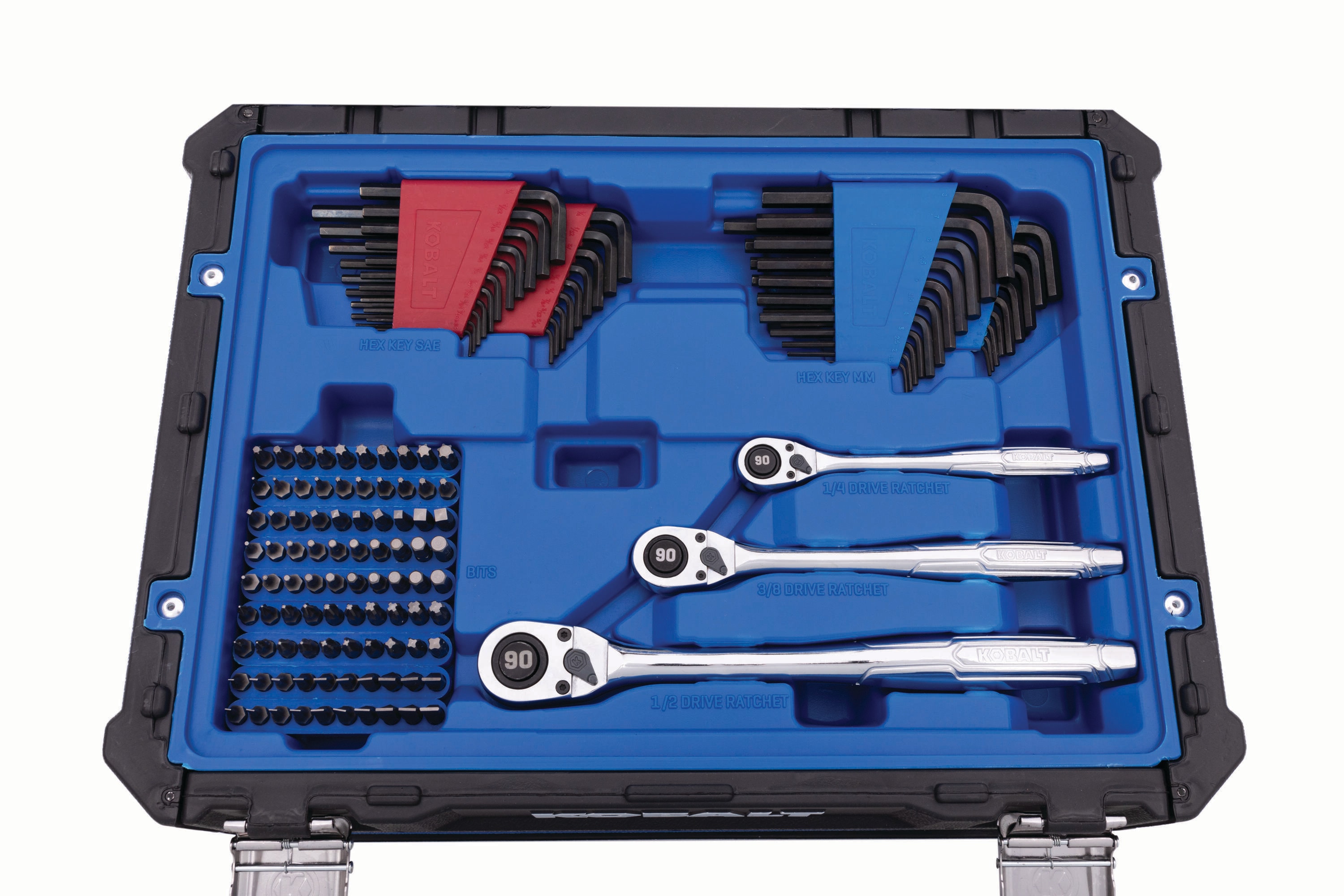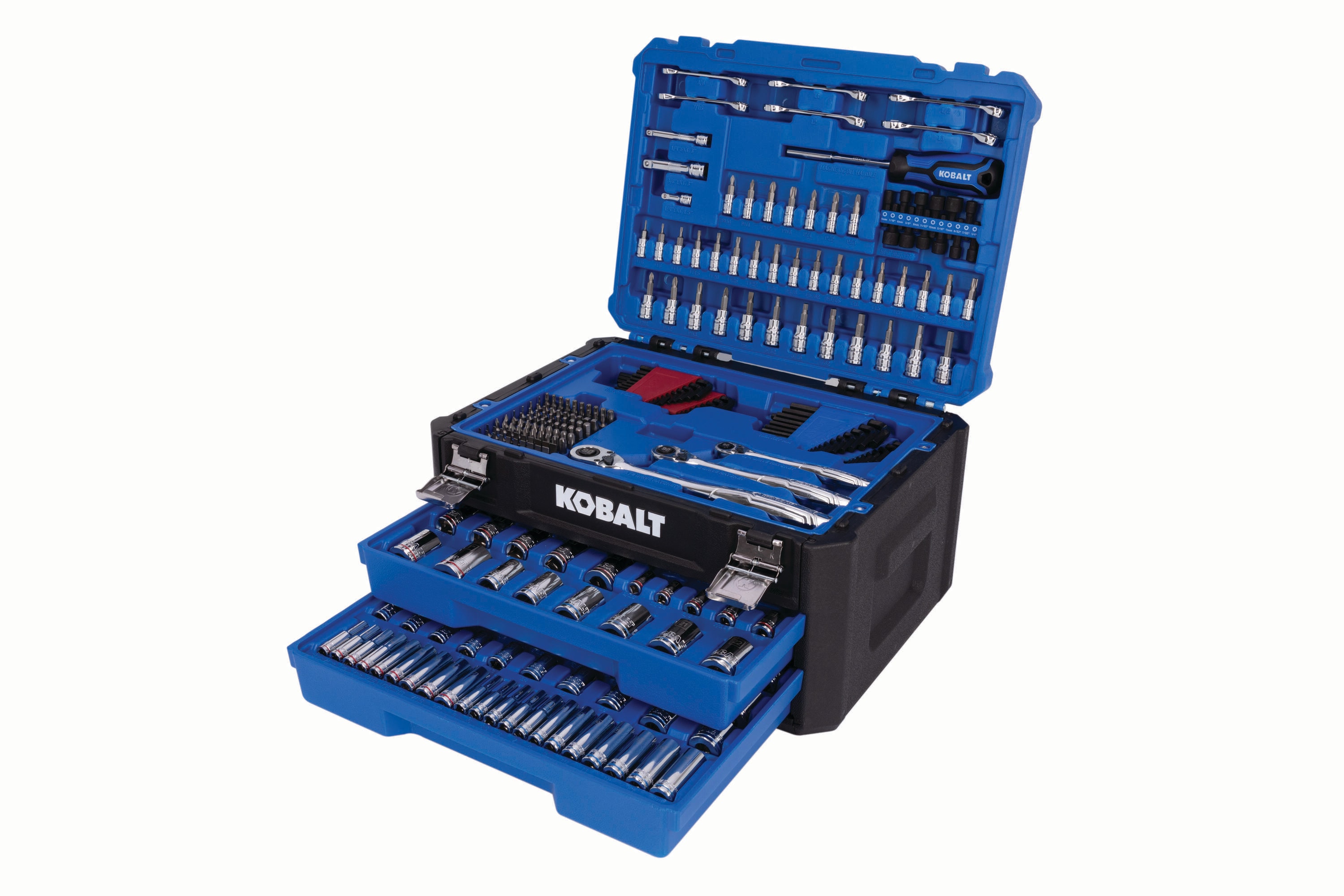 Kobalt’s 297-piece mechanic’s tool set features a wide assortment of tools housed in a two-drawer blow-molded case. Reinforced joints help the case withstand the rigors of day-to-day use. Larger drawer detents have been added to ensure the drawers stay closed during transportation. Metal clasps secure the case top and a rubber inlay has been added to the top handle for improved grip in wet conditions. The inside of the lid and both drawers feature individual compartments that securely hold all of the tools in a specific place. Every compartment has a stamped size callout that indicates what tool belongs there, helping keep things highly organized. As a skilled, do-it-all type of person, we wanted to provide you with high-quality tools to help you conquer a number of jobs. Whether you’re working on the go, in the garage or at home, you’ll truly be able to do it all.