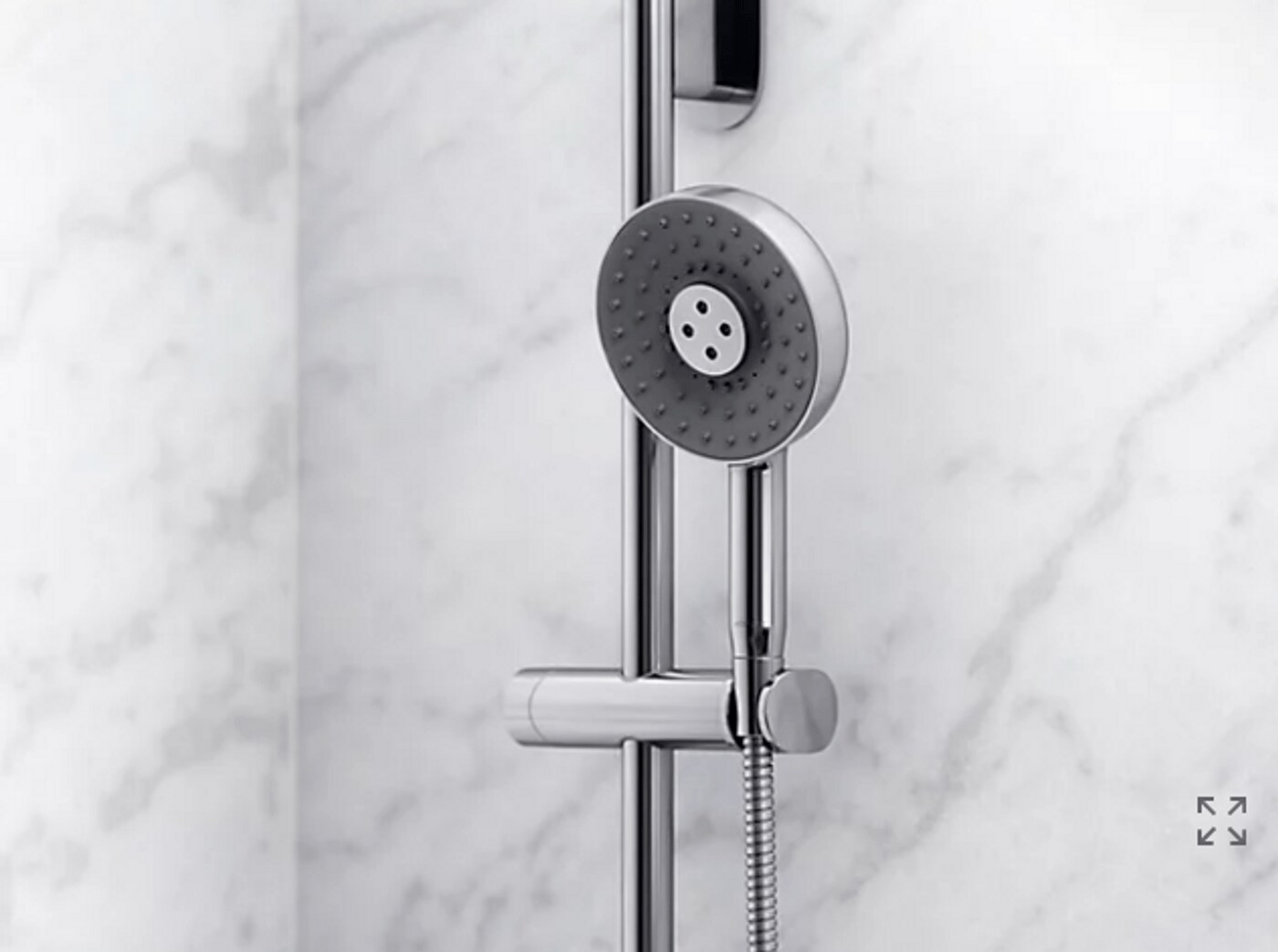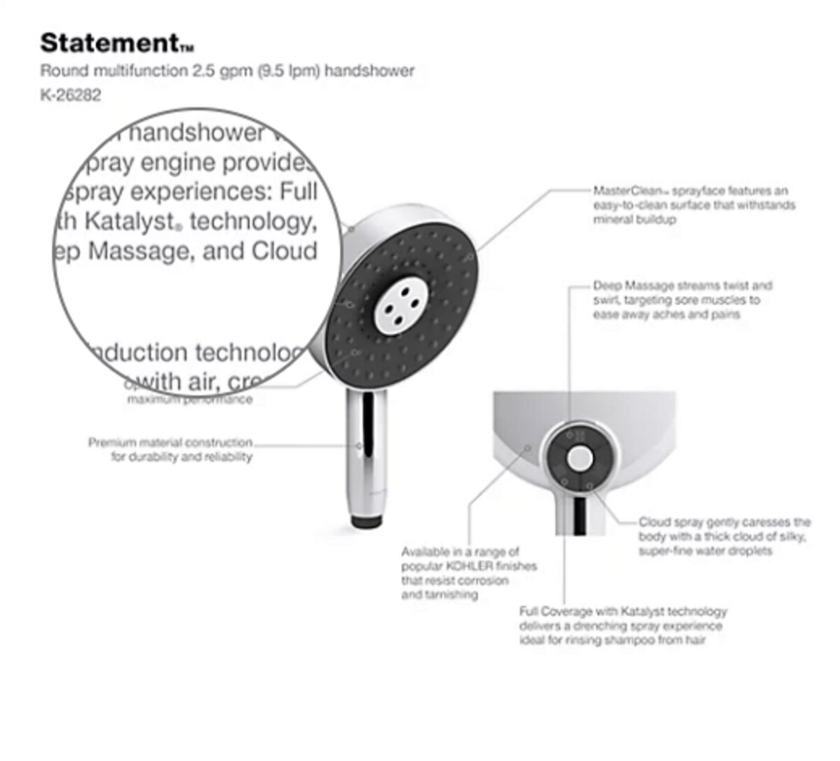 Enjoy the flexibility of a handshower that rinses, restores, and targets sore muscles—all at the touch of a button. The Statement round multifunction handshower lets you choose between Full Coverage with Katalyst air-induction technology for large luxurious water drops, a super-fine silky Cloud spray experience, and more focused, Deep Massage kinetic cross-streams. The three-function handshower features an intuitive mode selector button for switch the spray. Its sleek, minimalist design complements many ER faucets and accessories.
