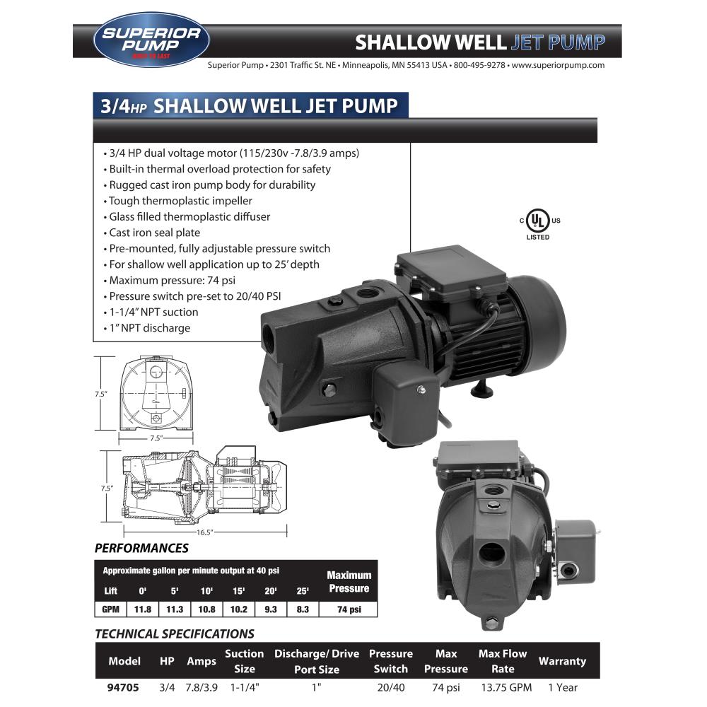 Superior Pump builds pumps that are truly built to last and are 100% factory tested. Superior Pump uses quality components including solid copper motor windings, heavy duty stainless steel jacketed shaft seals, double o-ring seals on motor plate, and electronically controlled split capacitors. Superior Pump model 94705, 3/4 HP dual voltage cast iron shallow well jet pump, will move water up to 25 Ft. of lift. This pump is UL/cu listed and backed by a 3 year warranty.