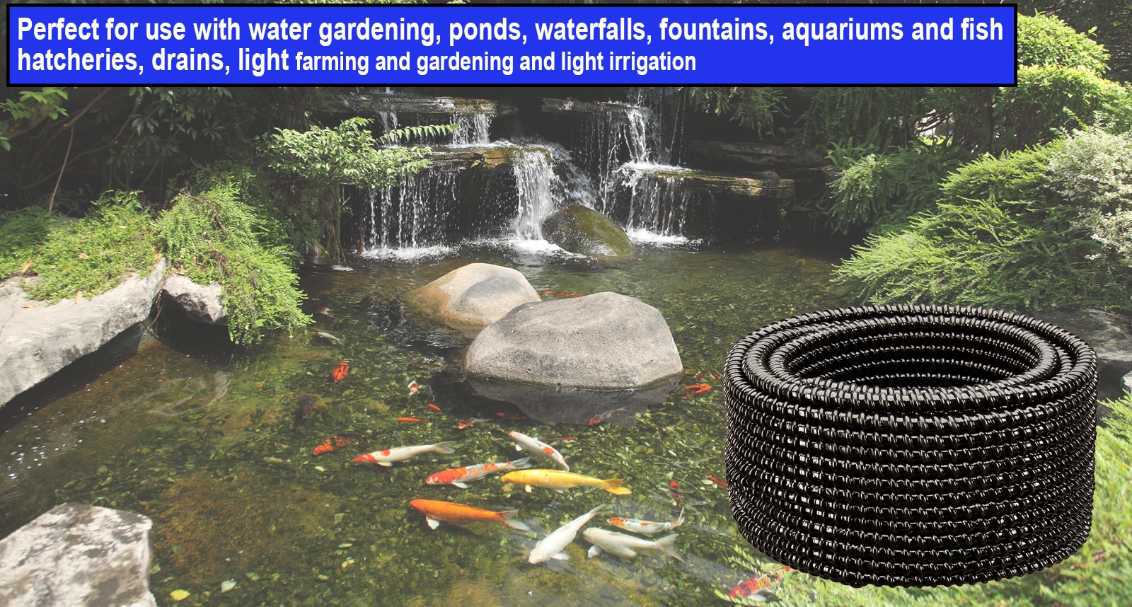 Our UL non-kink flexible PVC hose, commonly referred to as UL size, US size, UL non-kink, UL kink free tubing, UL water garden hose, UL pond tubing, and UL corrugated tubing is perfect for use with water gardening, ponds, waterfalls, fountains, aquariums and fish hatcheries, drains, light farming and gardening and light irrigation. This hose is designed to be used with barbed or insert fittings and appropriate clamps. The US or UL sized tubing is slightly larger than our MM or metric sized pond tubing. If you are not certain which size to order, it is usually better to order the UL size and build up your fitting or pump outlet since the MM size is smaller and may not fit your application. While it is not as strong and durable as our flexible PVC pipe, it is somewhat more flexible and lighter. It will not collapse due to back pressure or from reasonable weight from cover material or gravel. Corrugated on the outside for strength and smooth on the inside to speed water flow, reduce material build-up and reduce friction, this lightweight tubing can easily be routed in any direction necessary without the use of multiple fittings.