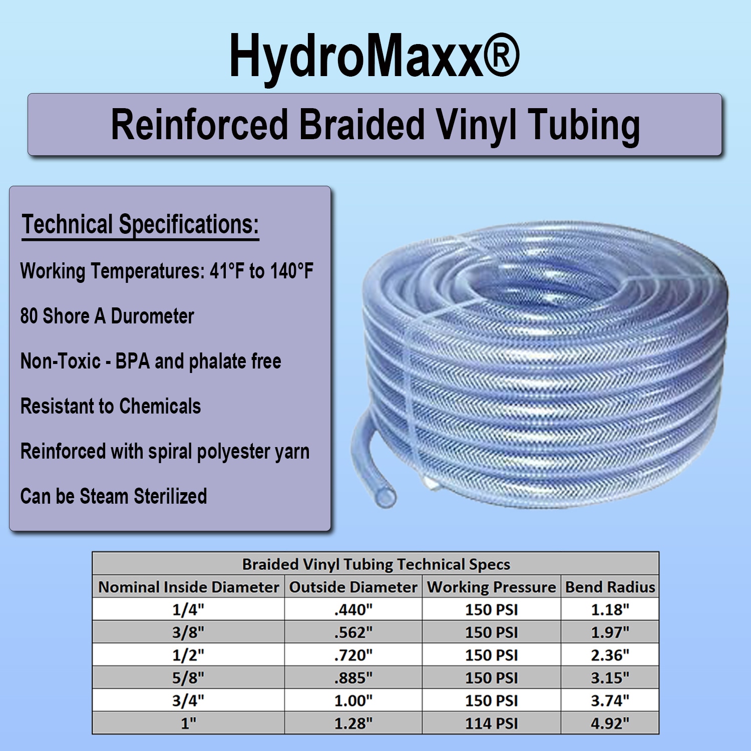 Our reinforced, non-toxic braided vinyl tubing has all of the same qualities as our clear, non-reinforced vinyl tubing product but can also handle medium pressure applications. It is formulated with clear PVC compounds, is boa free and reinforced with spiral polyester yarn. It is constructed with non-toxic compounds and the clear construction allows for visual confirmation of product flow and easy location of obstructions. Our clear braided vinyl tubing has been formulated to meet applicable 3A and NSF criteria and may be steam sterilized. Manufactured to have a smooth interior and exterior, our vinyl tubing prevents solid or sediment accumulation and is relatively impervious to bacterial and pathogenic action. It is lightweight, strong, yet very flexible and can easily stand up to situations requiring rough handling while maintaining dimensional stability. In addition, because it’s reinforced with a special thread, it can handle applications that require more pressure than our standard vinyl tubing. Braided vinyl tubing is lightweight, self-extinguishing, non-marking and resistant to chemicals. Trimming or cutting is simple and can be clamped using hose, wire or ratcheting clamps using barbed fittings or connectors.