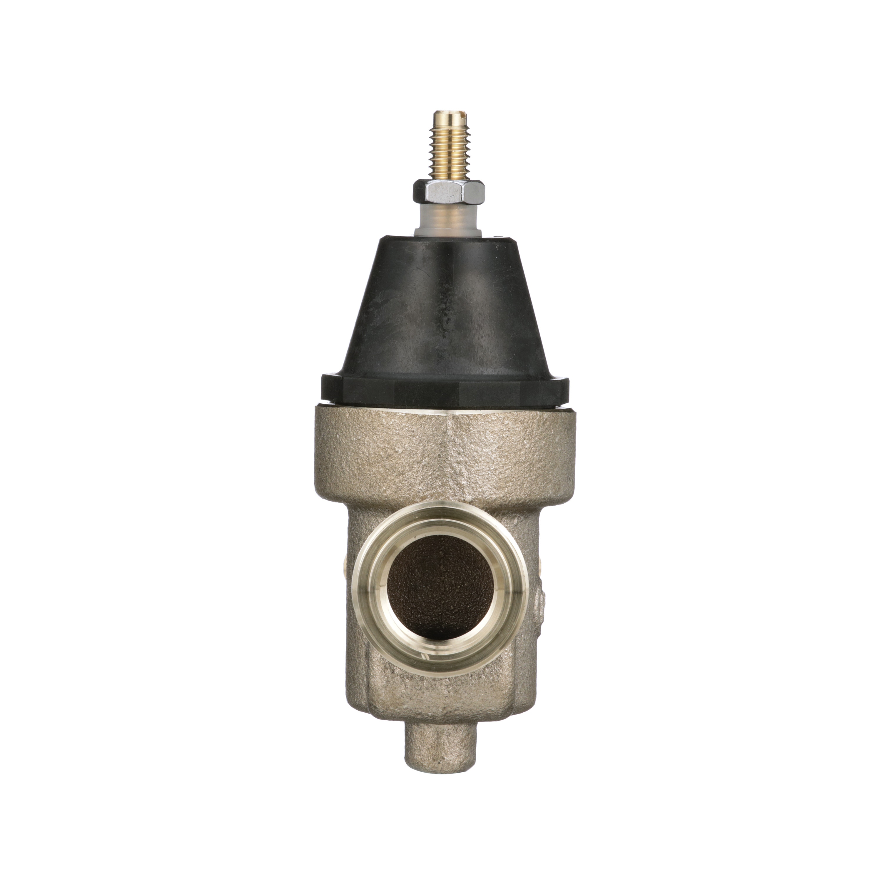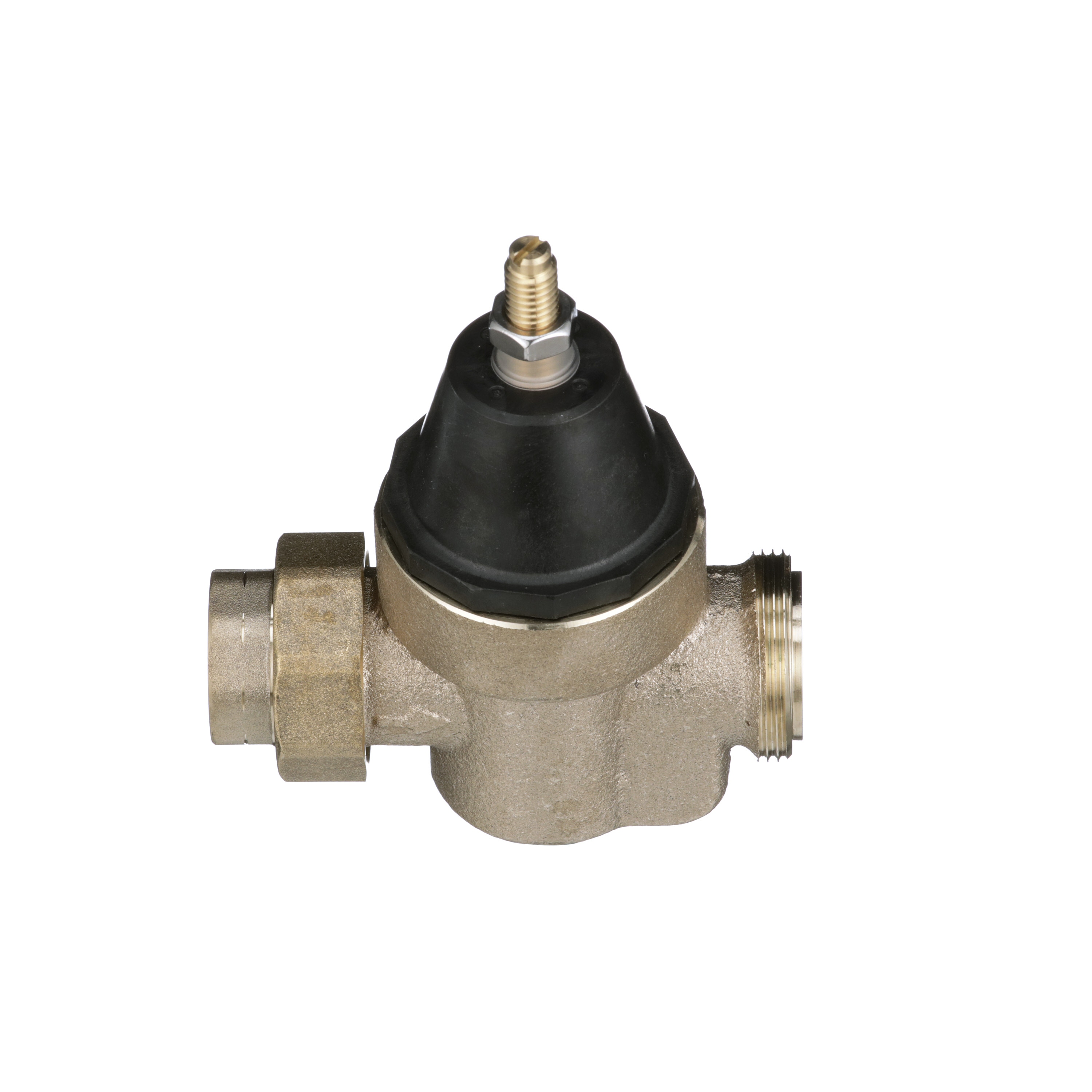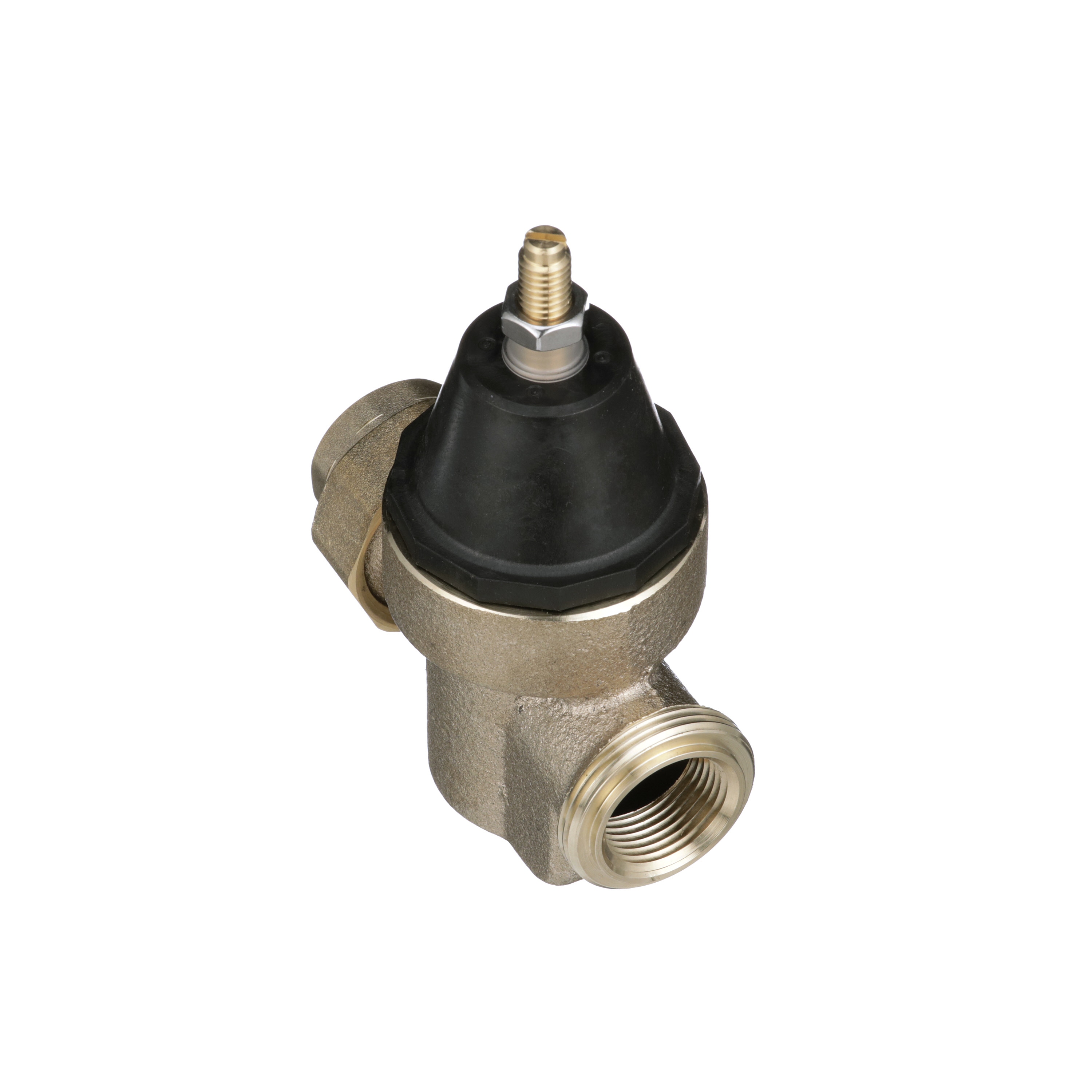 This 3/4 In. water pressure reducing valve is designed to reduce incoming water pressure to protect plumbing systems and reduce water consumption for commercial, industrial and residential applications. It consists of a lead free brass body construction, Npt threaded union inlet and Npt female outlet connection, stainless steel integral strainer, thermoplastic seat module, thermal expansion bypass, and a sealed spring cage for waterworks pit installations. The temperature range is 33 to 180 degrees F (0.5 to 82 degrees C). The pressure range can be adjusted from 25 to 75 PSI (172 to 517 kPa) with the standard setting at 50 PSI (345 kPa).