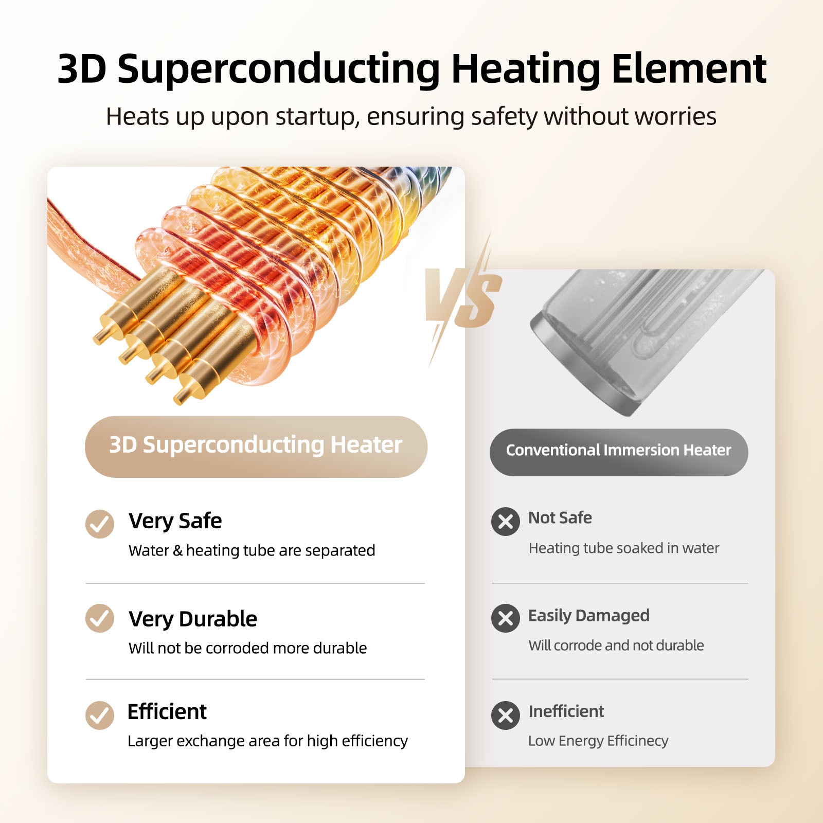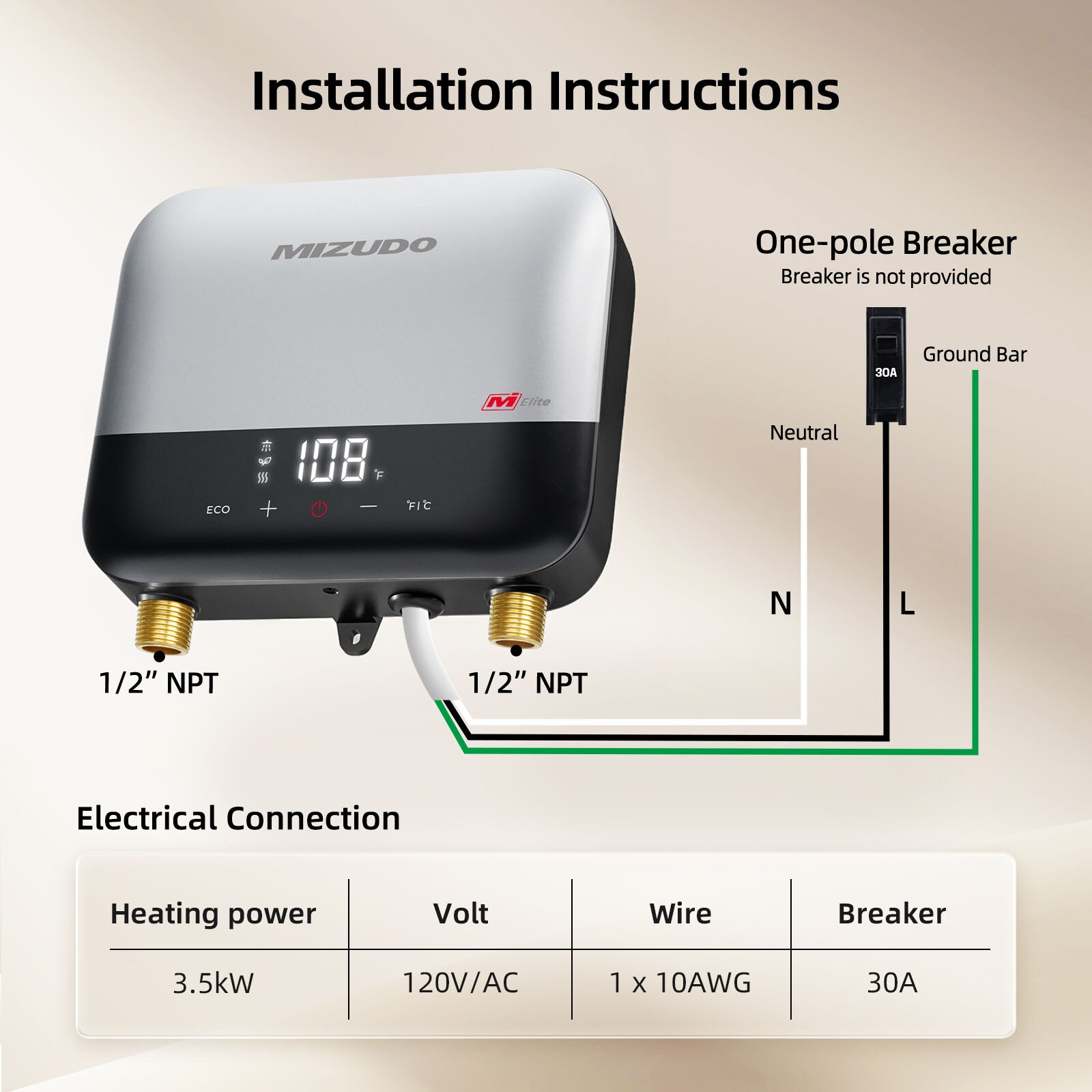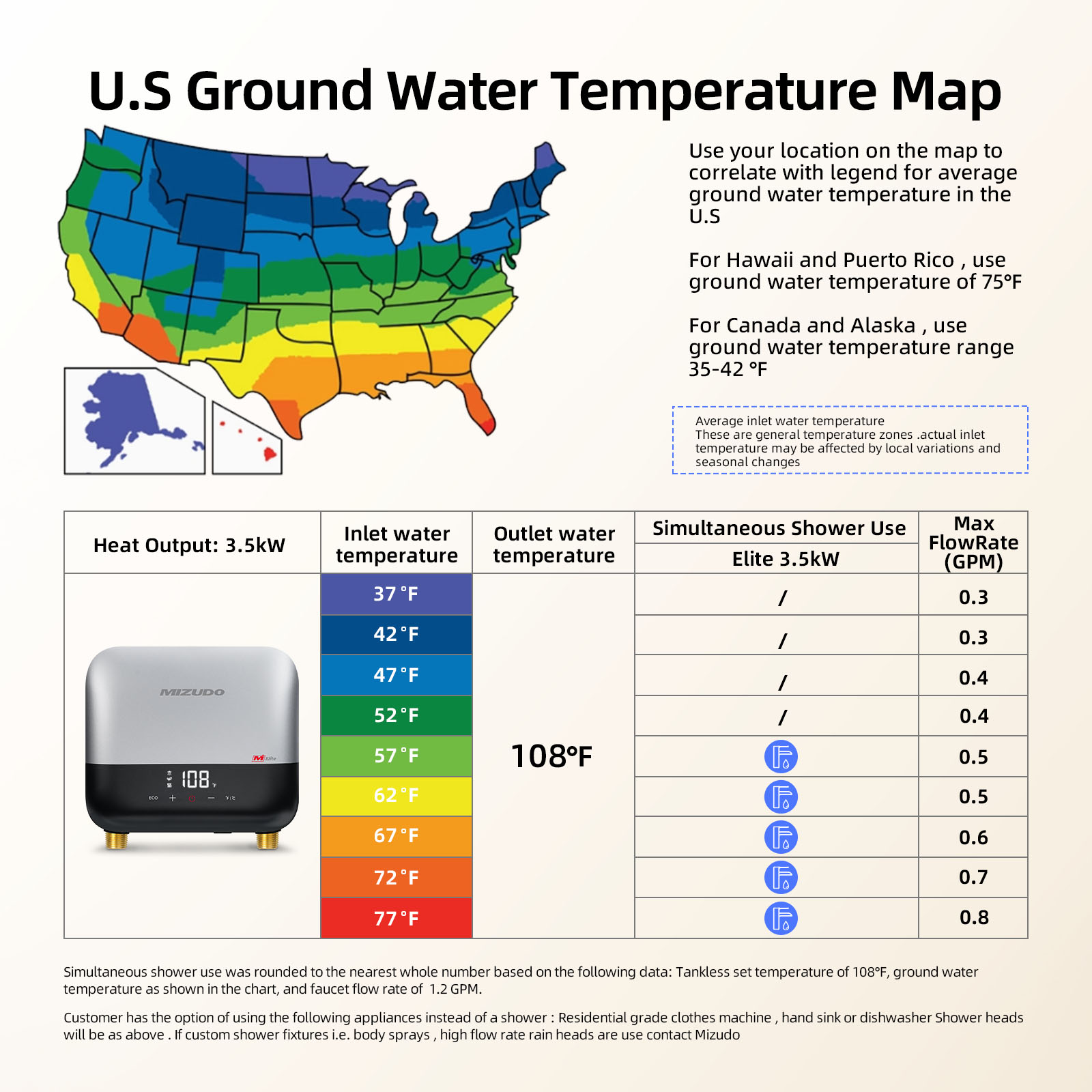 MIZUDO electric tankless water heater is equipped with a digital display, touch panel, powered by power. Users can customize the hot water temperature according to their needs. Not recommended for inlet temp lower than 57F, since faucet recommended GPM is 0.5 GPM.