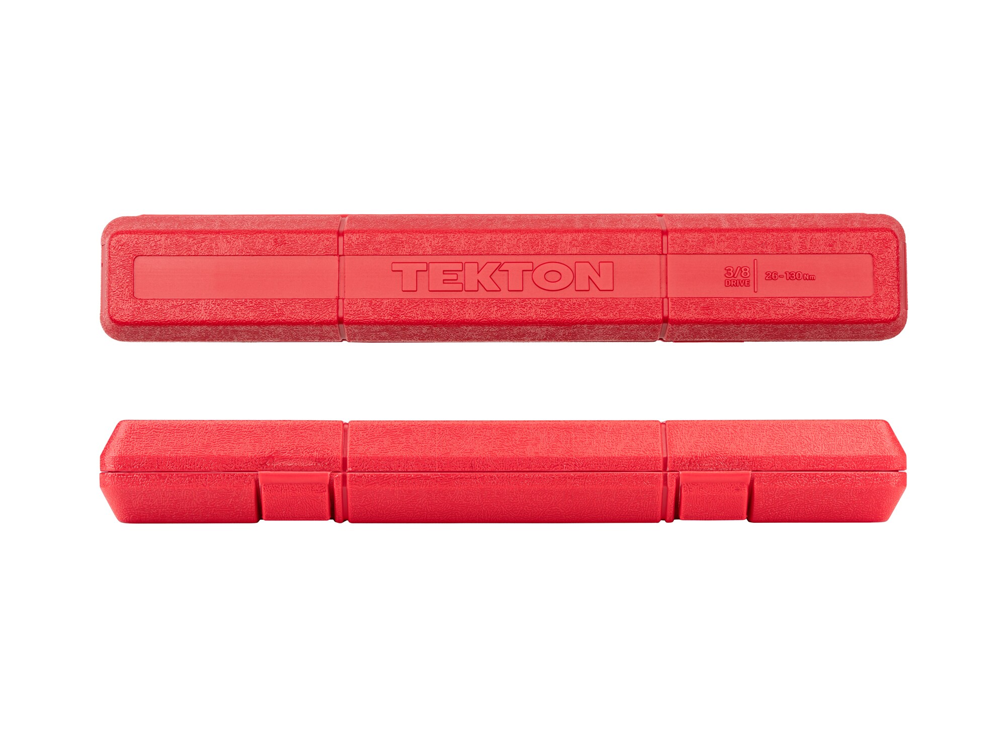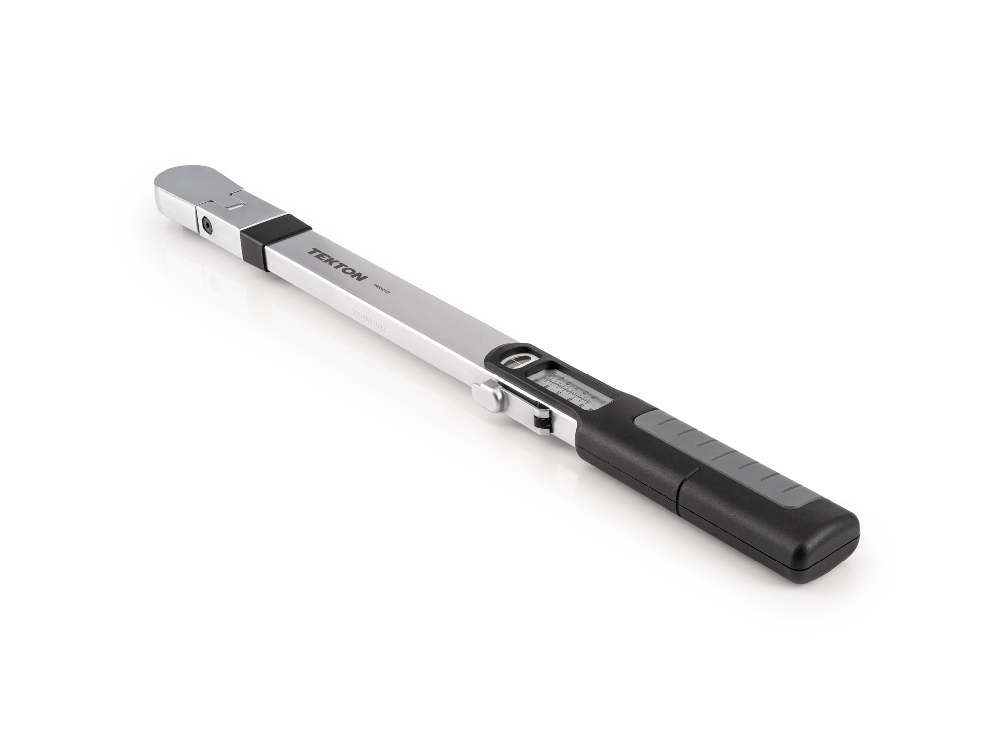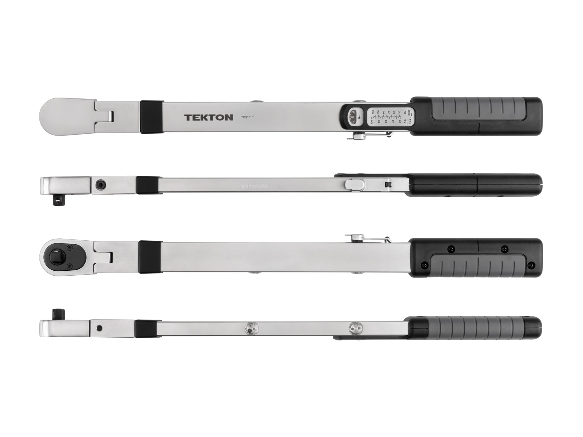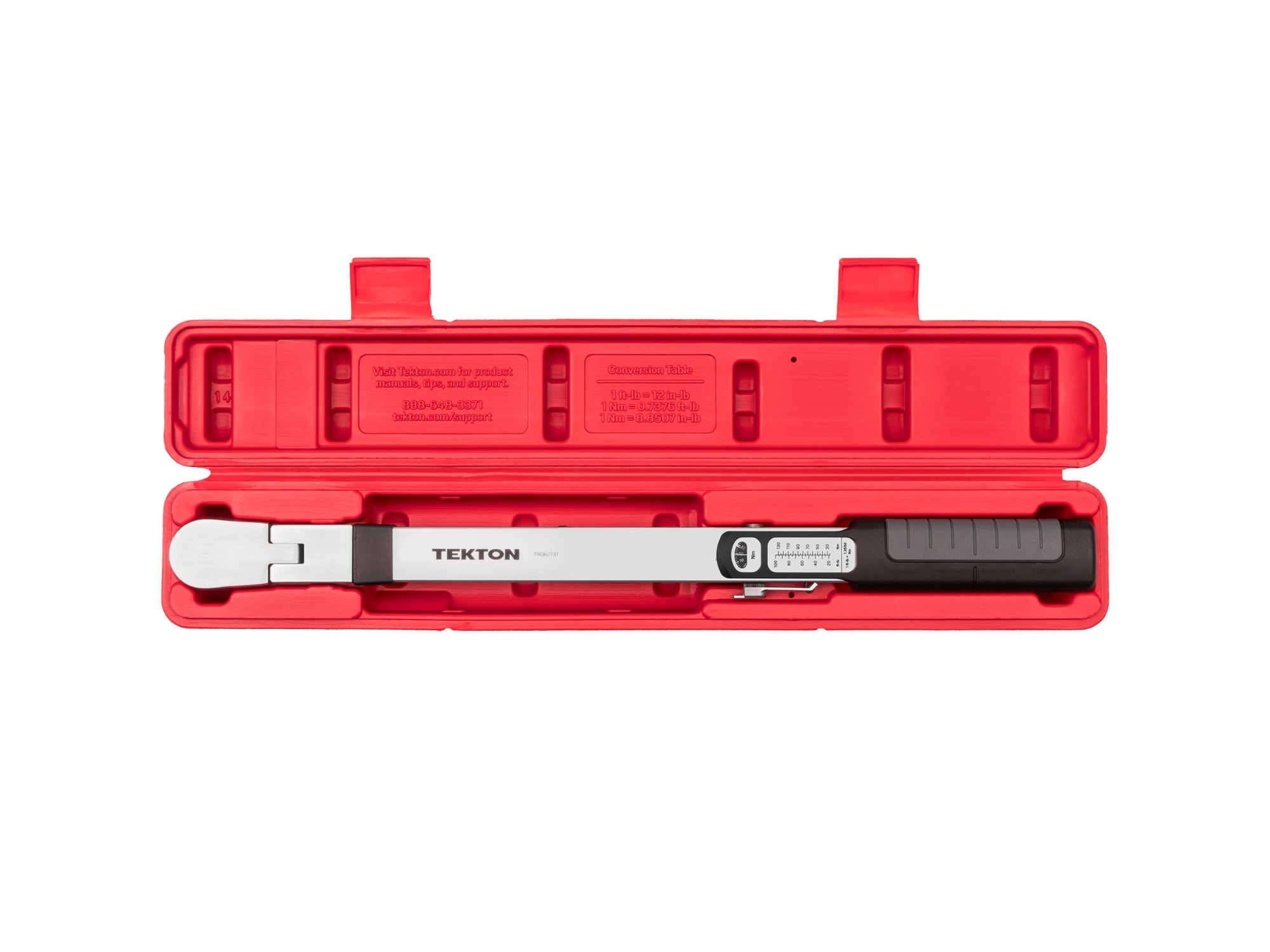 Tekton 72-Tooth Split Beam Torque Wrenches are easy to read and easy to set. Quickly turn to the desired torque value with a smooth thumbscrew adjustment. Teeth inside the cover lock the torque setting in place while you are using the wrench. Because there’s no internal tension when the wrench is at rest, you don’t need to turn it to the lowest setting for storage. Each Tekton Split Beam Torque Wrench is calibrated according to the ASME B107.300-2010 standard. The detailed test results are recorded on the included certificate. The certificate includes the initial accuracy, expected future accuracy, and the wrench’s serial number. All torque wrenches lose accuracy with repeated cycles. The expected future accuracy information helps you evaluate when recalibration may be necessary. Each wrench is engraved with a unique serial number that corresponds to its certificate of calibration. The conversion scale on the handle of the torque wrench offers a quick reference for converting ft.-lb to Nm. The handle is made from an impact-resistant nylon with nonslip polypropylene grip. The head of the torque wrench has a 10-degree flex joint, offering clearance to work around nearby obstructions. As with any flex-head torque wrench, some accuracy is lost when the handle is not in the straight position, so this feature should only be used when needed.