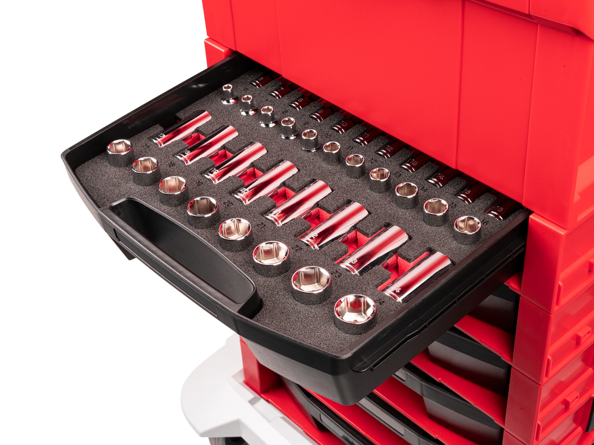 This Tekton socket set is part of the L-BOXX® Stacking Organization System and connects with all other components in the L-BOXX family of products, providing virtually infinite options for configuring your own custom organization system. The set includes 3/8 inch drive 12-point standard and deep length sockets in an open top drawer and a stacking drawer rack. The handles on the side of the stacking drawer rack provide stability when latching components together. Press both side handles in and lift up to remove the drawer rack from the stack. The open top drawer offers quick access to drawer contents without taking apart your organization stack. To remove the drawer from the rack, lift up to pull the drawer out. Included write-on labels allow for easy identification of drawer contents. The laser-marked foam layouts are designed and cut in our Grand Rapids, Michigan manufacturing facility to optimize for high density, easy access, and secure fit. The foam is made of two color-contrasting layers that are permanently bonded together with a heat lamination process, making any missing tools immediately visible.