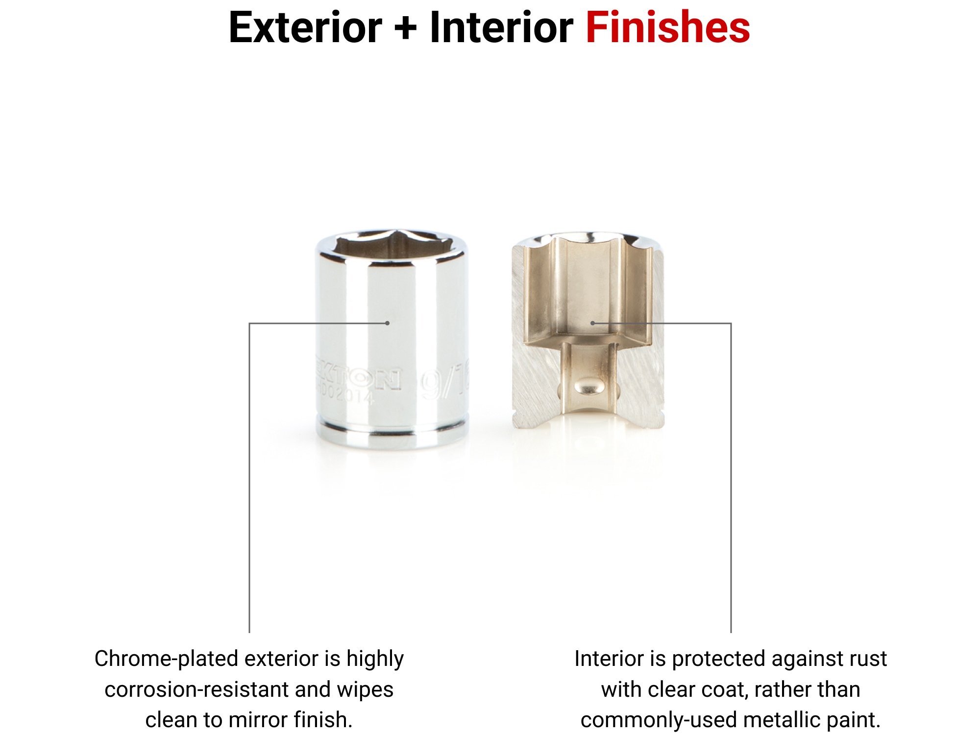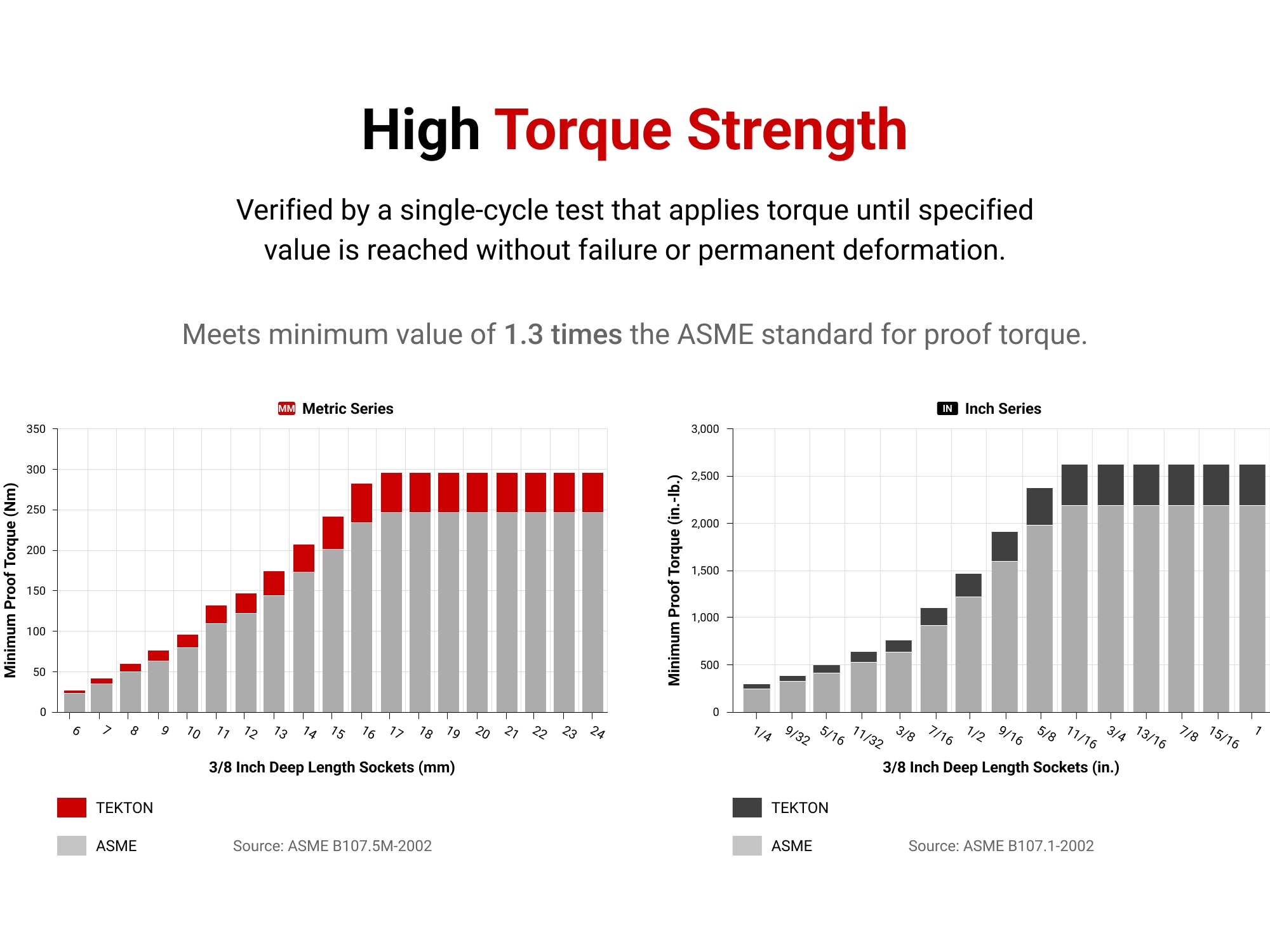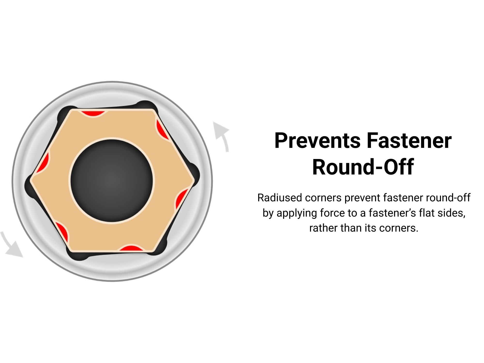 TEKTON 6-point sockets are ideal for working with hex-shaped fasteners. They’re designed to grip the sides and not the corners of the fastener heads, which prevents round-off. Their extended length allows the deep socket to fit over long fasteners and reach into recessed areas. The large, die-stamped markings are permanently impressed into the material and optimized for readability.