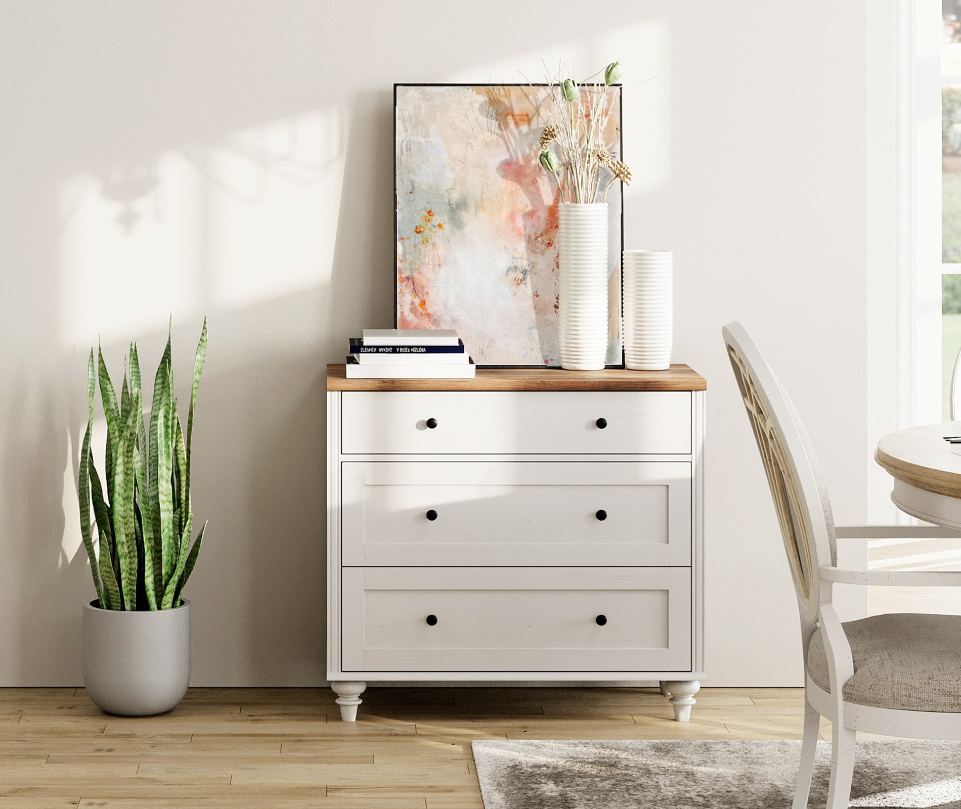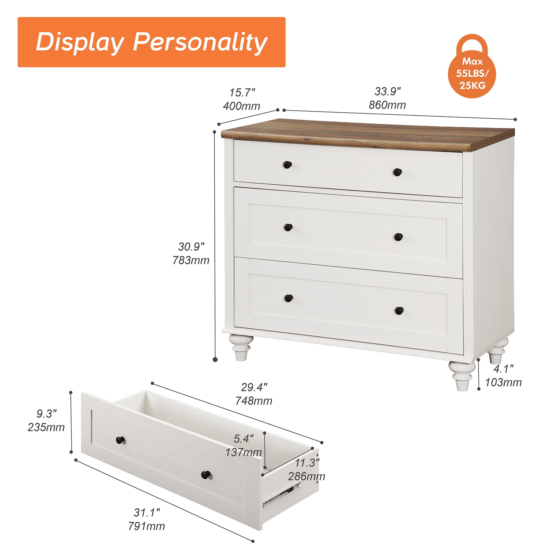 Multipurpose Dresser: The 3 drawer dresser with distresser suface is very classic and elegant which blends in easily with any decor. It is ideal as a baby dresser, kids dresser and console table, etc.Overall Dimension: 33.9”L×15.7”W×30.9”H Ample 3 Storage Space:Featuring 3 deep large drawers, the bedroom dresser is great to organize your clothes, blankets, etc. The white dresser maximizes the vertical storage space while keeping your daily essentials and display decorations in order. Humanized Design:With solid wood round gourd furniture legs add beauty and ensure the stability of the storage cabinet.And an additional anti-tipping kit is also included for added safety. Total Weight Capacity: 88 lbs.The distance between the bottom plate and the floor is large enough for the robot vacuum cleaner to pass. Easy to Assemble:It comes with pre-assembled drawer glides so you can put it together easily.Equipped with smooth metal drawer slides and handles, the drawers of the closet dresser are effortless to open and close.