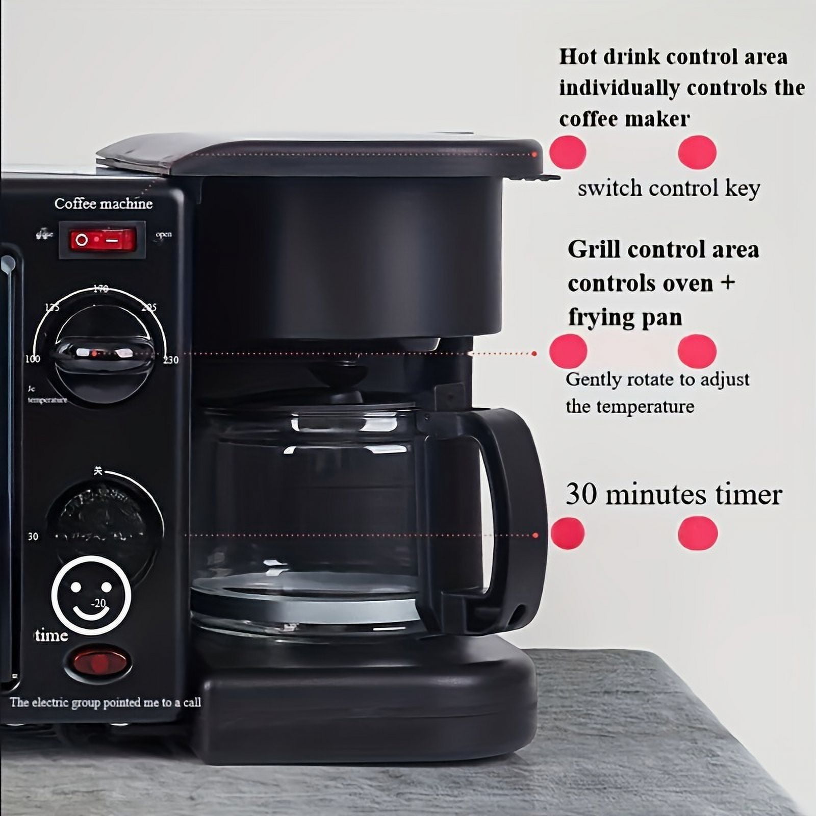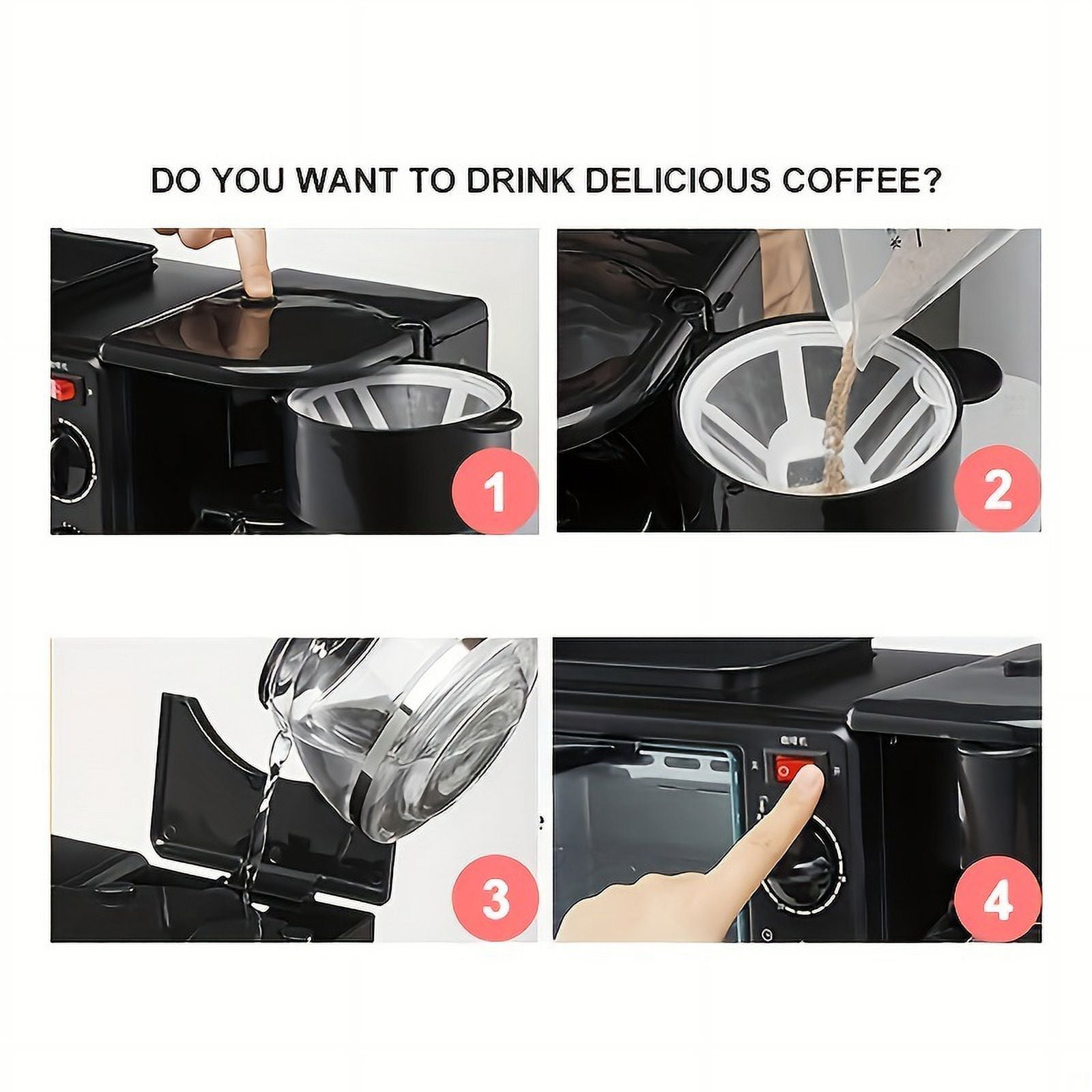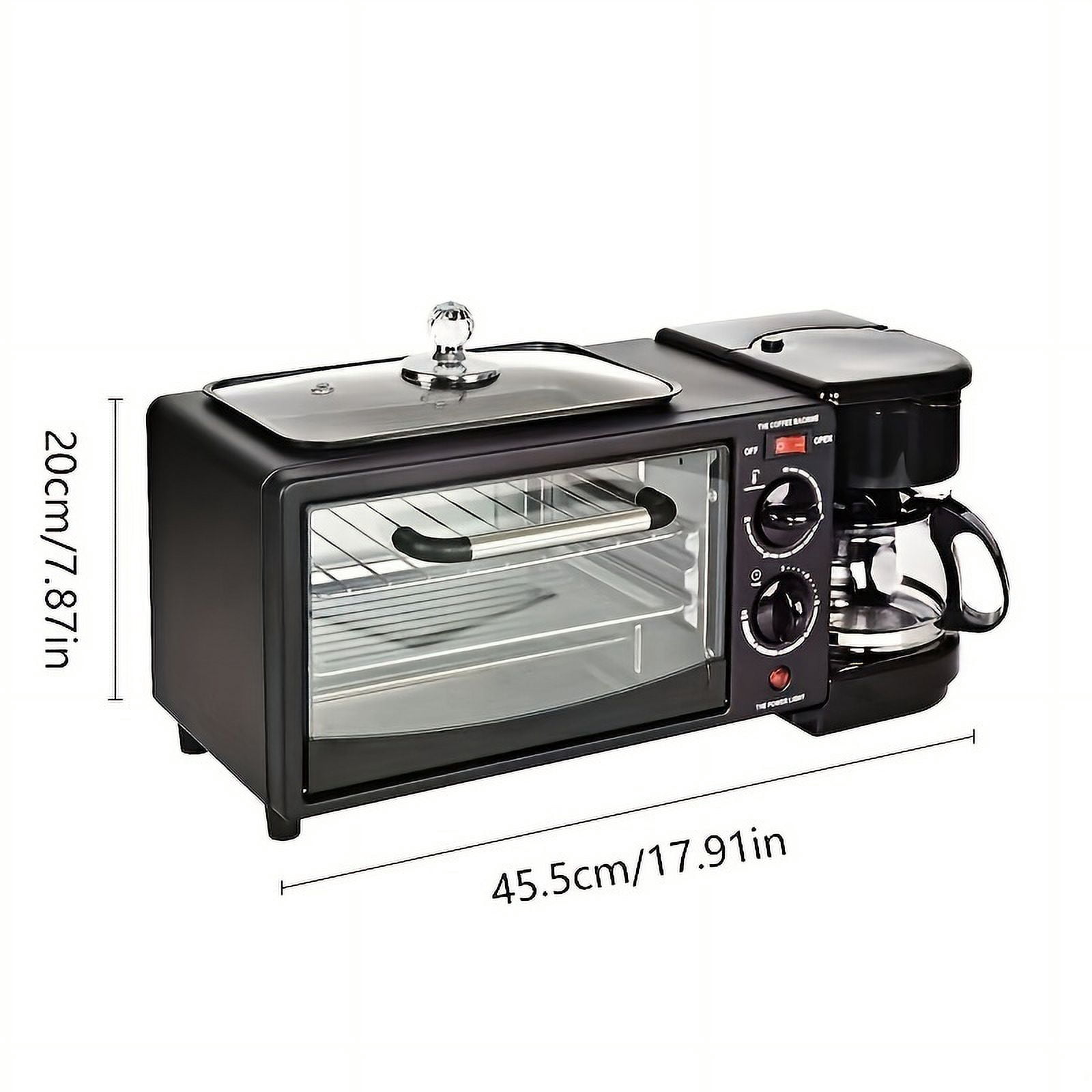 Maestri House 3-In-1 Breakfast Station- Coffee Maker, Toaster Electric Oven and Electric Griddle Combo Description: All-in-one Breakfast Solution: Start your day off right with our versatile breakfast station. This 3-in-1 appliance includes a 4-cup coffee maker, a large griddle for cooking eggs, bacon, and pancakes, and a toaster oven that can hold up to four slices of bread. Space Saver: Our compact breakfast maker machine is designed to save countertop space while providing a convenient solution for cooking your favorite breakfast meals. The stylish design makes it a great addition to any kitchen decor. Coffee Maker: This coffee maker brews up to 4 cups at a time in minutes so you can enjoy a cup of coffee while your food cooks. It comes with a glass carafe, a coffee scoop, and a reusable filter. Family-Sized Griddle: The large non-stick griddle offers plenty of room to fry eggs, omelets, pancakes, sausages, bacon, hashbrowns, and other breakfast foods. It also comes with a glass lid. Cleaning: If cooking is not simple enough, the oven tray, wire rack, bread crumb tray and non stick baking tray are removable, making cleaning easier.