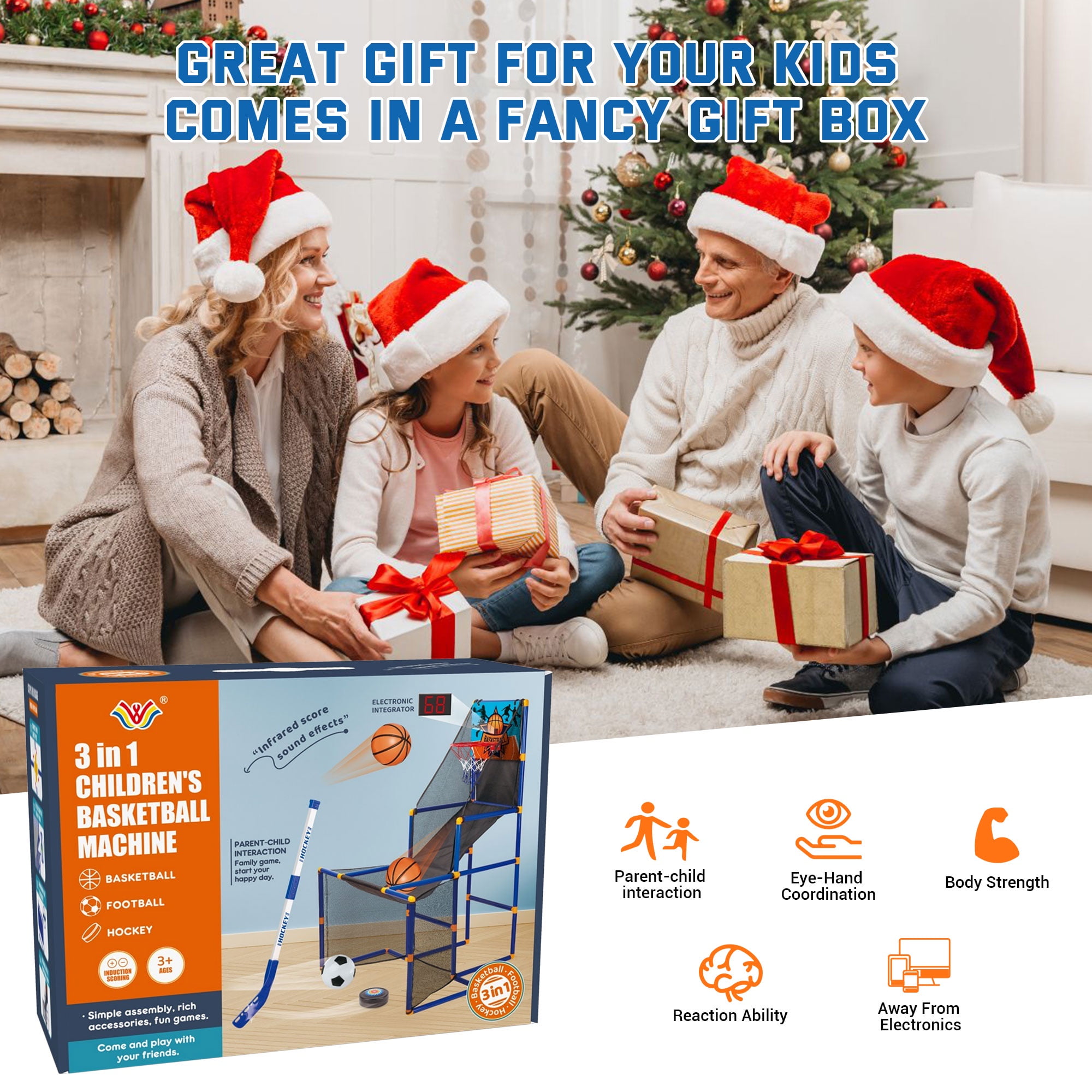 3-in-1 Kids Arcade Basketball, Hockey, and Soccer Game Set, Indoor Kids Basketball Hoop for Shooting Game Includes 4 Balls, Football, Hockey, Air Pump. Made from safe plastic, sturdy with a thick solid stand and high toughness shooting hoop, stable and durable. This Basketball Hoop Arcade Game Sports Toys is the Best Birthday Gift / Chrismas Gift / Holiday Gift for Boys and Girls 3-6 Years Old. Your playroom or the kid’s room will become the center of fun with this cool basketball hoop indoor! – 1️⃣【Triple the Fun】: This 3-in-1 arcade game set includes basketball, soccer, and hockey, providing endless entertainment for your little ones. Perfect for boys and girls. – 2️⃣【Complete Set】: Comes with 3 high-bounce basketballs, a soccer ball, a hockey puck, 2 hockey sticks, a pump, a net bag, and a basketball board with an electronic scorer. – 3️⃣【Electronic Scoring with Sound Effects】: The backboard features an electronic scorer to keep track of successful goals, complete with cheerful sound effects. Note: Requires 3 AAA batteries (not included). – 4️⃣【Durable & Easy Assembly】: Made from thick, harmless PVC tubes, this game set is easy to assemble without tools. The shatterproof backboard and high-density blocking net ensure long-lasting fun. – 5️⃣【Indoor & Outdoor Play】: Suitable for indoor use in homes and daycares, as well as outdoor play in backyards and gardens. Remember to bring the set indoors after use to maintain its condition. – 6️⃣【Perfect Gift Idea】: Packaged in an attractive gift box, this set encourages kids to step away from screens, engage in physical activity, and improve their coordination and reaction time. Why You’ll Love It: – 1️⃣Versatile Play: Three sports in one set keep kids entertained for hours. – 2️⃣Interactive & Engaging: The electronic scorer and sound effects add excitement to every game. – 3️⃣Safe & Sturdy: High-quality materials ensure safe and durable play. – 4️⃣Easy to Assemble: No tools are required for setup, making it hassle-free for parents. Specifications: – Item Name: Indoor Kids Basketball Hoop – Material composition: PP; High Density Blocking Net – Packing size: 12.60″ x 17.12″ 6.3″ – Weight: 10lbs – Unfolded size: 36.61″ x 35.43″ x 55.51″ – Product usage places recommendations: courtyards, basements, storage rooms, living rooms, rooms, primary school playgrounds, gymnasiums – Kids basketball hoop suitable for over 3 -6 years old What’s in the Box: – 1️⃣Kids Arcade Basketball(3 in 1) – 4️⃣ High-Bounce Basketballs – 1️⃣ Soccer Ball – 1️⃣ Hockey Puck – 2️⃣ Hockey Sticks – 1️⃣ Ball Pump – 1️⃣ Net Bag – 1️⃣ Basketball Board with Electronic Scorer