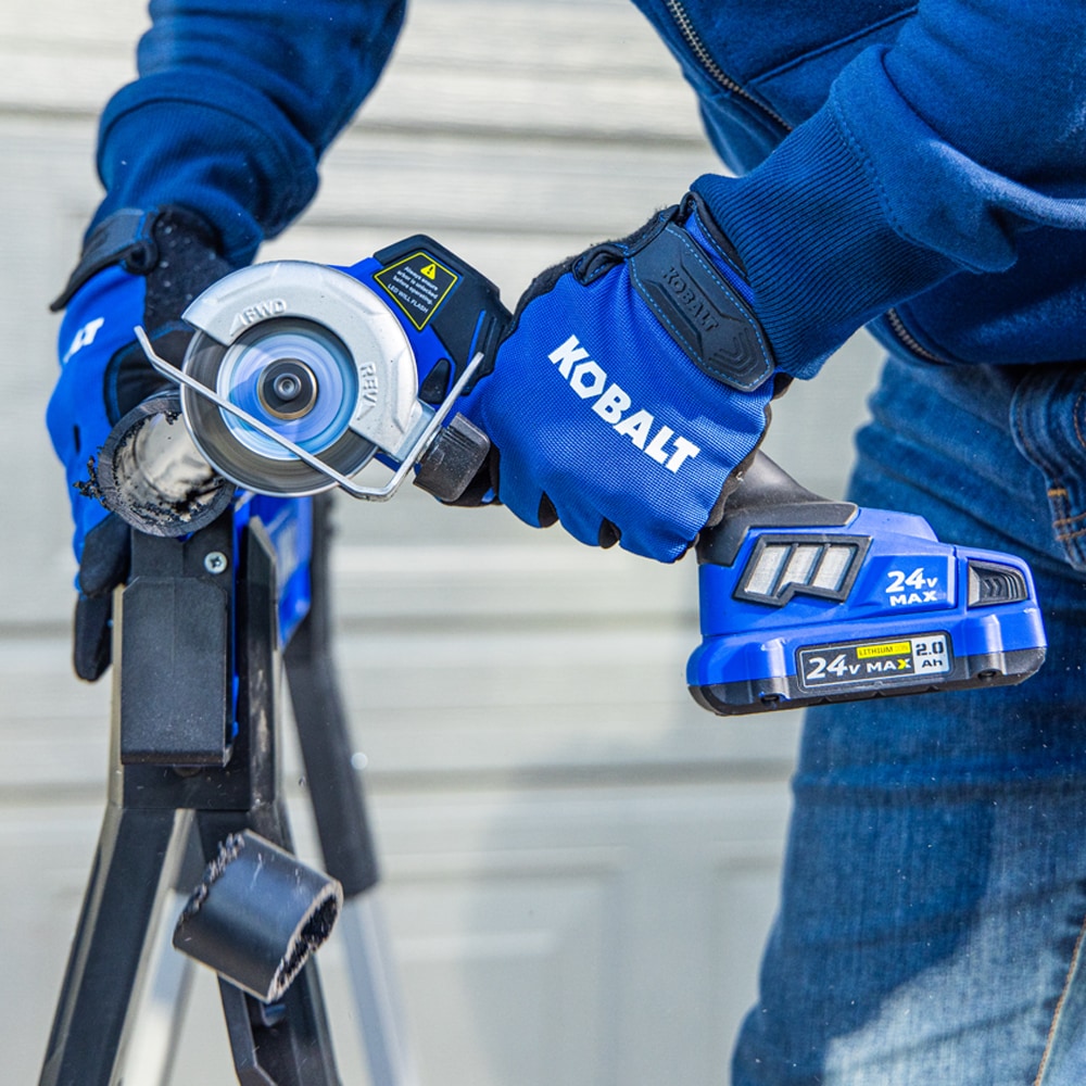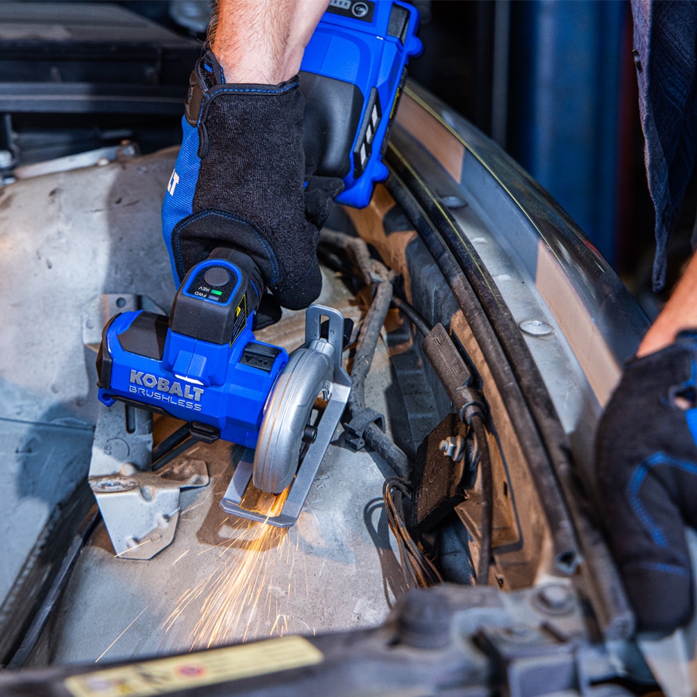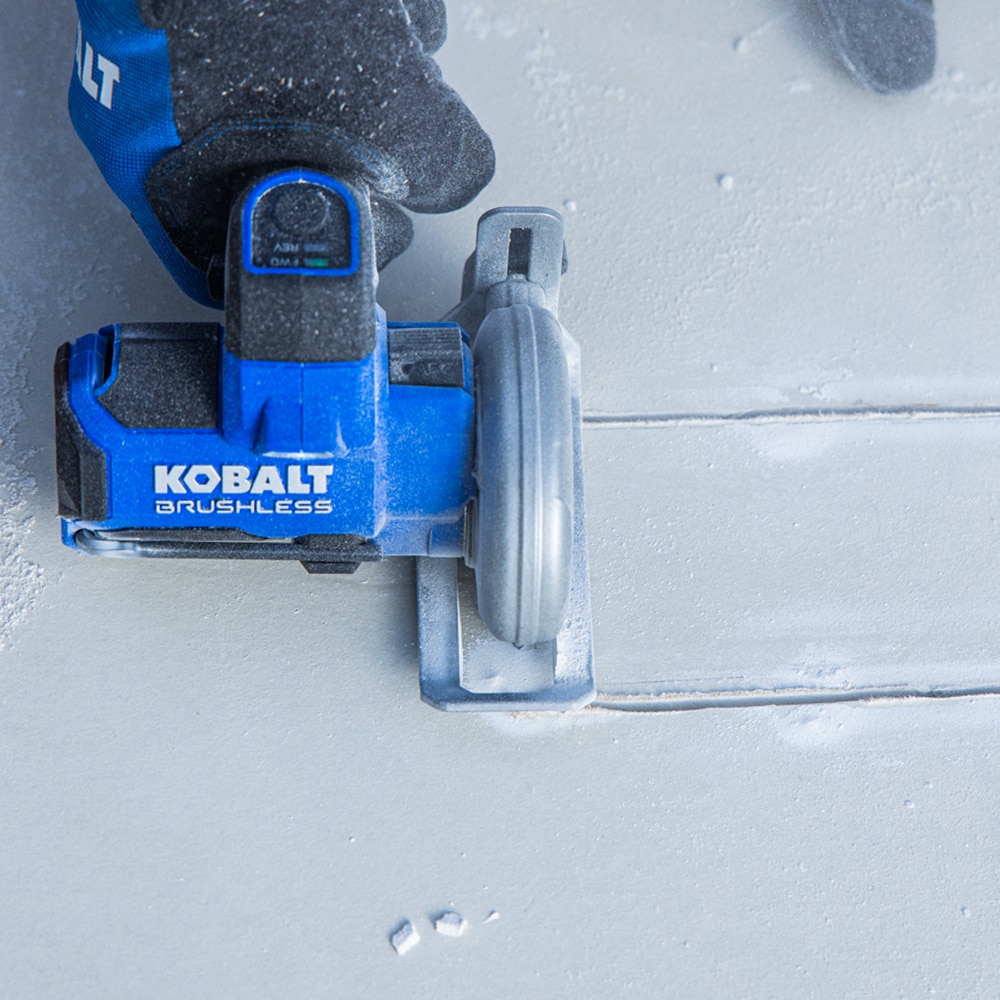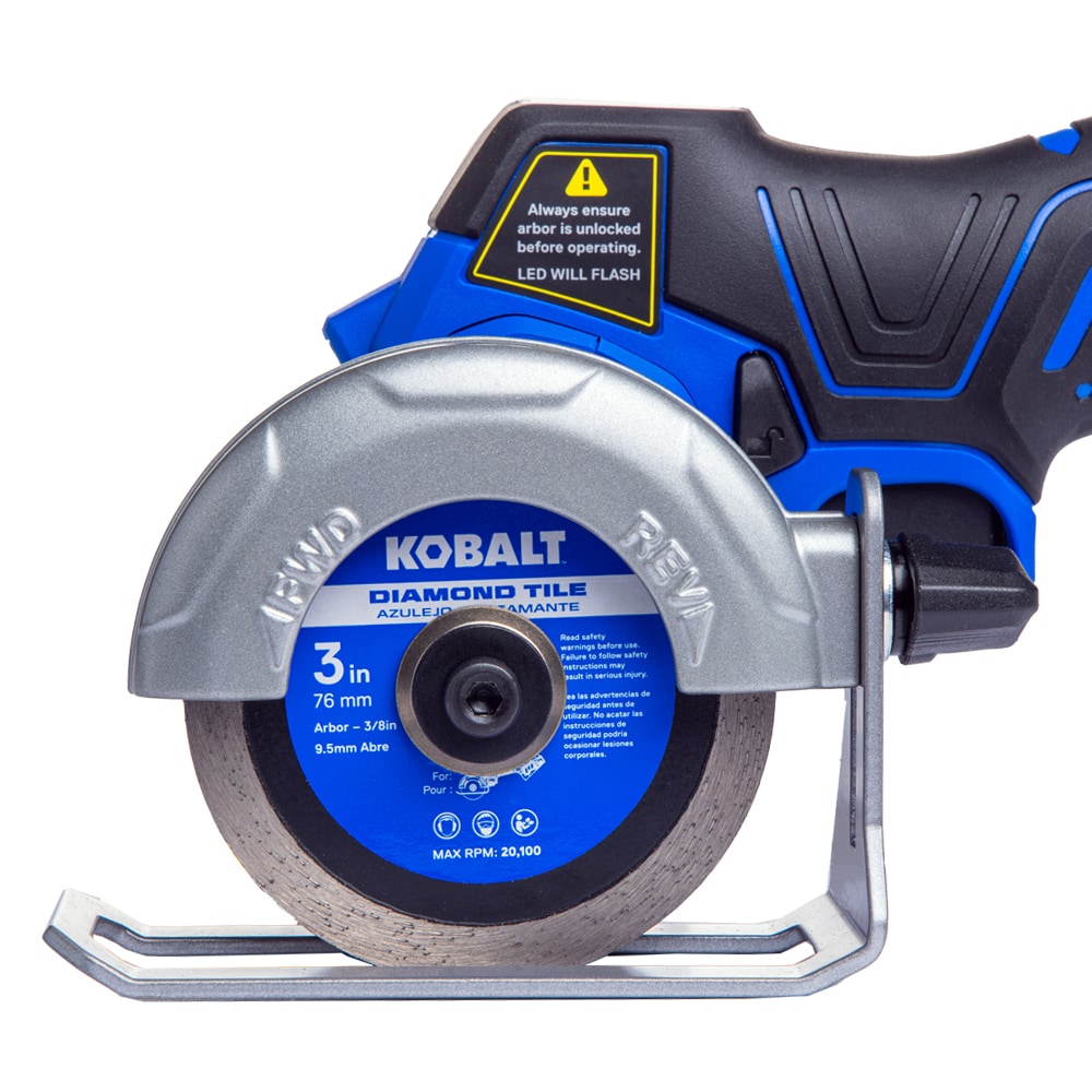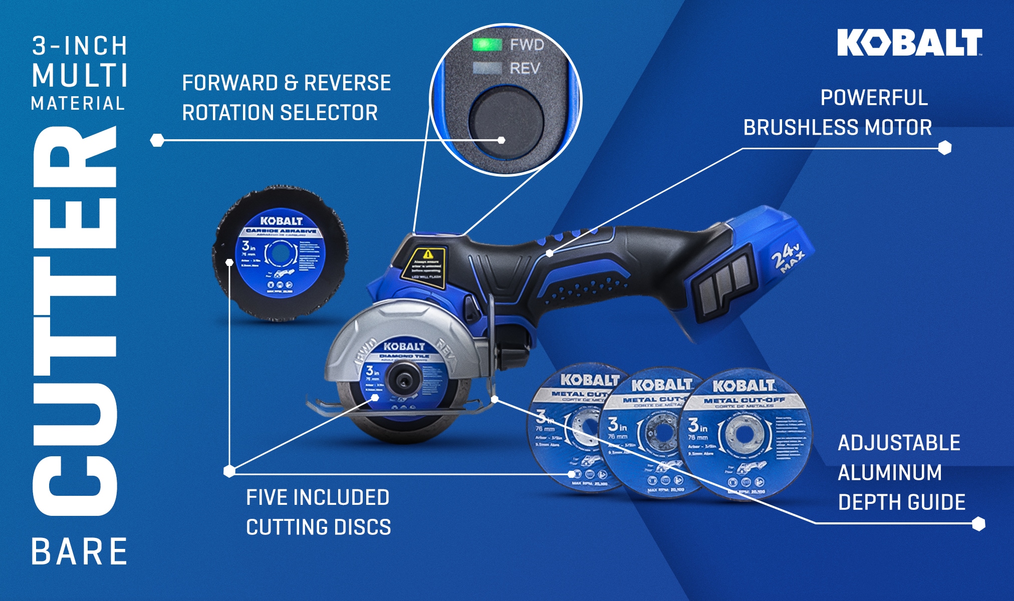 The Kobalt 24V 3-Inch Multi-Material Cutter provides the versatility to cut a large variety of materials including steel, aluminum, plastic, PVC, and drywall. The powerful brushless motor delivers up to 20,000 RPM for maximum productivity while the rotating shoe provides the flexibility of cutting in multiple orientations. Select Forward or Reverse blade spin direction when needed for special applications and to adjust spark/chip direction. The variable-speed trigger puts the user in control of the cutting speed for maximum productivity. The auto-lock spindle offers easy blade changes, simply rotate the spindle lock in place to secure the spindle from rotating. Onboard tool storage reduces downtime during blade changes. Utilizing 3-in blades with 3/8-in arbor diameter, with a cut depth up to 0.75-inch, all-metal guard housing for durability, and versatility, this will be a go-to product in the toolbox. Included with this tool is (1) metal cutting blade, (1) diamond tile blade, and (1) carbide abrasive blade. Part of the 85+ Kobalt 24V Max product family and backed by a 5-year limited warranty.