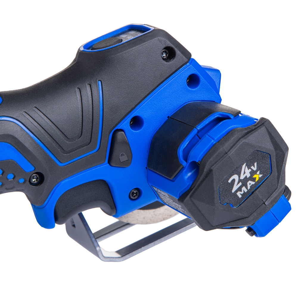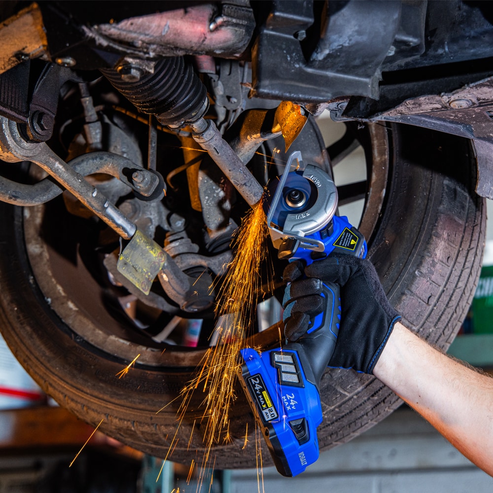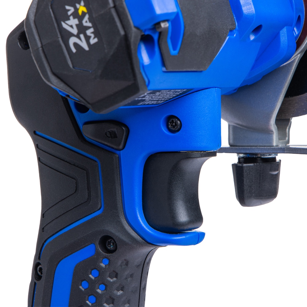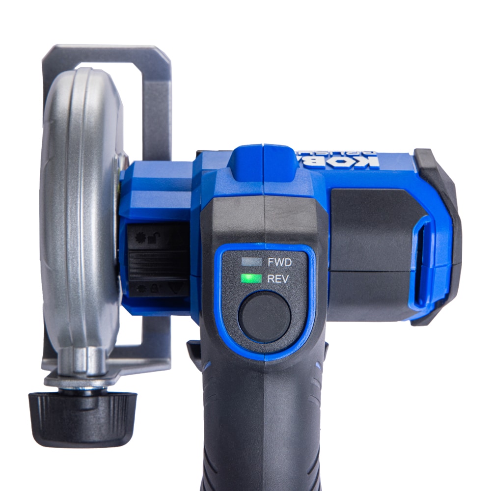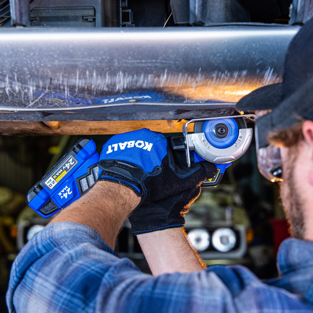 The Kobalt 24V 3-Inch Multi-Material Cutter provides the versatility to cut a large variety of materials including steel, aluminum, plastic, PVC, and drywall. The powerful brushless motor delivers up to 20,000 RPM for maximum productivity while the rotating shoe provides the flexibility of cutting in multiple orientations. Select Forward or Reverse blade spin direction when needed for special applications and to adjust spark/chip direction. The variable-speed trigger puts the user in control of the cutting speed for maximum productivity. The auto-lock spindle offers easy blade changes, simply rotate the spindle lock in place to secure the spindle from rotating. Onboard tool storage reduces downtime during blade changes. Utilizing 3-in blades with 3/8-in arbor diameter, with a cut depth up to 0.75-inch, all-metal guard housing for durability, and versatility, this will be a go-to product in the toolbox. Included with this tool is (1) metal cutting blade, (1) diamond tile blade, and (1) carbide abrasive blade. Part of the 85+ Kobalt 24V Max product family and backed by a 5-year limited warranty.