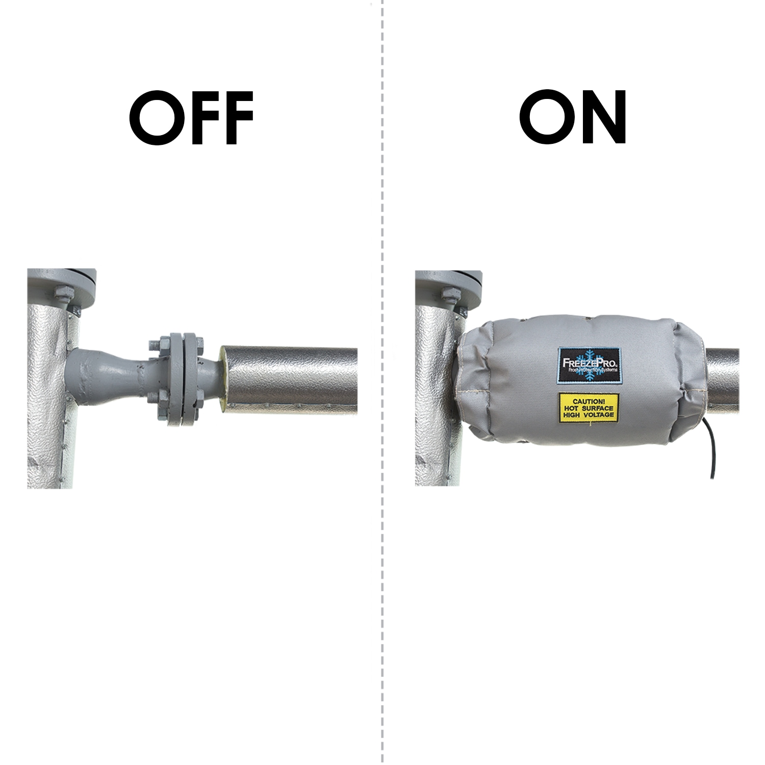 FreezePro® Frost Protection Systems deliver a barrier of uniform, directional heat where it is needed most – to tanks, pipelines, drums, buckets, IBC totes, and other temperature sensitive equipment. The advanced, all-in-one design of FreezePro® eliminates the need for multiple product purchases and simplifies the entire implementation process while saving time and money. The end result is an efficient heating solution with the most cost-effective method for minimizing damage caused by harsh or freezing temperatures. FreezePro® Wrap Insulation Jackets are suitable for straight sections of pipe, which do not involve complex shapes, such as flanges, couplings, or the like.