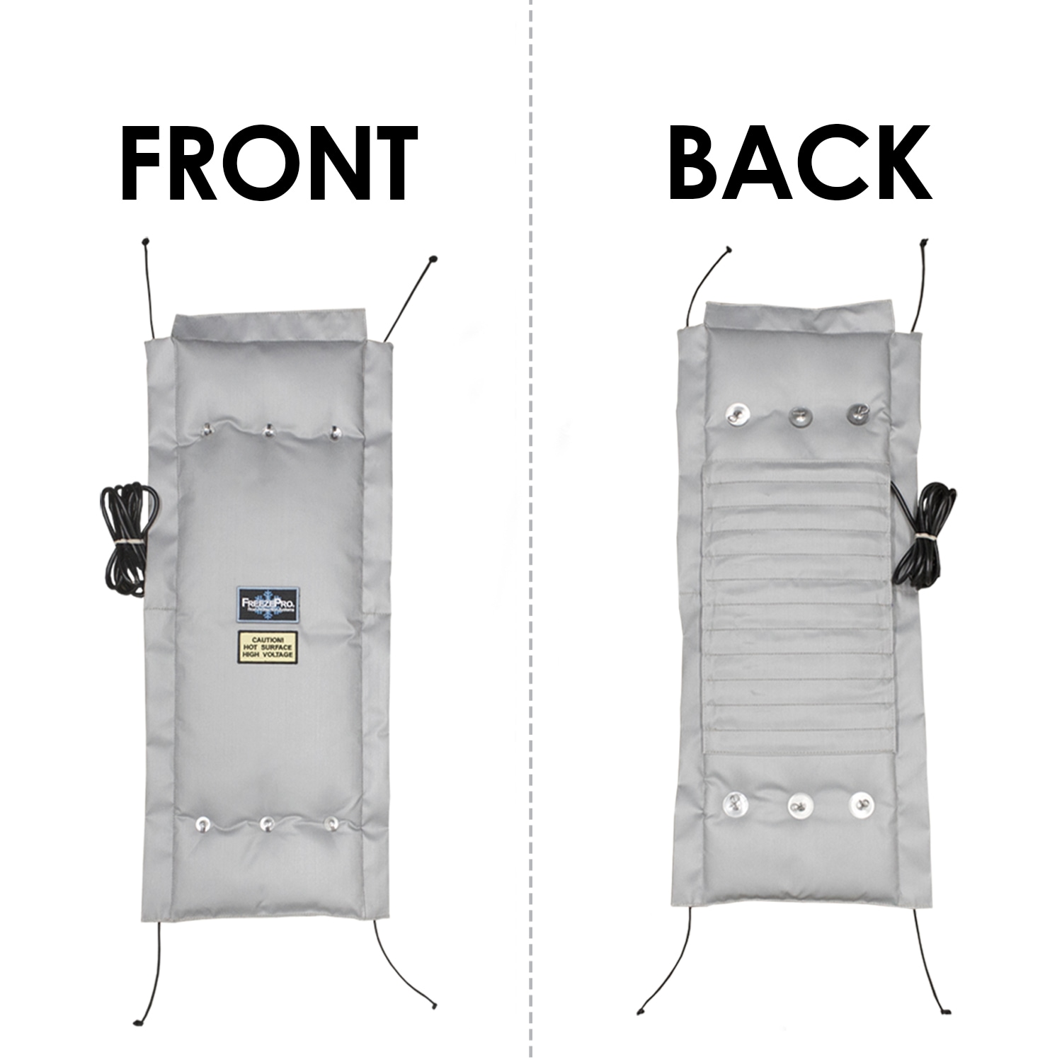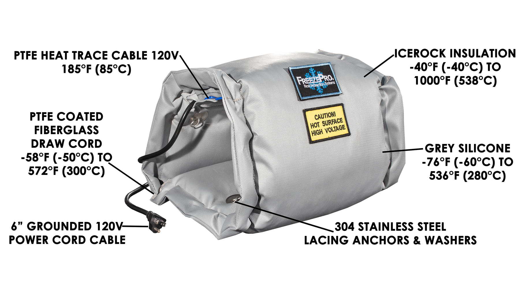 FreezePro® Frost Protection Systems deliver a barrier of uniform, directional heat where it is needed most – to tanks, pipelines, drums, buckets, IBC totes, and other temperature sensitive equipment. The advanced, all-in-one design of FreezePro® eliminates the need for multiple product purchases and simplifies the entire implementation process while saving time and money. The end result is an efficient heating solution with the most cost-effective method for minimizing damage caused by harsh or freezing temperatures. FreezePro® Wrap Insulation Jackets are suitable for straight sections of pipe, which do not involve complex shapes, such as flanges, couplings, or the like.