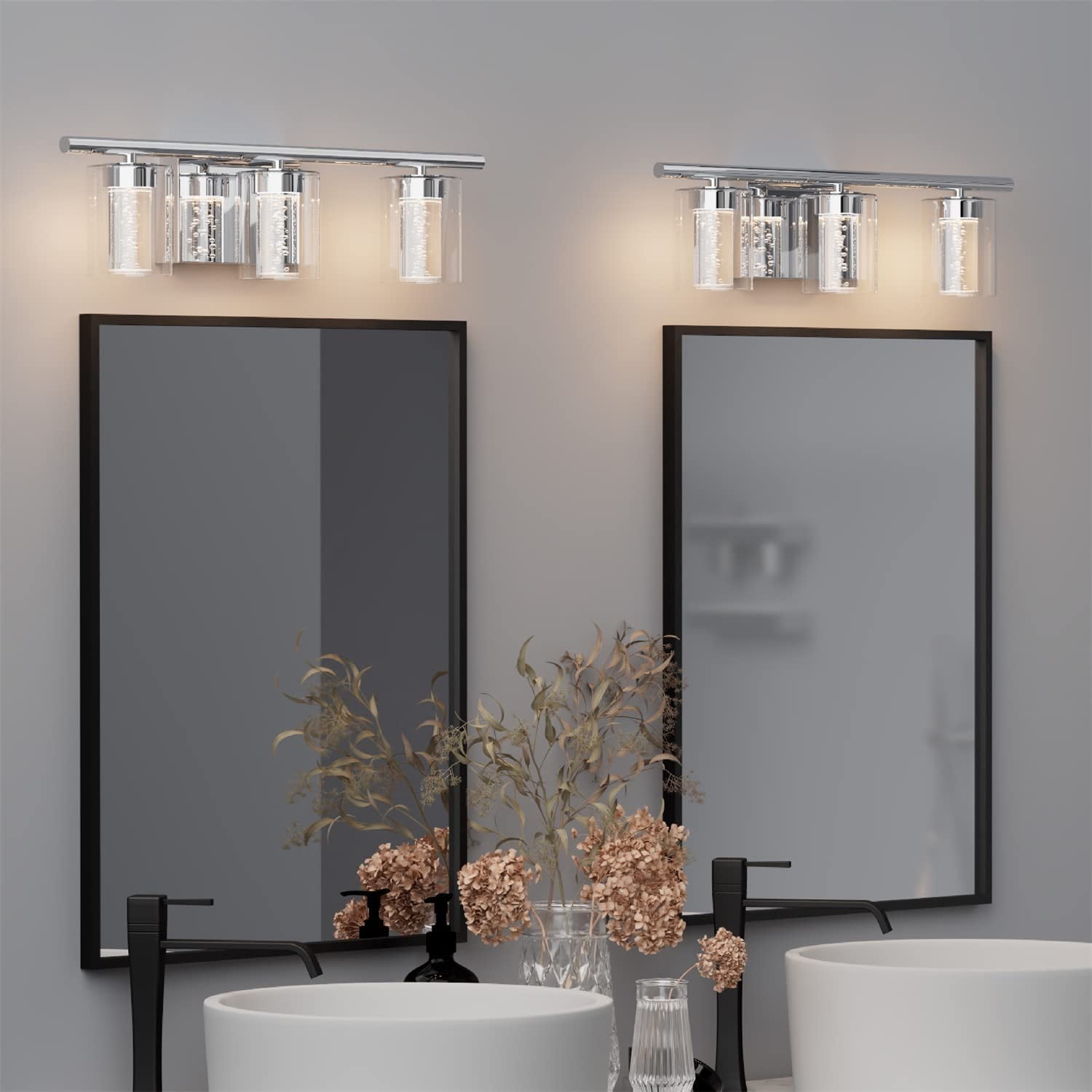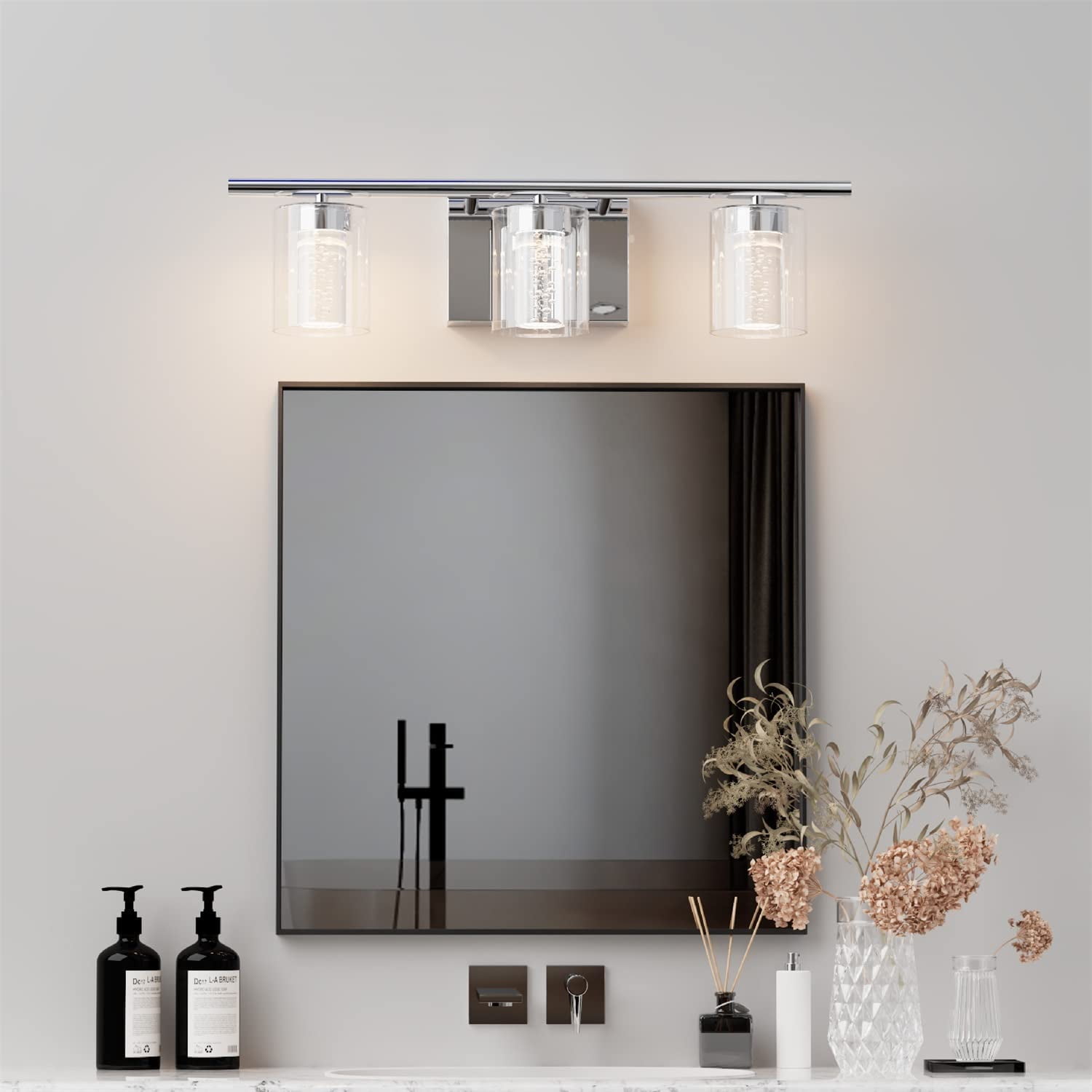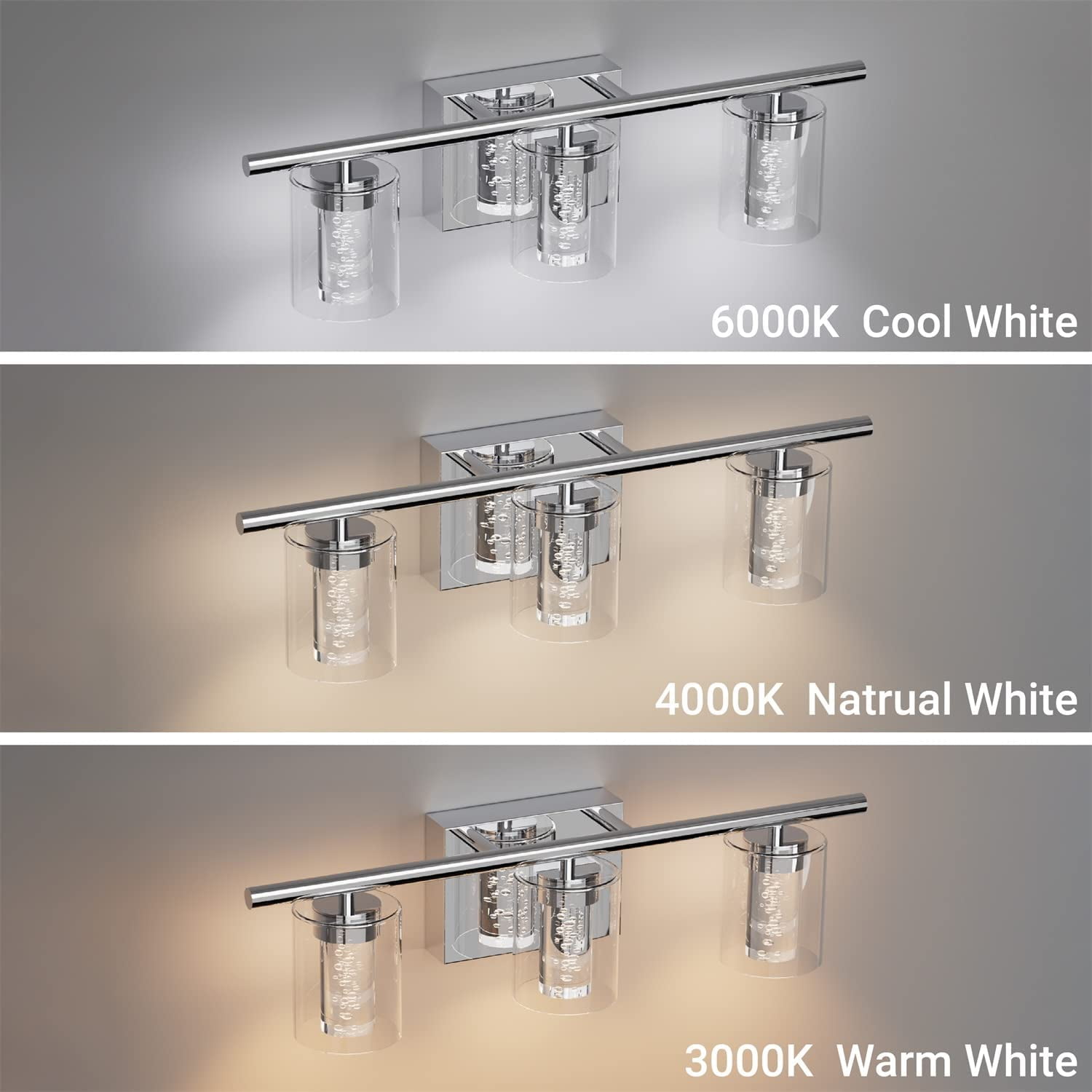 [Crystal Bubble Design]- This 3-light bathroom vanity light adopts crystal glass technology, the imitation crystal bubbles are frozen in ice, perfectly dispersing the light from the integrated LED bulbs, providing you with warm and pleasant light, like forming a romantic bubble starry sky Surrounding you, bringing you a unique visual experience. [3 Color LED & Energy Saving]- 21W led vanity light for bathroom, our bathroom vanity light, no bulb required, A+ energy efficiency rating, save you 80% energy cost. The perfect alternative to traditional light bulbs. There are three light color options of cool white/natural white/warm white to meet your needs for warm light and cool light. [High Quality & Dimmable]- This chrome bathroom light fixtures is made of thick glass shade and strong alloy metal, anti-oxidation and fading, can be used in wet places, don’t worry about splashing water. Plus, it’s dimmable when used with a dimmer switch. NOTE: Dimmer switch not included. [Easy Installation]- All mounting hardware required for installation are included in the package. Just need to follow the illustrated instructions provided for assembly and installation! [Application]- Ideal as a bathroom light, bathroom mirror light, vanity lights for bathroom. This chrome vanity light also allows you to mount it in an upward or downward position, depending on your preference. [After-sales service]- If you have any questions about the installation and quality, please log in to your account, check the order ID and click “Contact Seller” to contact us. our customer service will solve your problem within 24 hours, We will try our best to improve your shopping experience.