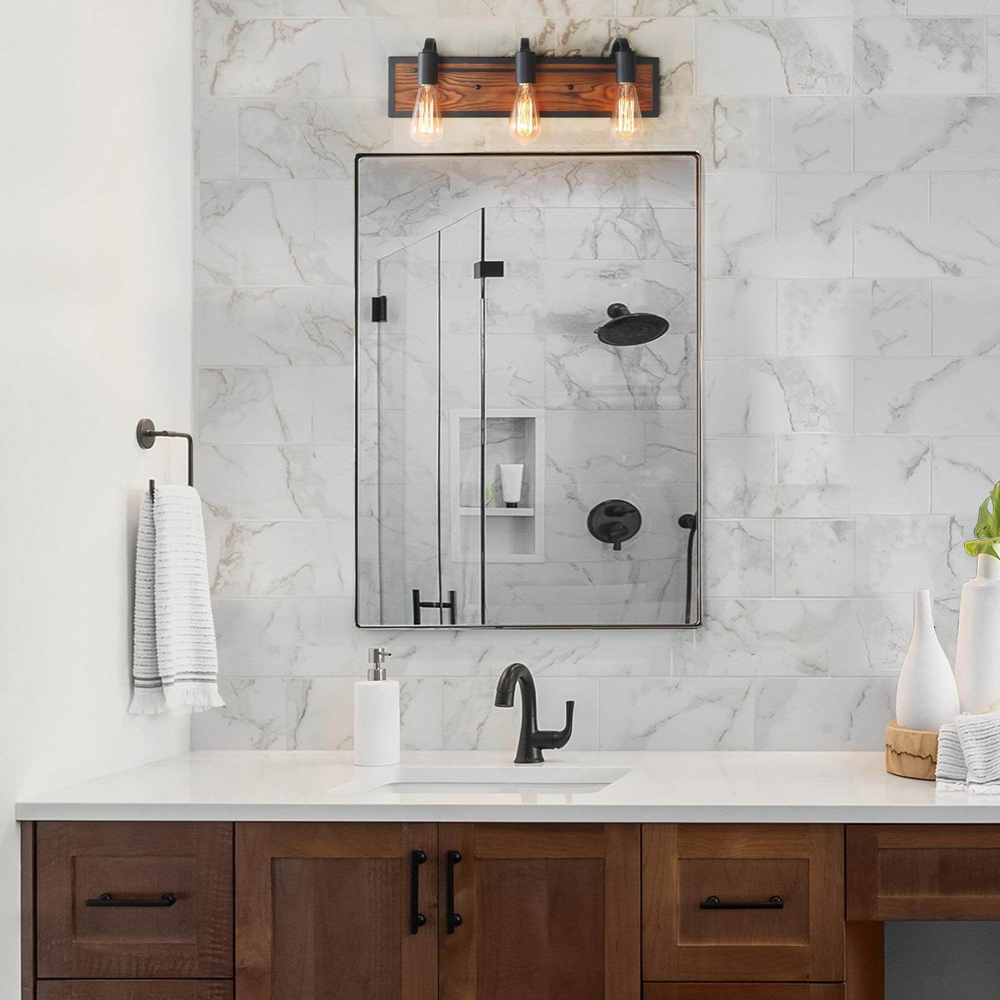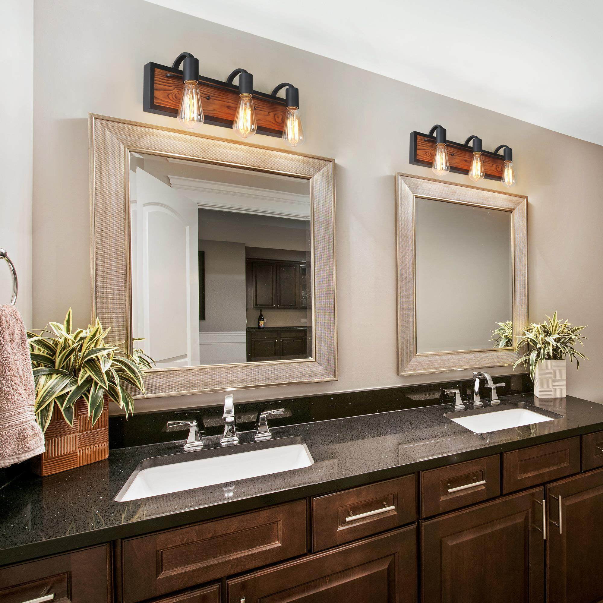 If you want to add a rustic look to your bathroom, this vanity light fixture may be a good choice. It is made of natural mango, pine wood, and sturdy steel, features sand black, and antique wooden hand-painted finish that gives it a rustic and modern appearance. Features: Application: Ideal for vanity, powder room, bathroom, dressing room, bedroom, dining room and anywhere you want beautiful glow of the bright light Style: Perfect for traditional and farmhouse style settings. Finish:Matte black finish+natural mango wood Material:Constructed from metal and natural mango wood to ensure a long product lifespan and visual interest. Bulbs: For ideal illumination, use 3 medium base E26 bulbs that are sold separately(60w max-LED/CFL/incandescent). Compatible with dimmable bulbs. Demensions:Measures 21″ length x 4″ depth x 6″ height,backplate size:21″ width x 6″ height Certifciations: UL Damp location listed. Pairs With : Pairs with LNC Home Lighting fixtures from other category to refresh your home looking Warranty:Our 2-Year Limited Warranty guarantees your complete satisfaction,free parts replacements when received broken pieces or missing parts Care Instruction: Please do not use any metal polish as its abrasive nature could damage the protective finish placed on the metal parts; never wash glass shades in an automatic dishwasher, instead, line a sink with a towel and fill it with warm water and mild liquid soap