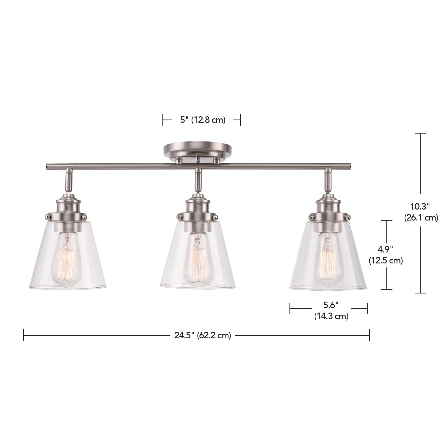 VINTAGE: the brushed nickel finish and clear glass shades of the track lighting create a vintage look that brings a timeless design to contemporary, farmhouse, coastal, and industrial spaces PIVOTING TRACK HEADS: three pivoting track heads help create the perfect lighting design – focus them strategically to create the ultimate lighting experience in every room BULB REQUIREMENTS: 3x E26/Medium Base 60W Bulbs (sold separately) – Compatible with LED and Incandescent Bulbs STYLISH PLACEMENT OPTIONS: with adjustable track heads and a round canopy, you can place your light on the ceiling as a traditional track light or use it on your wall as a trendy vanity light CLEAR GLASS SHADE: the clear glass shades allow you to choose vintage Edison bulbs to complete the vintage esthetic or try out designer bulbs for a trendy and unique look EASY INSTALL: includes all mounting hardware for quick and easy installation – can be installed on a sloped or vaulted ceiling MAKE IT SMART: automate your track light by adding a Globe Electric Smart bulb – simply screw it in and create different lighting solutions with your phone – the options are endless!