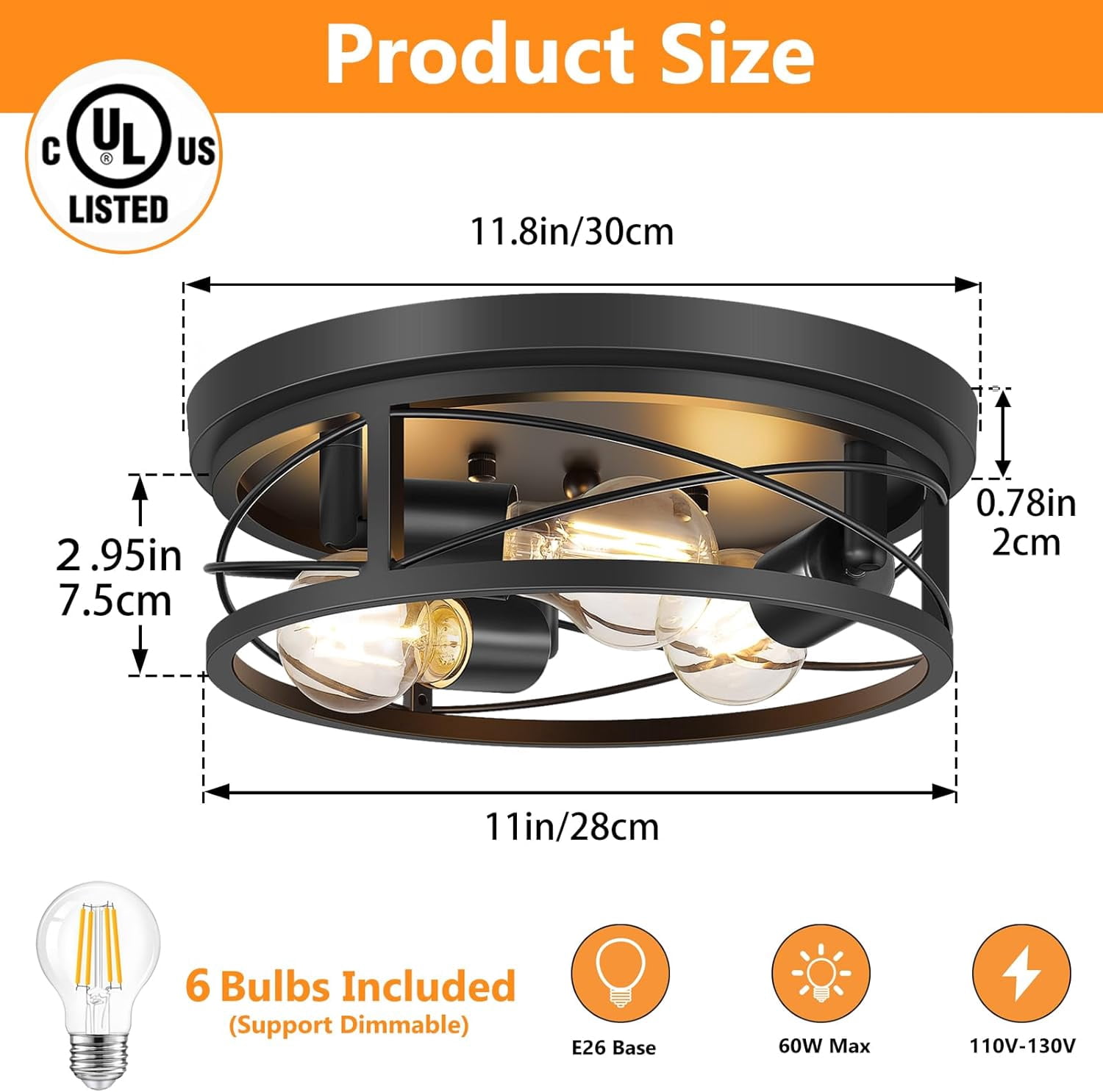 【Black Cage Design Ceiling Light 】This UL Certified farmhouse flush mount ceiling light (Ceiling Canopy Diameter: 11.8 inch, Lamp Height: 3.73 inch) features a unique matte black finish and open cage-style frame, gives enough illumination to light up the whole room and add a vintage industrial chic touch to your house.