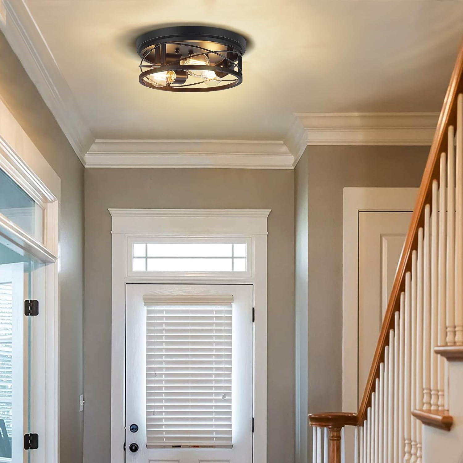 This industrial flush mount ceiling lighting features a minimalist matte black metal frame, create a farmhouse and vintage look in your house,which offers added style and beauty for your living space. The black flush mount ceiling light can be widely applied in different spaces of your home, such as bedrooms, garages, stairwells, basements, laundries, walk-in closets and much more commercial or residential. The industrial ceiling light is made of metal materials, durable, the surface of black finishing layer is not only beautiful, but also effectively prevent rust, scratch. The farmhouse flush mount ceiling light fixtures is very easy to install.