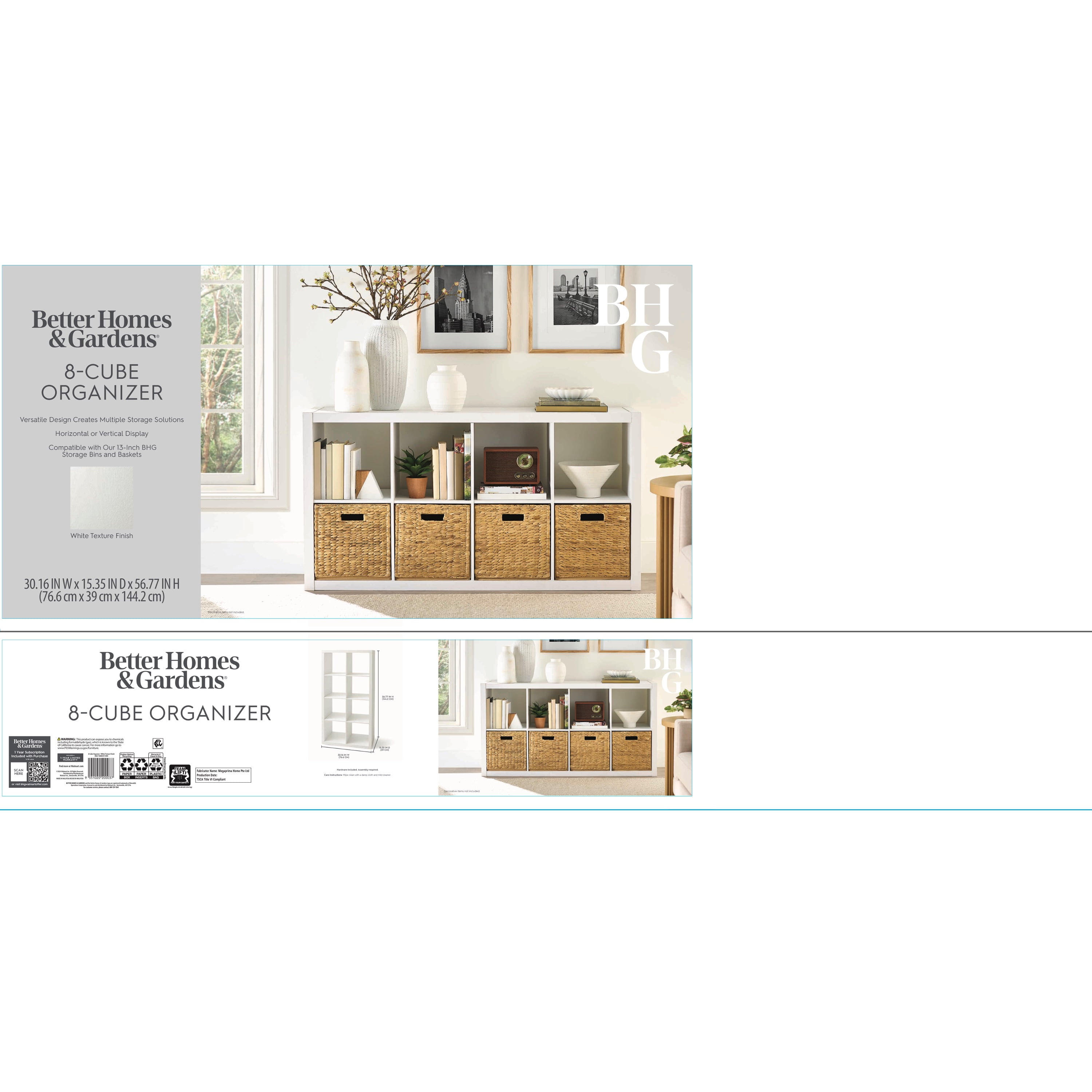 Better Homes & Gardens 8-Cube Storage Organizer, White Texture Sleek, open-back design for easy cord management Features eight 13″ x 15″ x 13″ compartments Compatible with Better Homes & Gardens Cube Storage Bins (sold separately) Versatile design allows for vertical or horizontal placement Top panel can support up to 100 lbs when vertical, 150 lbs when horizontal Each cube supports up to 30 lbs Dimensions: 30.16″ x 15.35″ x 56.77″ Weight: 55.57 lbs Can be combined with other Better Homes & Gardens Storage Organizers and Shelves (sold separately) Materials: MDF, particle board, paperboard and iron Attaches to wall with included safety strap Easy to assemble with included instructions and video assembly guide Tools required: hammer, Phillips head screwdriver, flat head screwdriver Finishes available: Textured White (BH61100005913WH), Tobacco Oak (BH61100005913TO), Natural (BH61100005913NA), Rustic Gray (BHD036118664025), Solid Black (BHD036118664023) and Gray (BHD036118664024) Site to Store Pickup Note: This item is packaged in one large box that may not fit in a standard-sized vehicle. Please make sure you have a large car or truck for store pickup. Package dimensions: 58.27″ x 8.78″ x 18.5″ Package weight: 65.08 lbs Assembly Video: Better Homes & Gardens 8-Cube Organizer For customer support or assembly assistance, visit huisenfurniture.zendesk.com or call 1-800-729-1569.