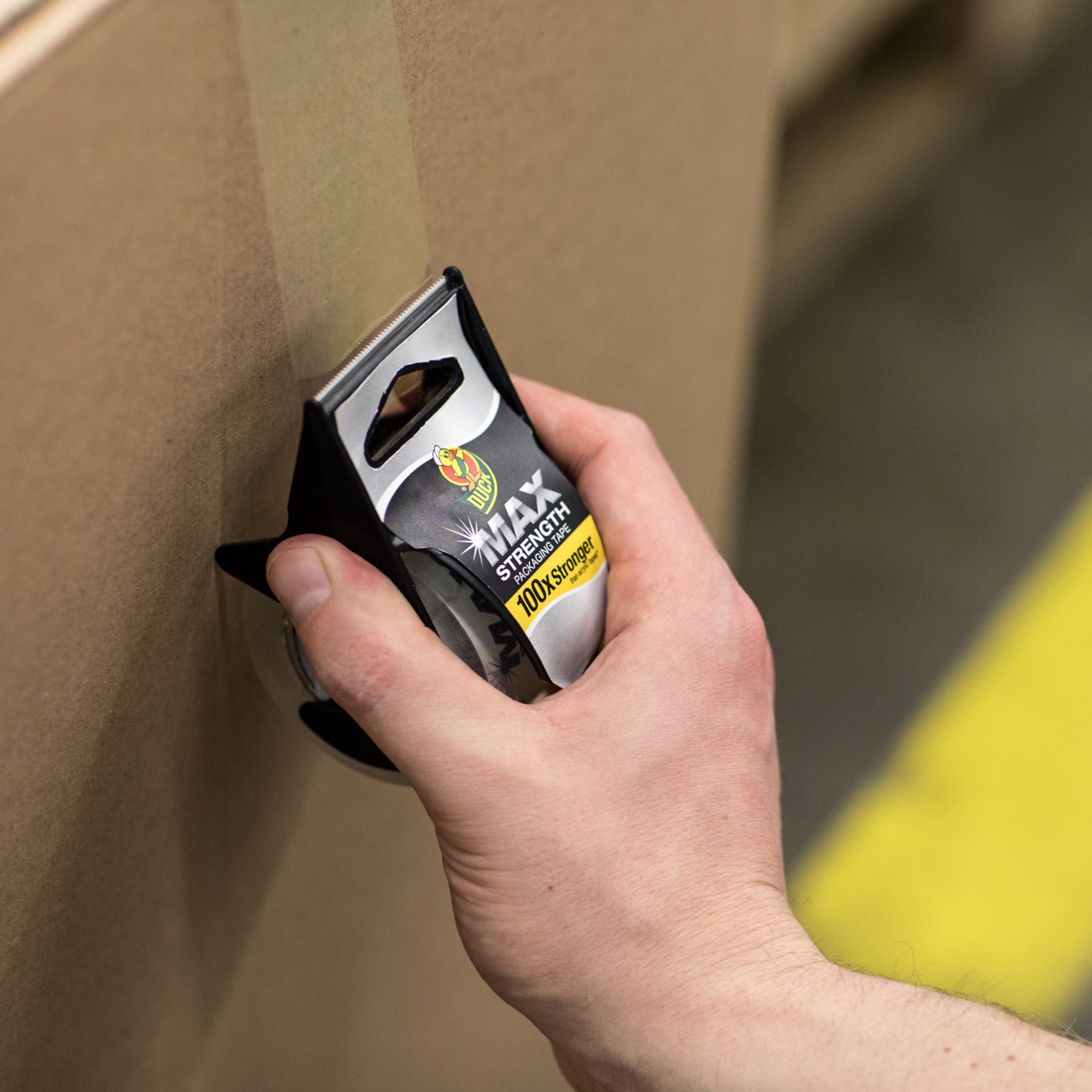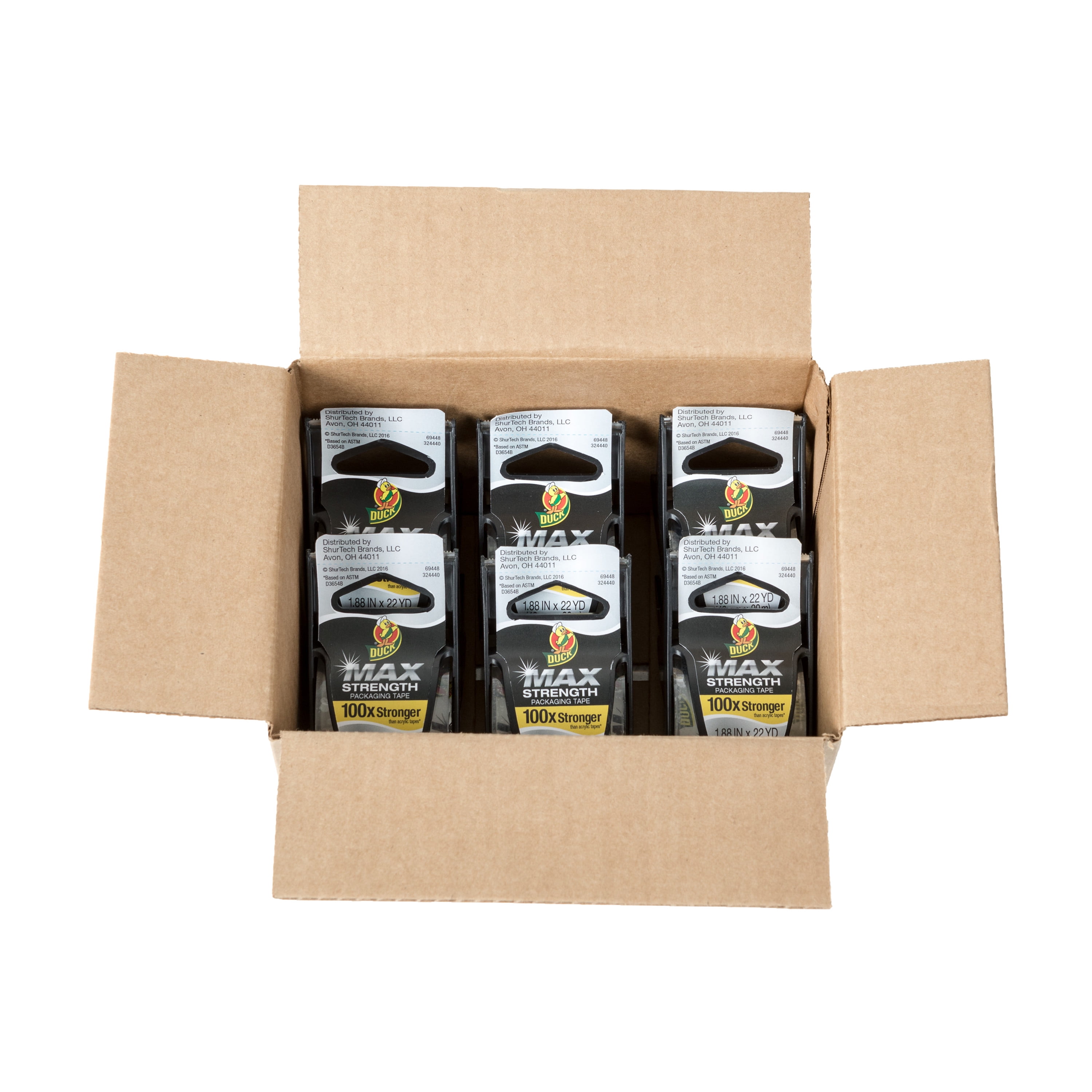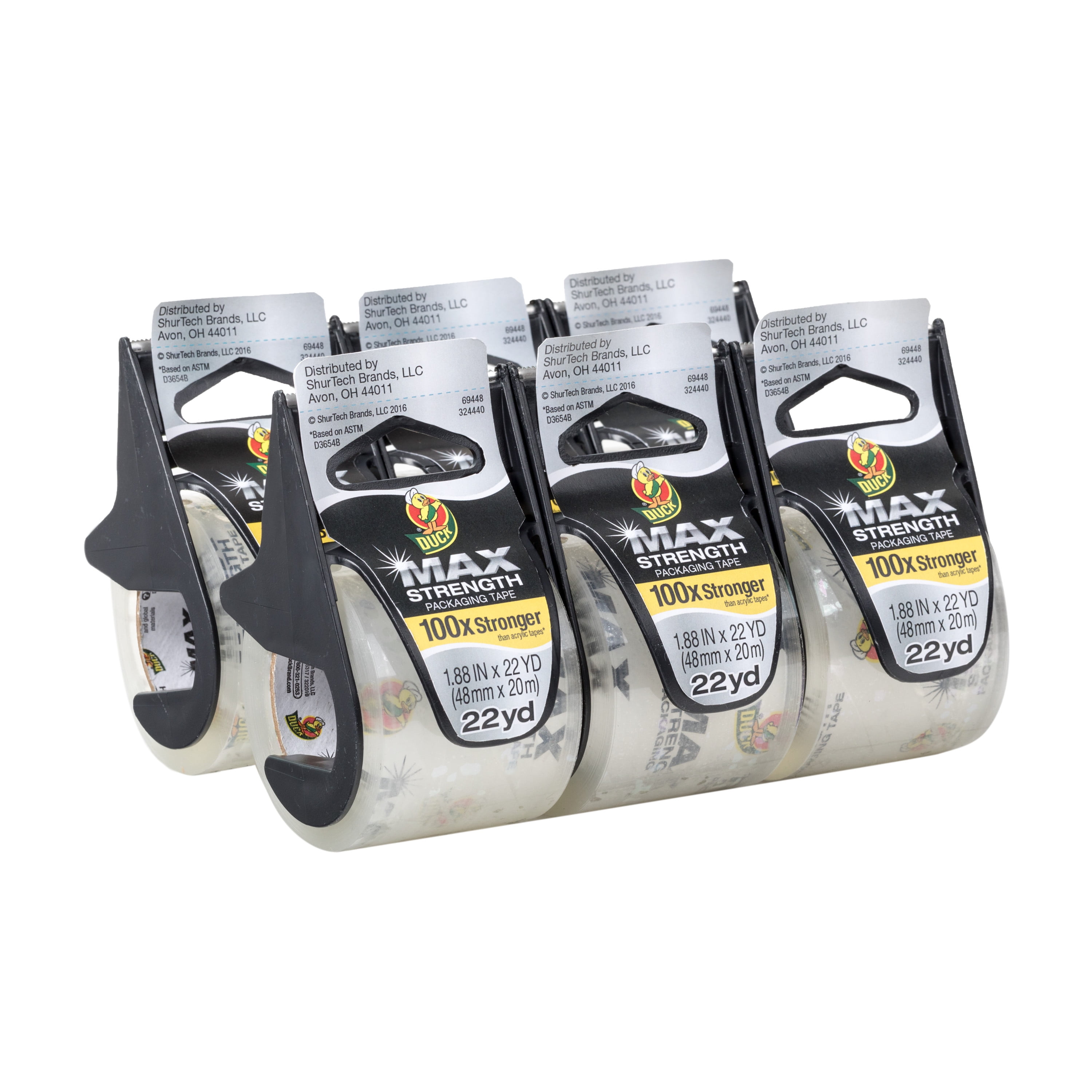 Duck Max 1.88″ x 22 yd. Clear Rubber Packing Tape & Dispenser, 6 Pack 100x stronger than acrylic tapes based on ASTM D3654B and holds boxes up to 100 pounds Ideal for moving and shipping the heaviest boxes Instant quick stick to boxes for immediate hold Wide temperature range performance allows this tape to stick well in hot or cold temperatures Meets postal regulations for shipping tape