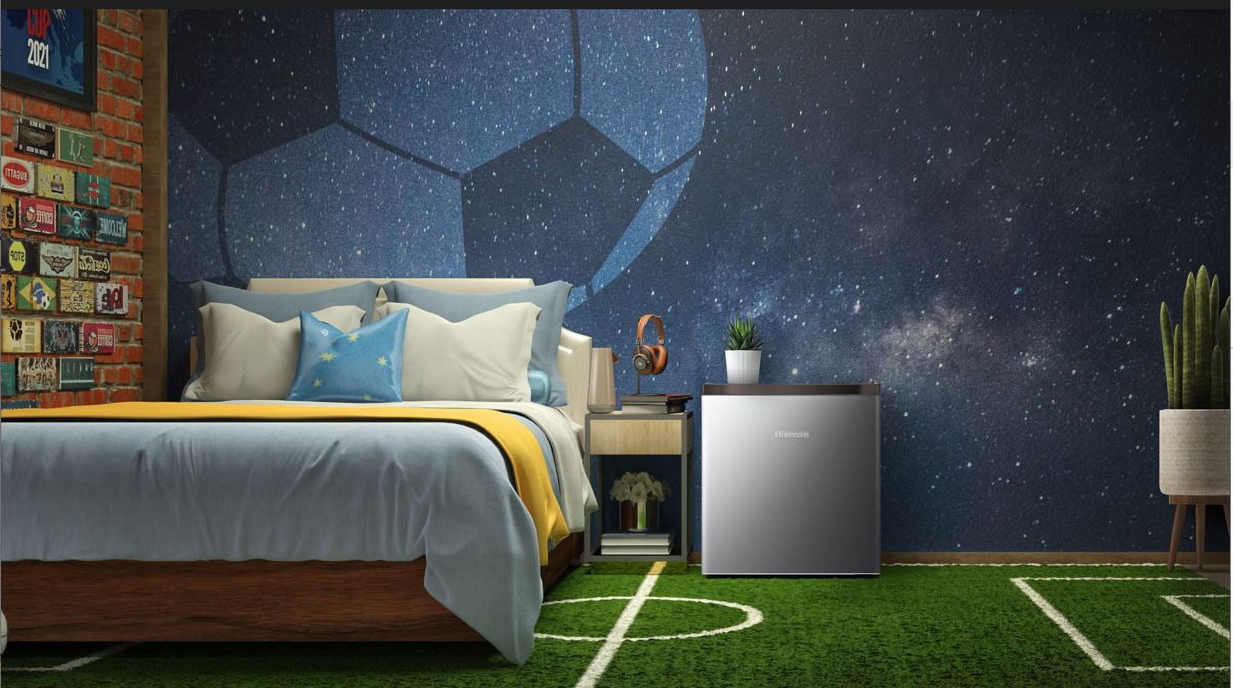 This Hisense energy star 1.6 cu. ft. silver mini fridge WMS017M6XVE is perfect for college dorms, break rooms, or just extra storage for your home and office space. The adjustable legs and reversible door design allow for the placement of this mini refrigerator virtually anywhere you need. The sleek and fashionable fridge design does not compromise its functionality. This model has convenient storage shelves on the door for canned beverages and a 2-Liter bottle as well as extra space for single-serve yogurt or other condiments/snacks. Removable fresh-food glass shelf provides storage for larger items to efficiently utilize interior capacity. Refrigerator width is 17.5″. Condition- New