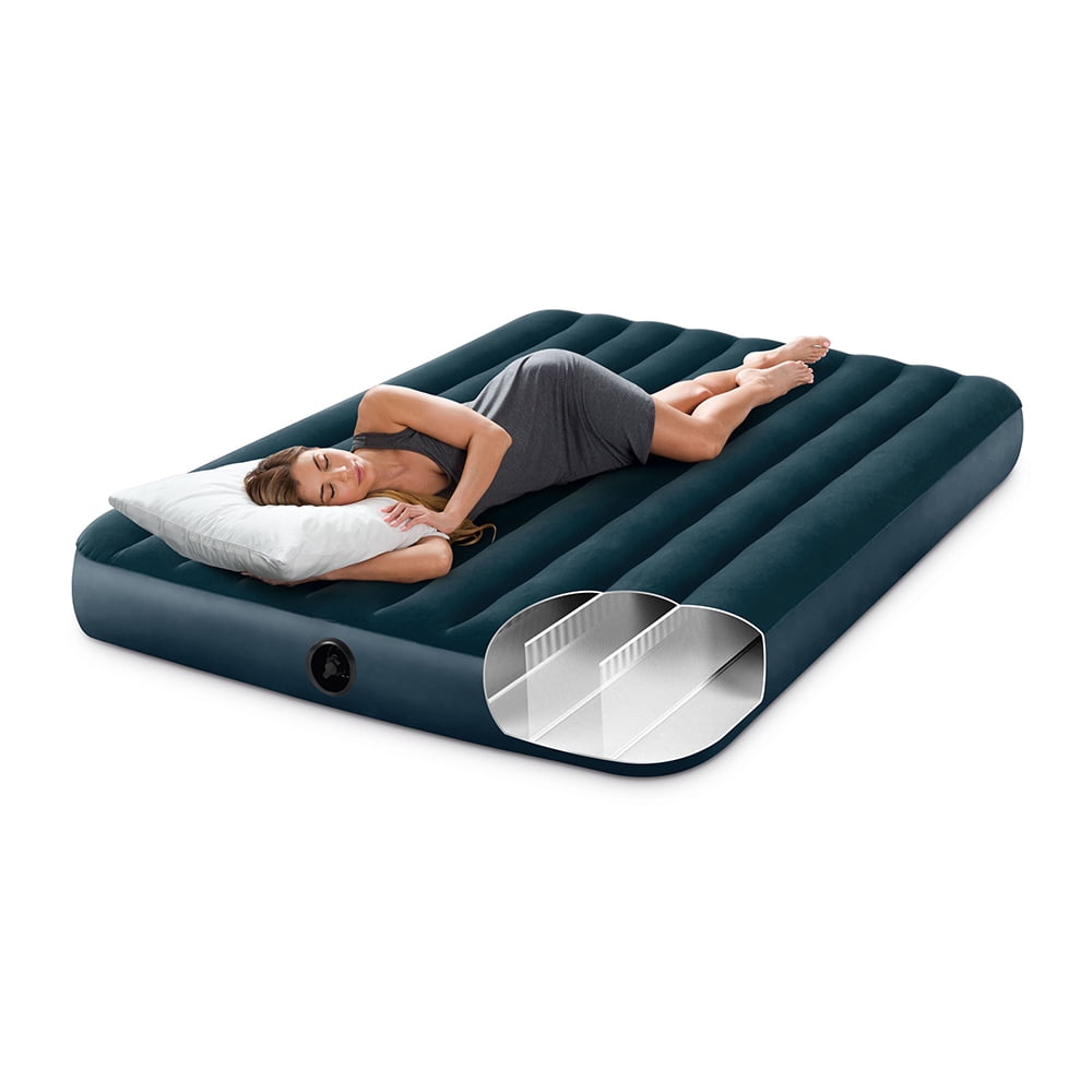 Intex Queen 10″ Dura-Beam Standard Airbed Mattress with Fiber-Tech Technology. Versatile and perfect for both in-home and camping, this compact airbed is built for long-lasting durability. Indoor and outdoor multi-use airbed Quality tested flocked top with vinyl sides and bottom Strong and lightweight 2-in-1 valve Dimensions 60in x 80in x 10in Weight capacity limit: 600 lbs Air Pump Sold Separately