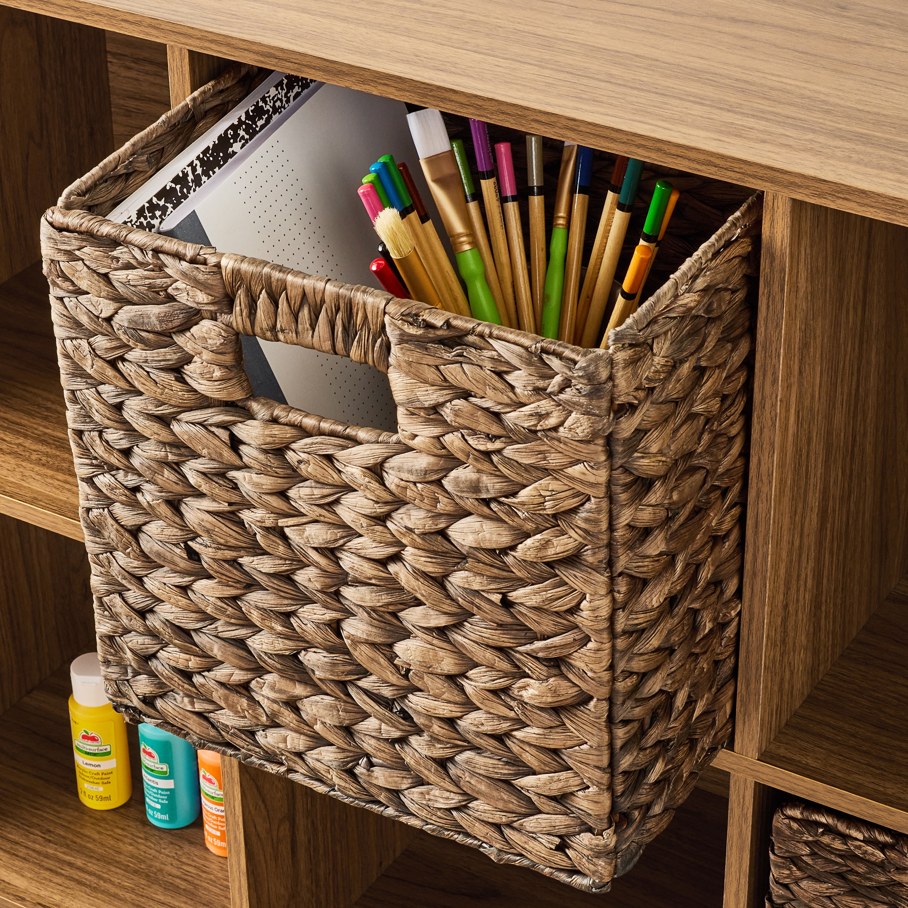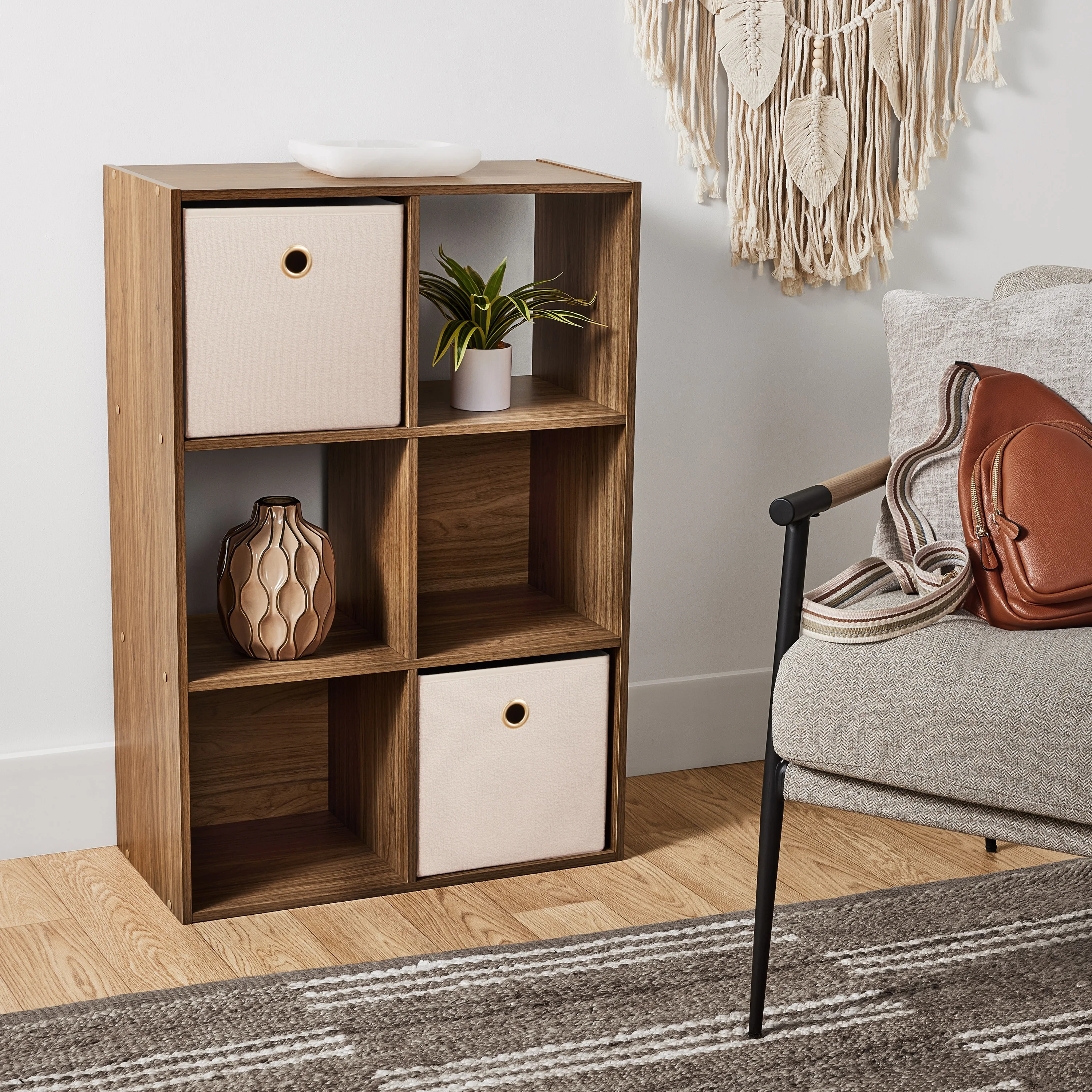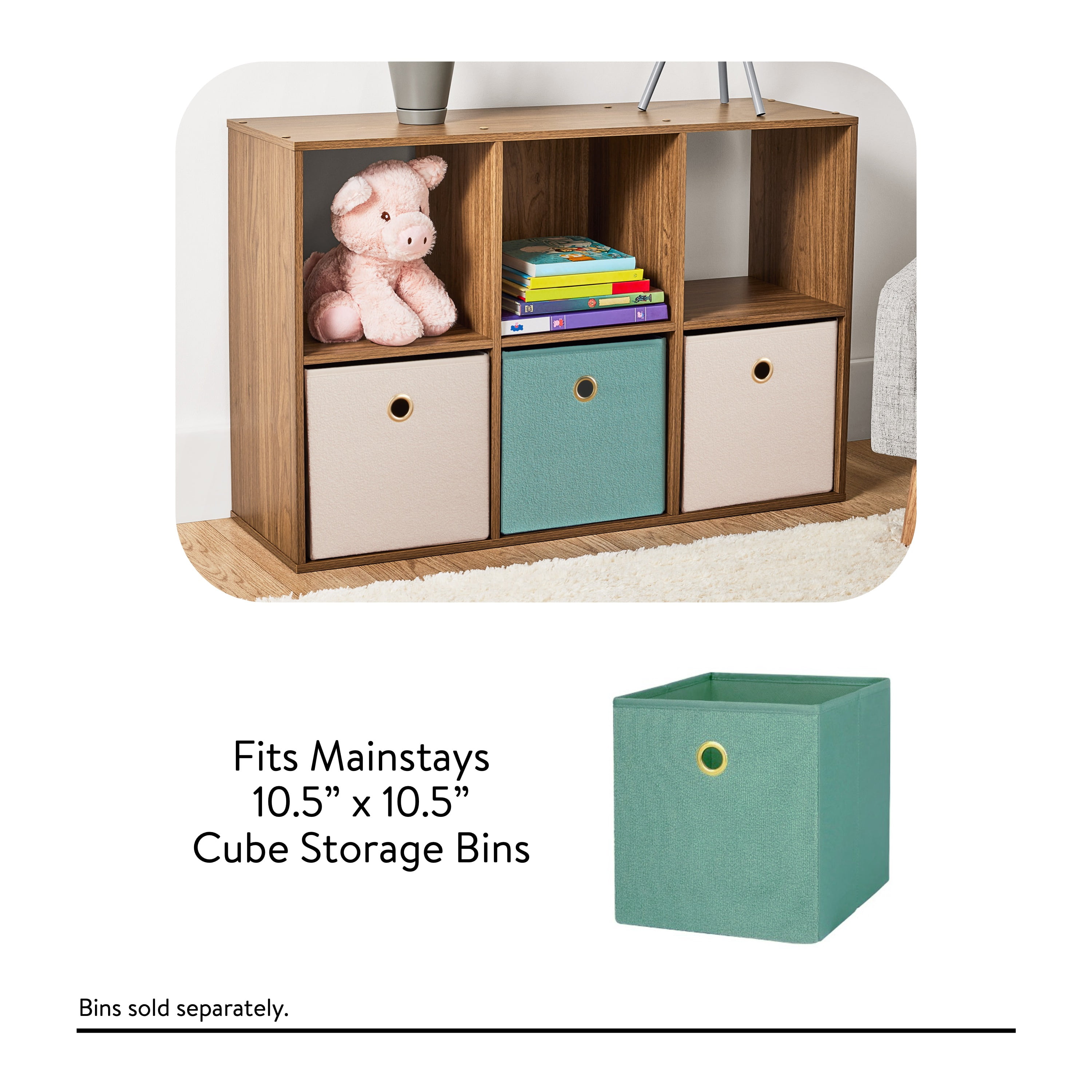 The Mainstays 6-Cube Storage Organizer features six compartments perfectly sized for storing and displaying office supplies, books, clothes, craft supplies, photos, collectibles and so much more! This sturdy bookcase can stand vertically or horizontally to best suit your needs and space. They are compatible with Mainstays 10.5″ x 10.5″ collapsible storage bins (sold separately) and available in multiple finishes. Three open-back cube shelves make managing cords and cables easy, while three closed-back shelves help keep items securely housed. Add an accent piece that is both functional and stylish to your living room, family room, home office, playroom, closet and more, with the Mainstays 6-Cube Storage Organizer.