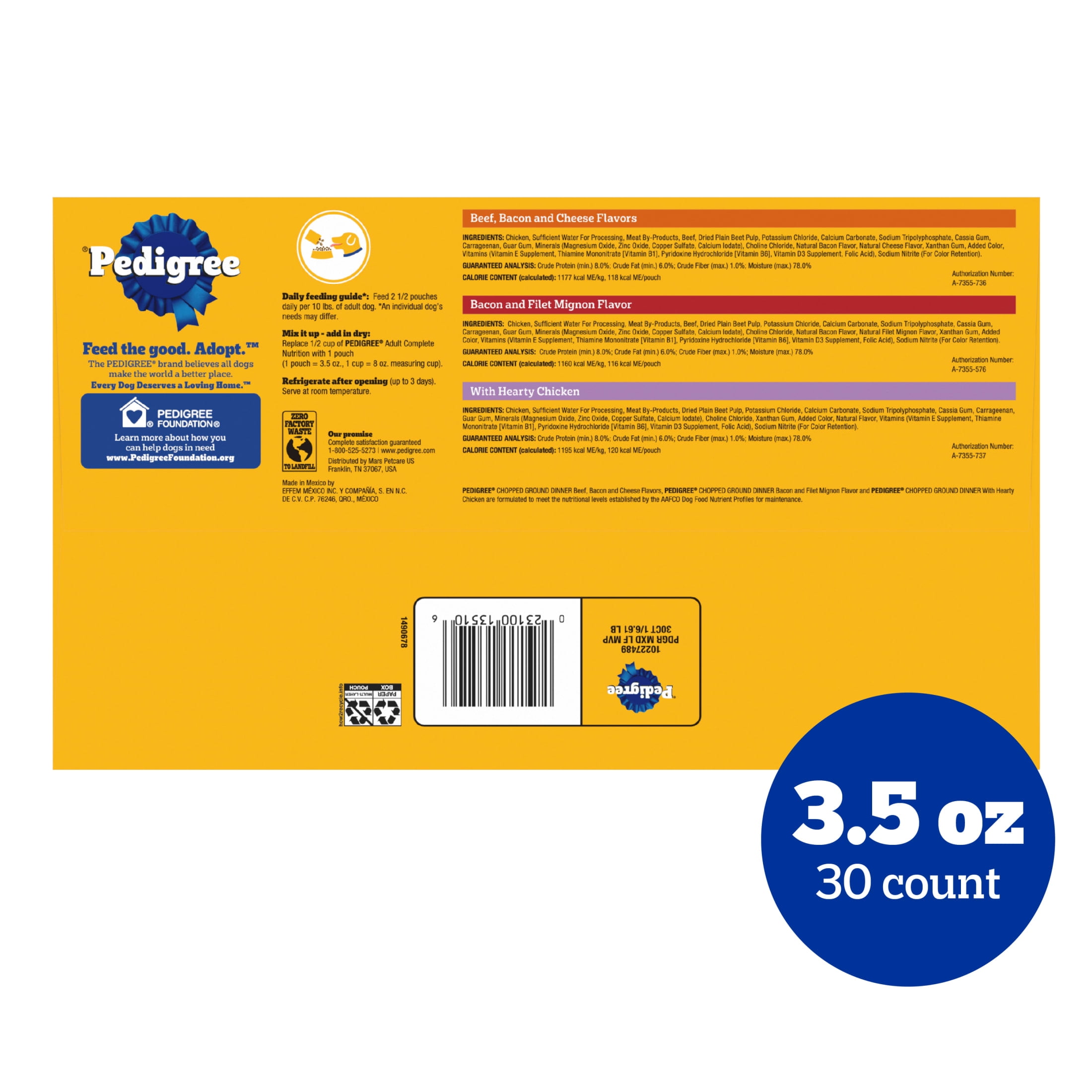 Dogs bring out the good in us. Pedigree brings out the good in them. Express your love for your dog by serving Pedigree Chopped Ground Dinner Dog Food 30-Count Variety Pack. These great-tasting wet dog food recipes are 100% complete and balanced for adult dogs and are made with real beef or real chicken, bringing a filling and familiar flavor to mealtime. Pedigree Chopped Ground Dinner Dog Food 30-Count Variety Pack features three delicious options: With Hearty Chicken, Beef, Bacon, and Cheese Flavors, and Bacon and Filet Mignon Flavors, so your dog can have favorites to choose from. This versatile soft dog food can be served as a topper, mixed with dry dog food, or enjoyed by itself as a complete meal for adult dogs, bringing your dog a variety of ways to indulge. Crafted with no high fructose corn syrup, artificial flavors, or added sugars, Pedigree Chopped Ground Dinner Dog Food 30-Count Variety Pack shows your dog that you care and want them to have great tasting food.
