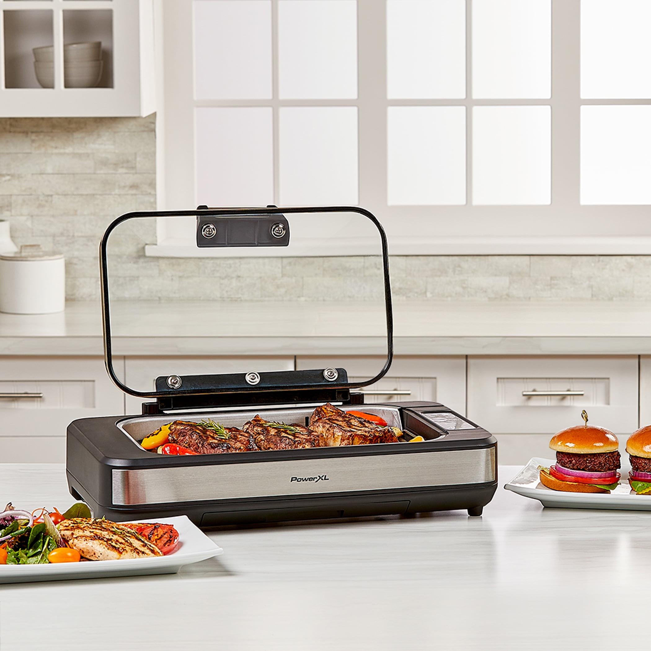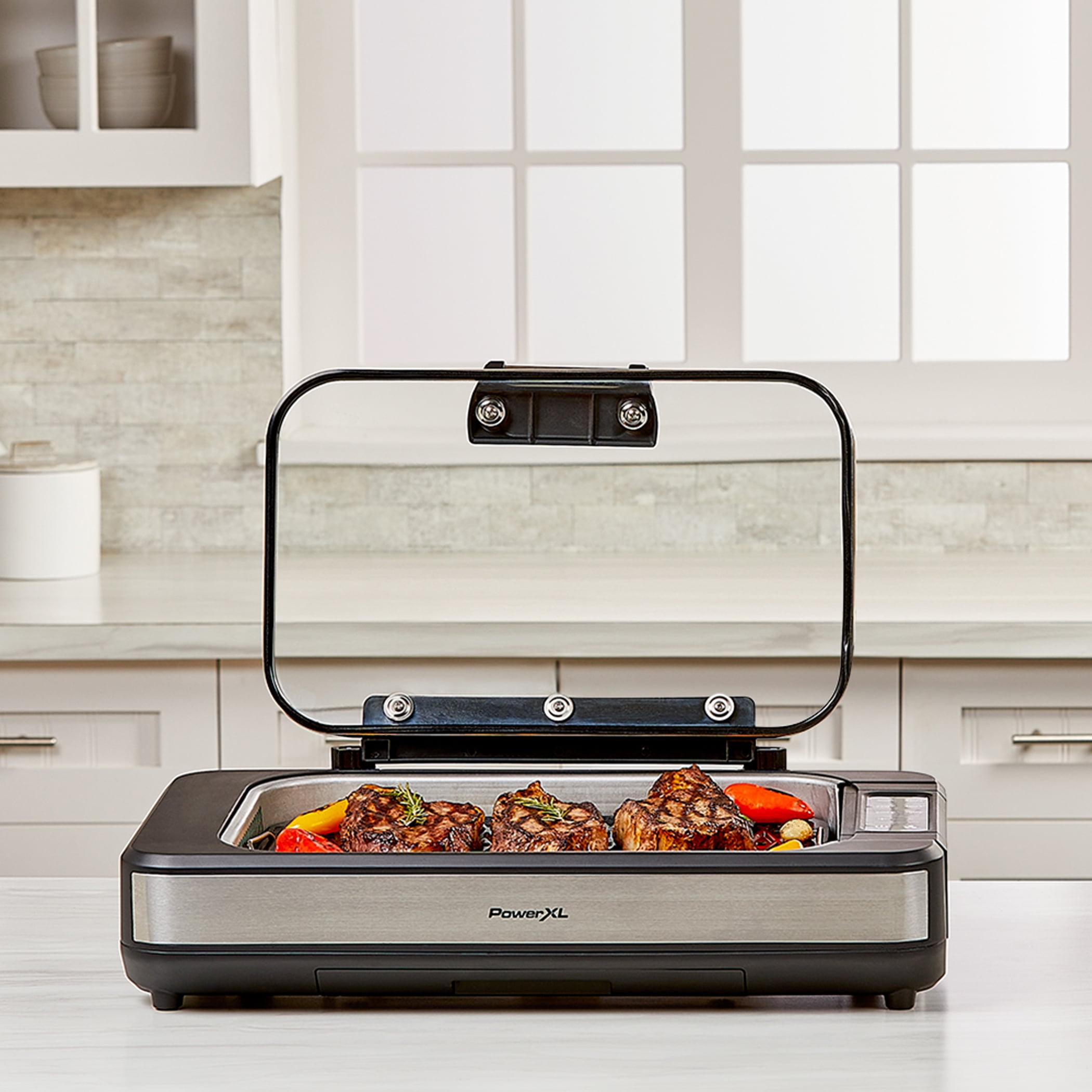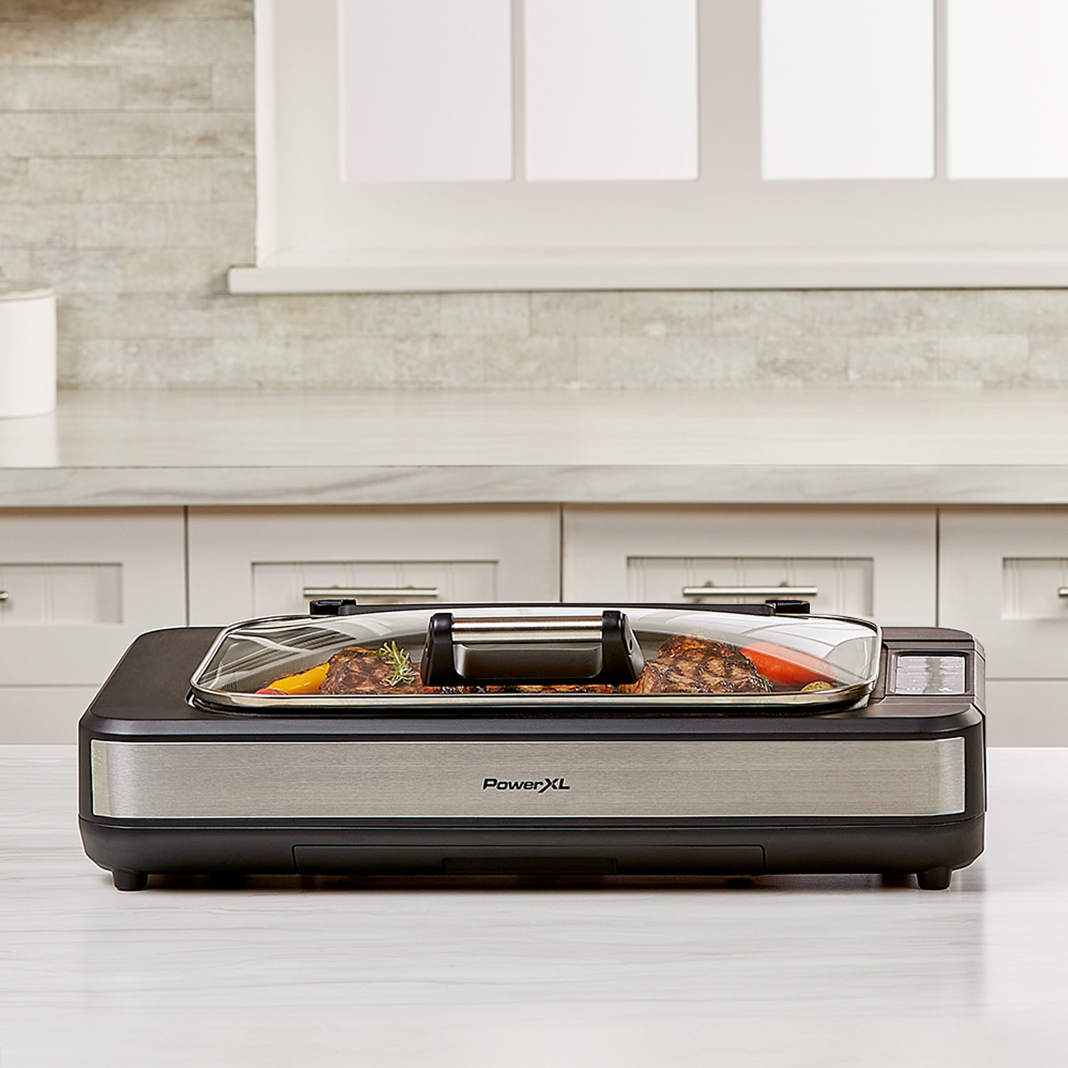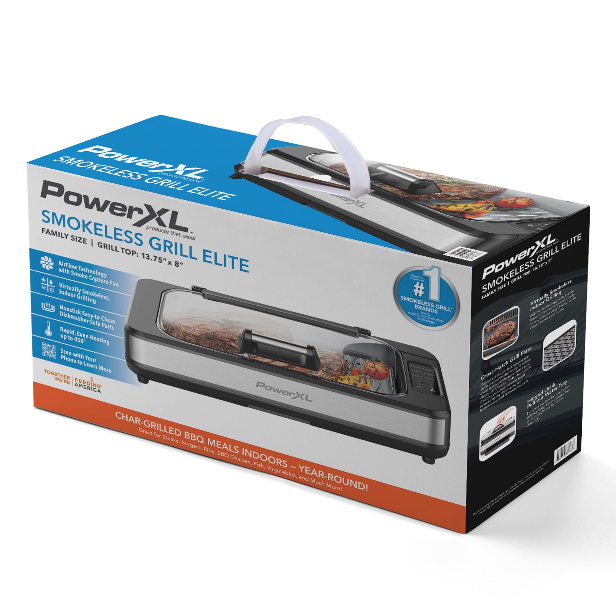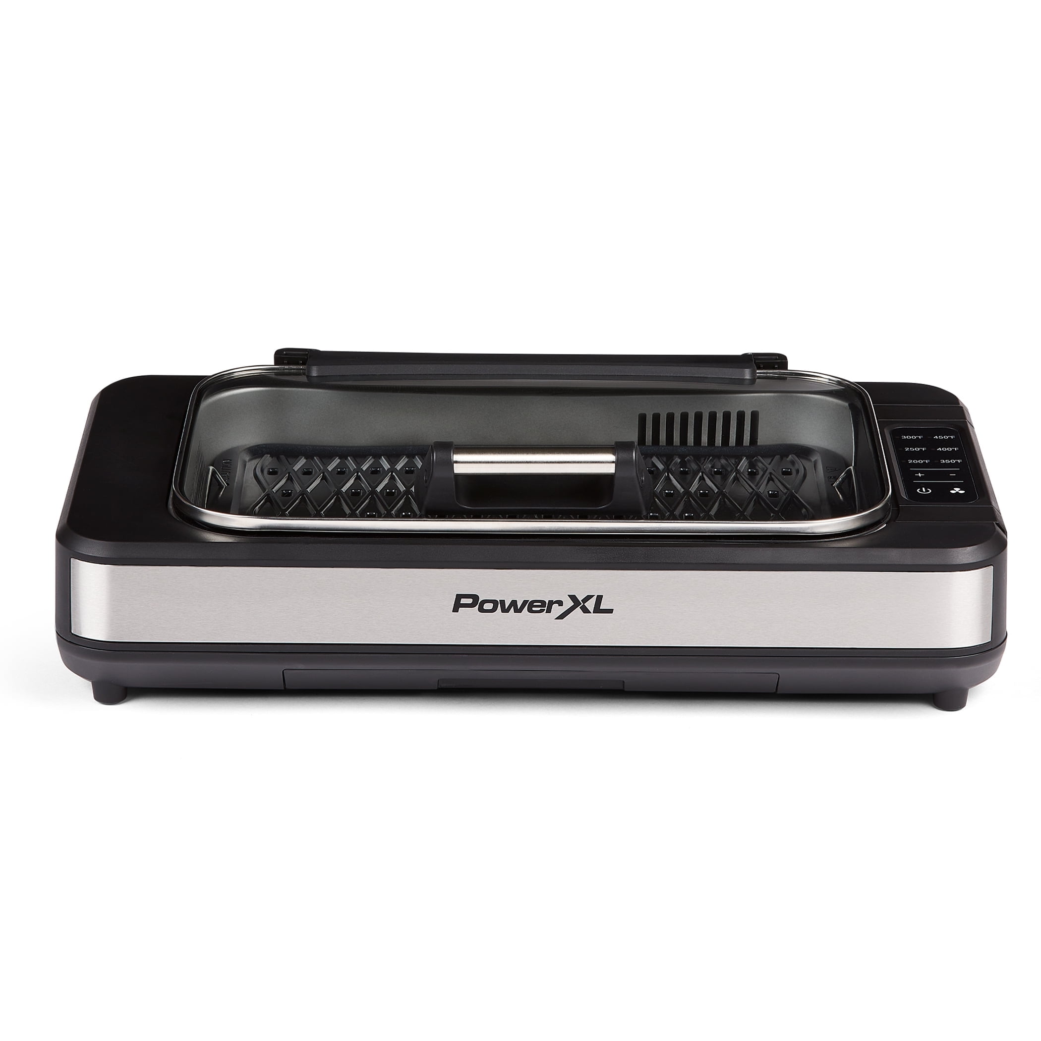 Bring outdoor char-grilled taste & flavor to your indoor countertop and day of the year. 450 degrees F die-cast grill plate locks in juices & flavor with crosshatch grill marks. Sleek, countertop-ready design; Black with a silver plate. Durable tempered glass hinged lid. Removable drip tray catches crumbs, drips, & splatters. Ceramic nonstick coating for healthier grilling using less or no oil. Dishwasher safe parts for fast, easy cleanup. Large 13.75” x 8” grilling surface accommodates family-size meals & gatherings. Smokeless technology with innovative fanning system removes smoke and keeps it out of your kitchen. 500 watts for powerful, rapid heating. Adjustable temperature control from low to high for precise, even grilling results. Easy-to-follow recipe book to help get you started.