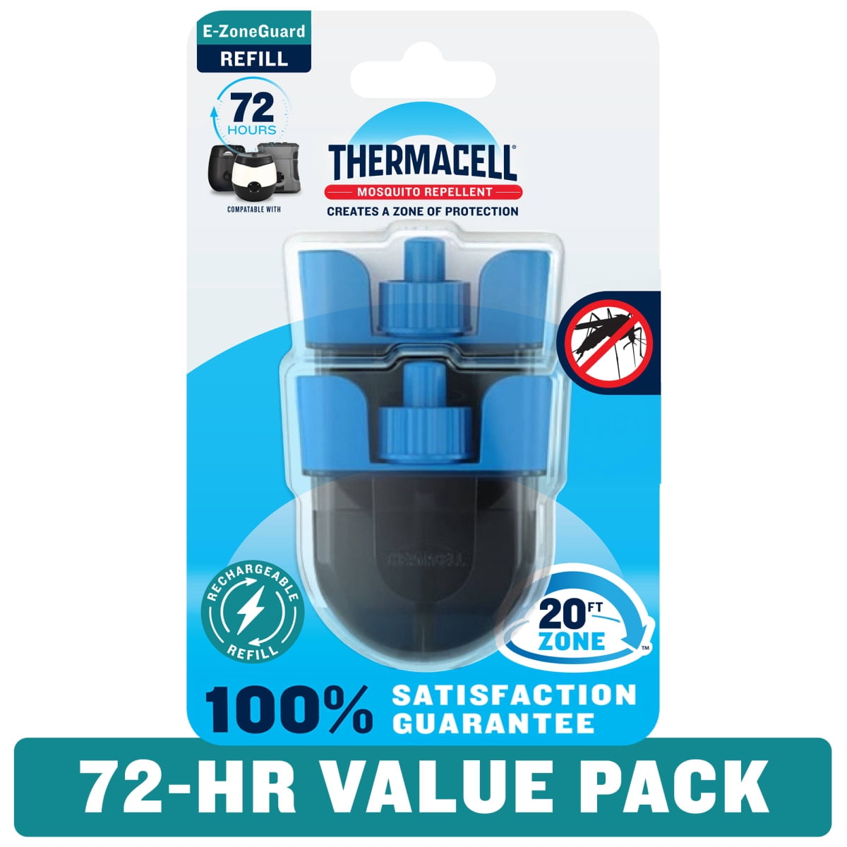 Thermacell Mosquito Repellent Rechargeable Refills create a 20-foot zone of protection against mosquitoes Heat-activated technology powered by a chargeable lithium-ion battery with 5.5 hours of continual scent-free mosquito repellent to drive away mosquitoes Lasting defense with 216 hours of mosquito repellent included Repels mosquitoes without DEET bug sprays or lotions on your skin, smoke, flames, or strong scents, like citronella, with maximum protection in 15 minutes Portable, people- and pet-friendly, and independently tested and EPA-reviewed for safety and effectiveness Repels tough mosquitoes that may transmit Encephalitis, West Nile Virus, and Zika Virus Keep enjoying outdoor activities with this sleek mosquito repeller on the porch, by the pool, while camping, at the lake, and more Backed by the Thermacell Satisfaction Guarantee -See packaging for details Includes six 36-hour scent-free repellent refills Compatible with all Thermacell Rechargeable Repellers