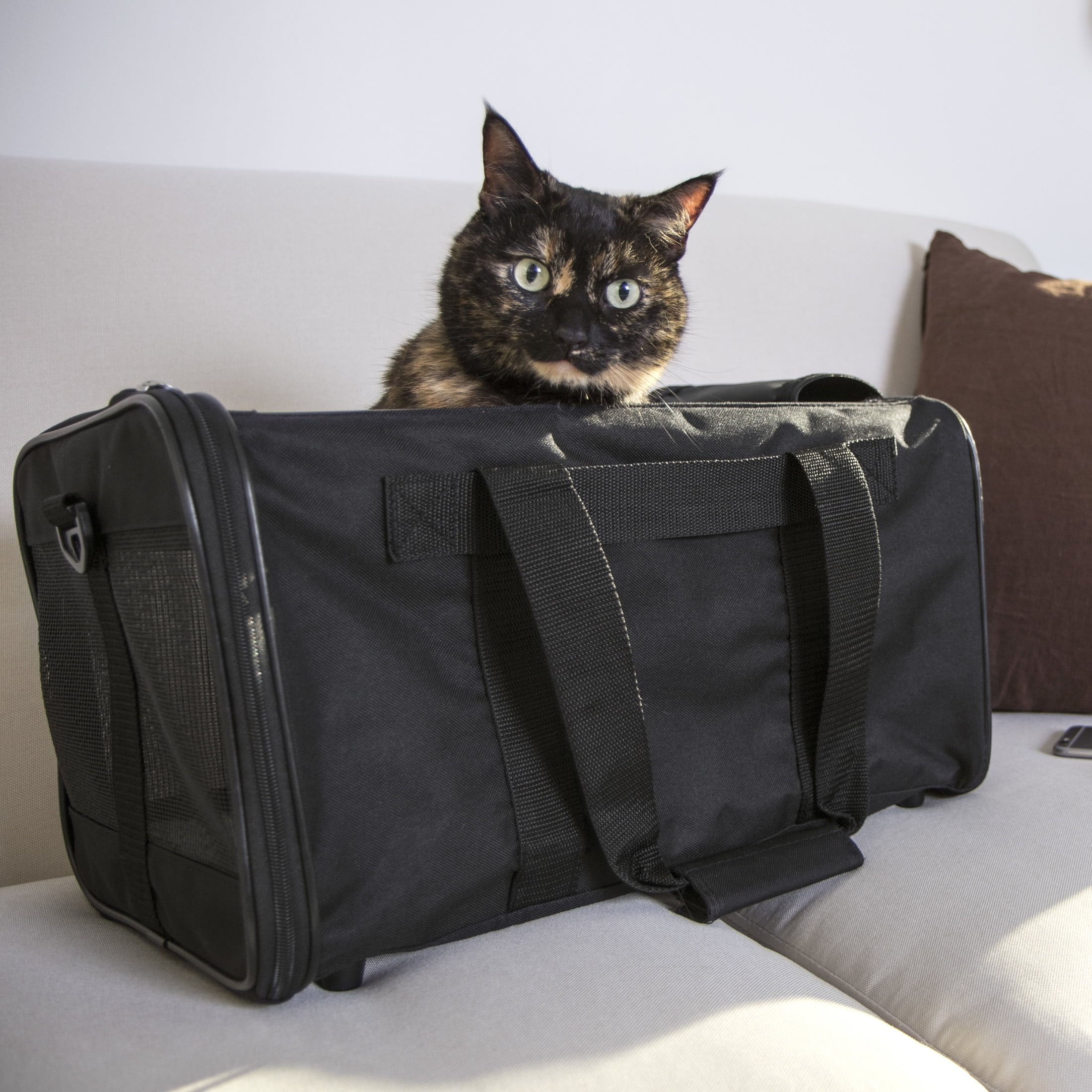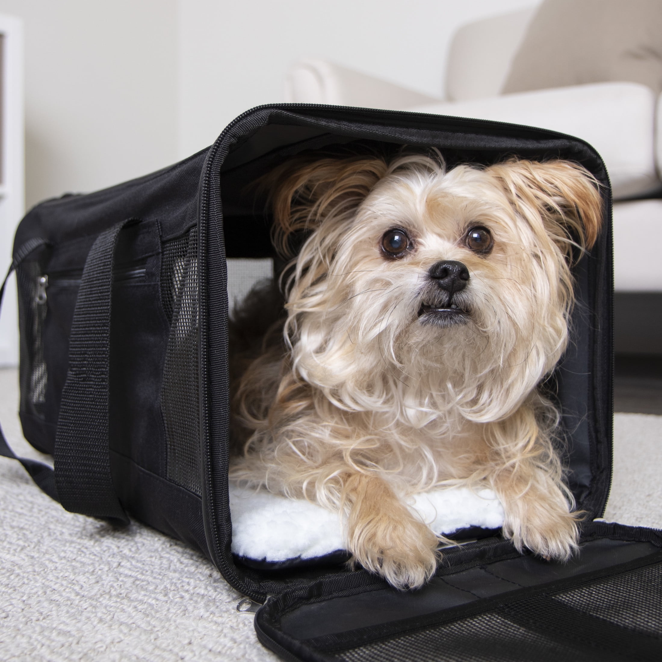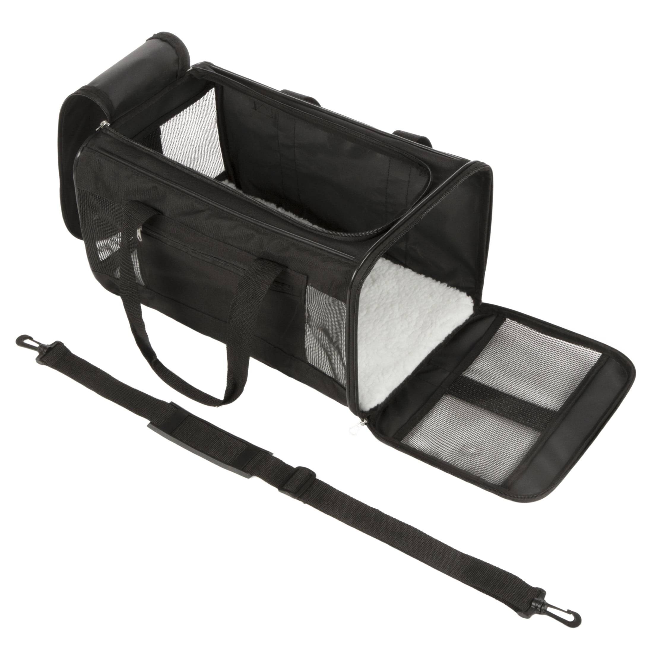 Guaranteed On-Board (GOB): Easy Explorer is part of our GOB Program; follow the instructions on our packaging to register your carrier to guarantee that your pet in their carrier is not denied boarding on Major US and Canadian Airlines based on carrier size (rules and limitations apply) Pet Carrier Medium: Carries small dogs or cats that measure 16 inches (42 cm) in length from base of tail to chest and 10 inches (25 cm) in height from floor to their back while standing and weigh up to 16 lbs (7.25 kg); for you and your pet’s safety do not exceed measurements; great for medium cats and small dog breeds, Pomeranians, chihuahuas, and yorkies Optimal Airflow: Coated mesh panels provide optimal ventilation and stand up to claws and paws; pets can look out, and you can check in on your pet without opening the carrier Luxurious Liner: Faux-lambswool liner cradles your pet as they lounge and sit; liner is conveniently removable and machine washable to help keep carrier clean between uses Versatile: Removable adjustable shoulder strap to carry over the shoulder; quick grab handles for hand carrying; security strap allows you to secure carrier on trolly suitcase handles and in cars Convenient Storage: Zippered pocket carries important travel documents and accessories such as health records, collapsible bowls, waste bags, treats, leashes Satisfaction Guaranteed: All our products are backed by our 30-day satisfaction guarantee with proof of purchase from an authorized seller; if for any reason you are unsatisfied with our product, please return to the place of purchase
