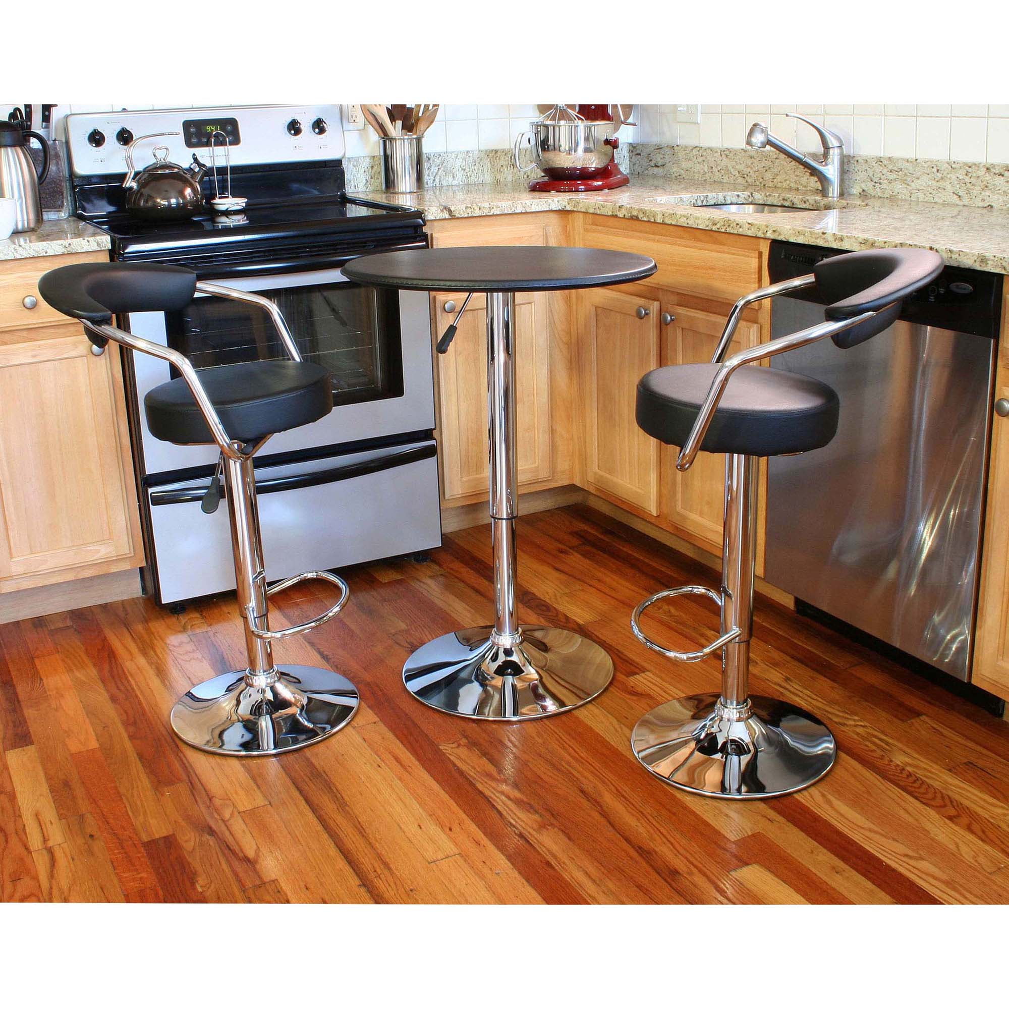 Includes one adjustable bar height table and two adjustable counter height bar stools Padded vinyl backrest and built in footrest 14 in. wide vinyl padded seat 360 degree swivel seat Polished chrome base and black vinyl seats Makes a great addition to your kitchen, bar, game room or basement Stool weight capacity: 200 lbs. each Table weight capacity: 330 lbs. Bar table specs: 25 in. diameter table top with textured vinyl covering Made from vinyl and chrome Black and silver color No assembly required Max seat back height 42.25 in. Table adjustable height from 26 in. – 36 in. 42.25 in. W x 25 in. D x 25 in. H (57 lbs.) The 3 Piece Adjustable Height Bar Set is comfortable for kids and adults to sit together. The Adjustable Height Bar Table measures 25 inches in diameter, with a black textured vinyl covering on the tabletop that makes wiping up spills easy.